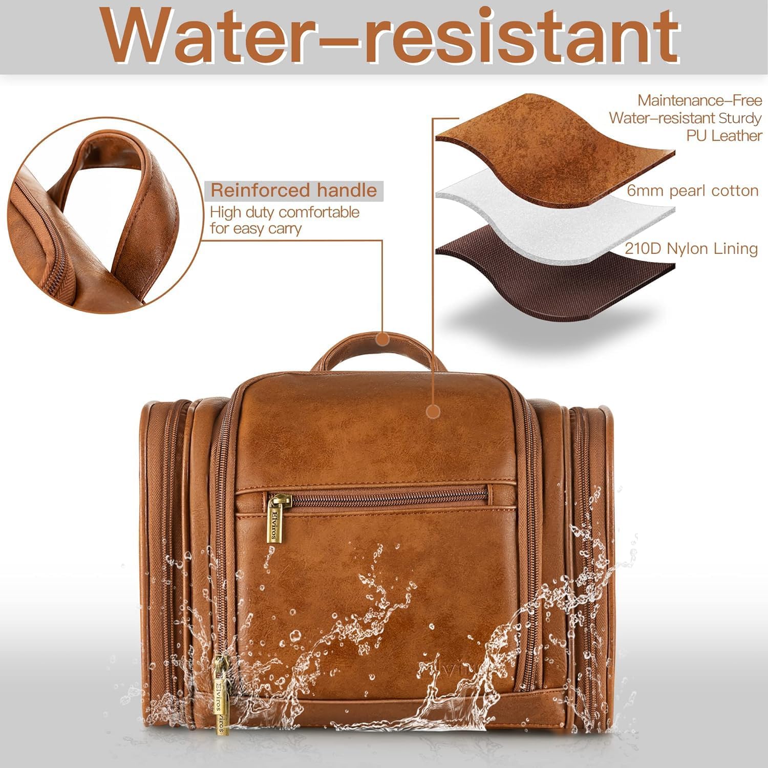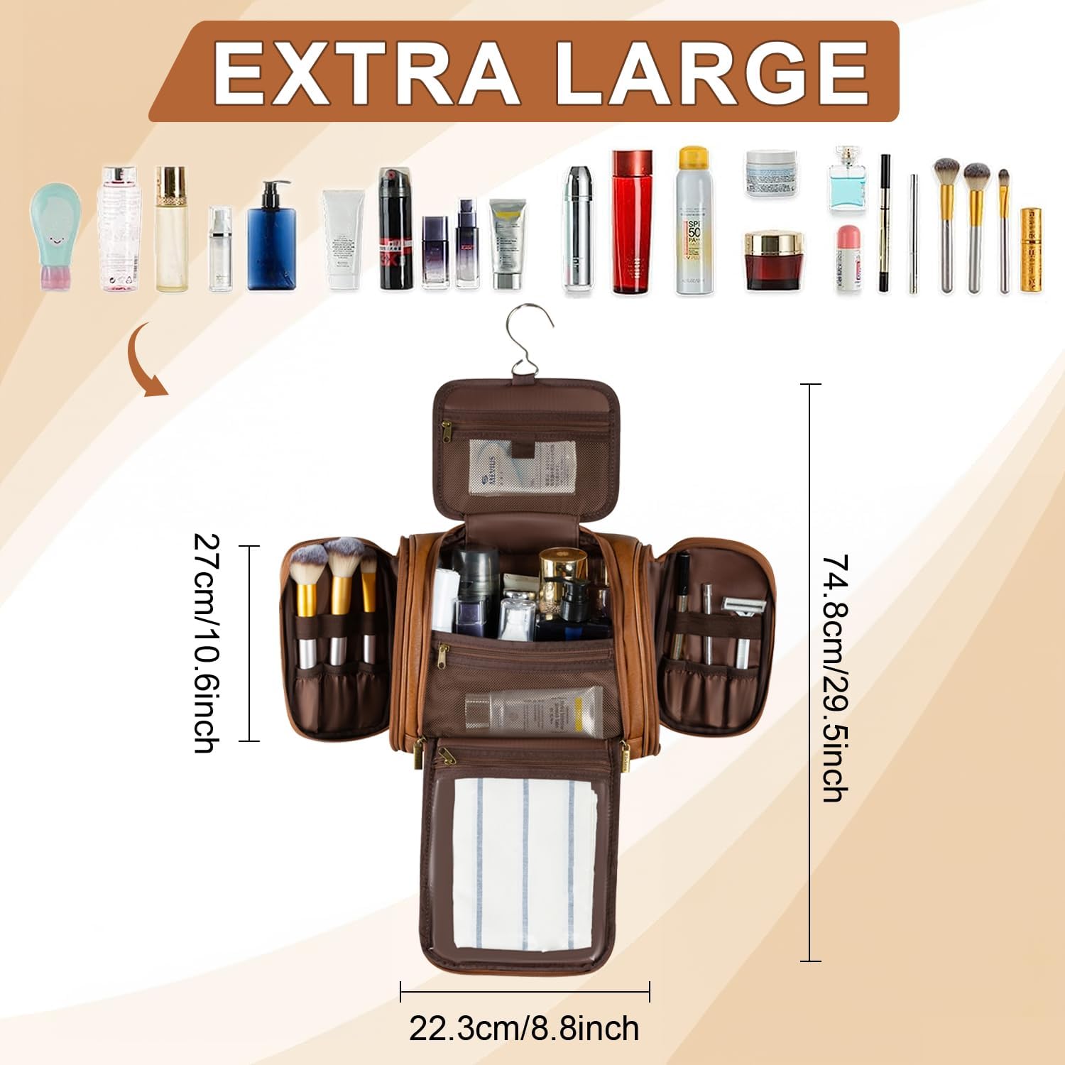 Elviros Travel Hanging Toiletry Bag for Women and Men, Large PU Leather Toiletries Organizer, Water-resistant Bathroom Shaving Kit for Cosmetics, Makeup Case (Extra Large, Brown)