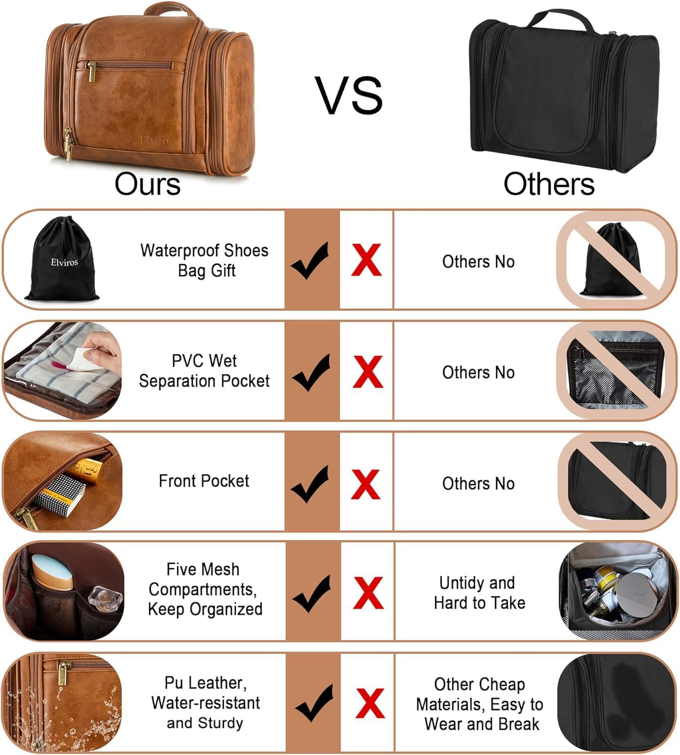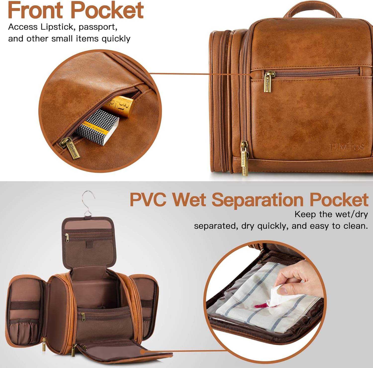 LARGE CAPACITY TOILETRY TRAVELING BAG: Size: 32.5cm * 27cm * 13.5cm (L * W * H) / 12.8 * 10.6 * 5.3 inch (L * W * H). Elviros travel toiletry bag holds all your essentials. The middle main compartments with mesh pouches and elastic bands that can hold cosmetic bottles upright. Both sides are designed for storing makeup brushes, toothpaste, eyeshadow palette and more to keep everything well organizednSTURDY WATER-RESISTANT MATERIAL: The toiletry dopp kit made of premium water-resistant PU leather fabric with supple touch; 5mm well-padded design to keep full bag’s shape and provide great protection. Sturdy stitching and heavy-duty material can also be implemented for long-lasting performancenTHOUGHTFUL DETAILED DESIGN: The front water-resistant PVC compartment is visible for easy access, keeping wet and dry items separated. The top PU leather handle provides a sturdy way to carry the bag, and the two-zipper head design makes it easy to get items in and out. Sturdy metal hooks allow the bag to be hung on the wall without taking up counter spacenWATERPROOF DRAWSTRING SHOES BAG: Comes with a drawstring waterproof storage bag that can be used to organize shoes and dirty clothes, making it easy to carry. It can also serve as a makeup bag, toiletry bag, travel bag, lingerie bag, wrapping bag, men’s gym bag, and for other assorted uses. The completely waterproof fabric ensures everything stays drynMULTIPLE USE FOR TRAVEL: This hanging toiletry bag can be used as a portable makeup organizer, bathroom bag, or storage bag for daily use, hotel stays, travel, gym showers, and outdoor activities. Definitely an ideal travel kit for yourself, your family and friends