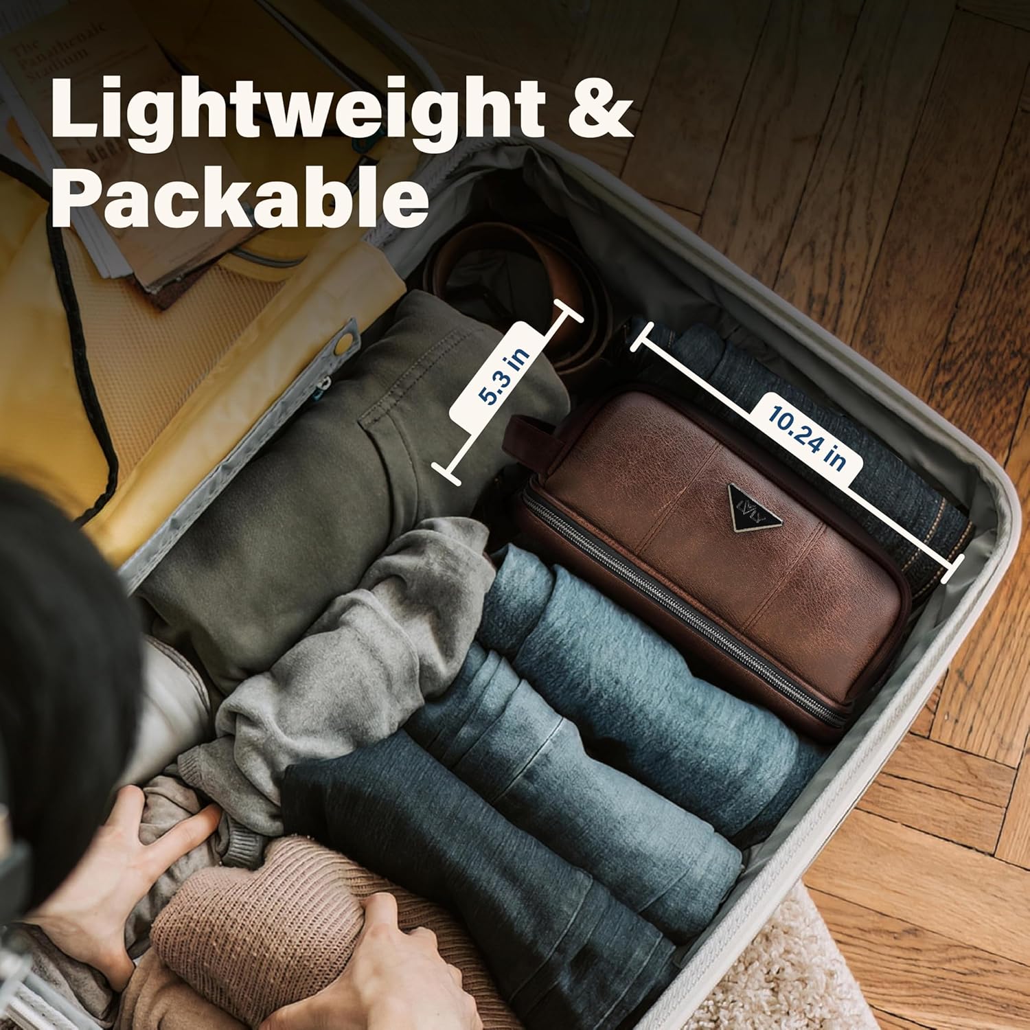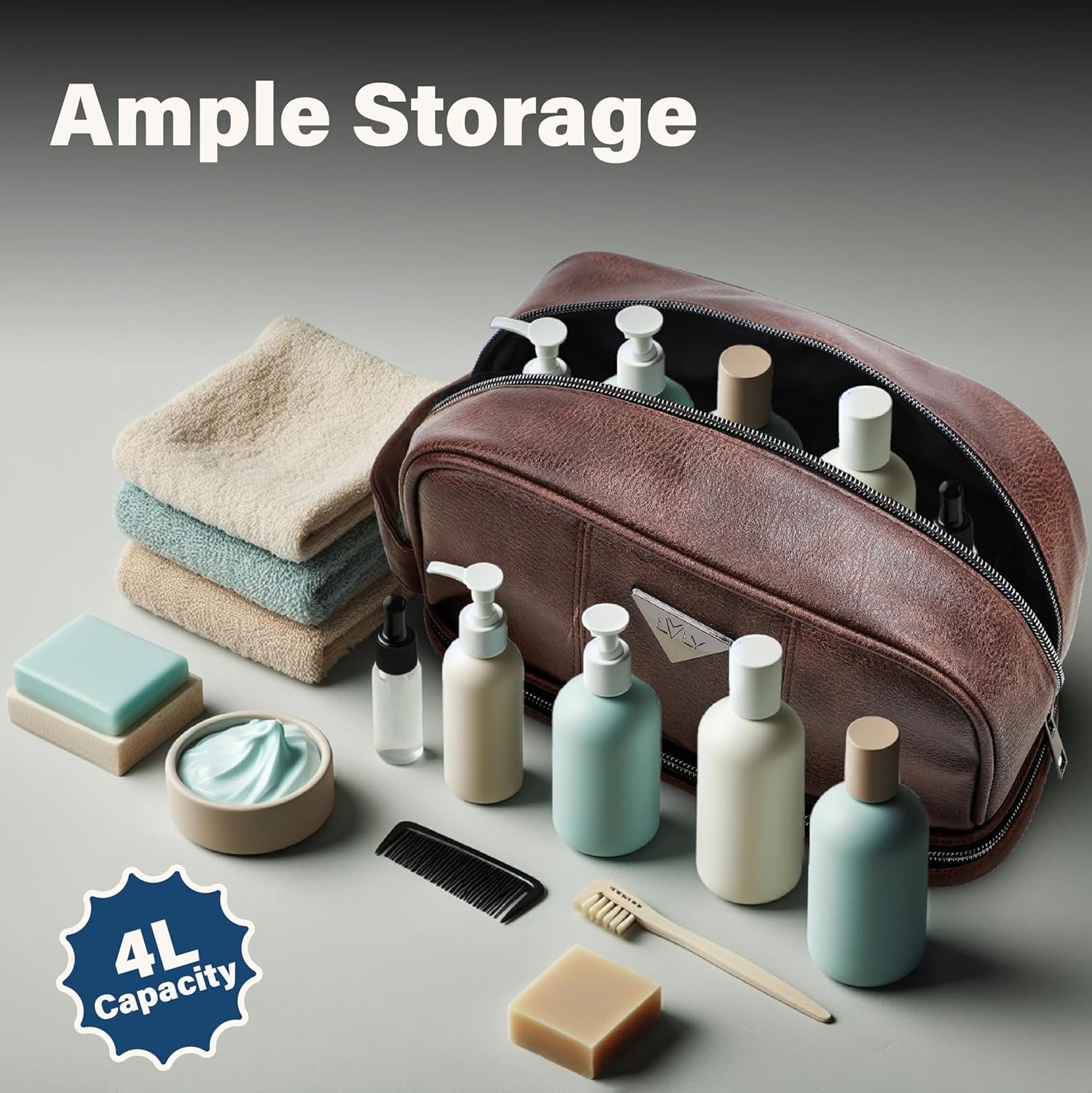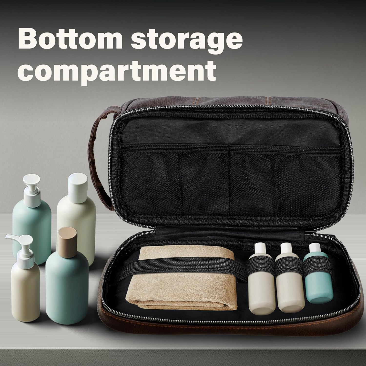 HIGH-QUALITY & SOFT DURABLE MATERIAL: This exceptional leather toiletry travel bag for men is made of attractive PU Leather (soft synthetic leather), which is known for its lightweight yet durable qualities, the perfect combination for travelingnEXTRA POCKETS AND COMPARTMENTS: So much utility! The main compartment of the travel bathroom bag holds larger items and has 2 mesh pockets for your smaller toiletries, then there is a bottom storage compartment with elastic straps for toothbrushes cosmetics and liquid travel containers, and a front zipper pocket that provides even more organization.nMADE FOR TRAVEL AND PORTABILITY: Designed with the traveler in mind, a side handle is included on your leather wash bag to ensure that carrying your bag while traveling is made easy. The toiletry bag as a whole measures 10 L x 5.5 W x 6.5 H in Inches / 25.4 L x 13.9 W x 16.5 H in centimeters, with a volume of 3.5 Liters.nCONVENIENT MULTI-USE BAG: Whether you are travelling for business or personal reasons, this travel toiletry bag will certainly meet your needs. It was designed for both men and women, and is an extremely versatile travel bag that can be used as a traditional toiletry bag, makeup or shaving kit case, a safe place to store your healthcare items while traveling, or for long flights, it can be used as a carry-on airline bag to store needed in-flight elements.nemissary 12 Month Protection: If anything were to happen to your bag in first 12 months, contact us through Amazon’s messaging system and we will replace your bag or refund your purchase. Your satisfaction is our priority.