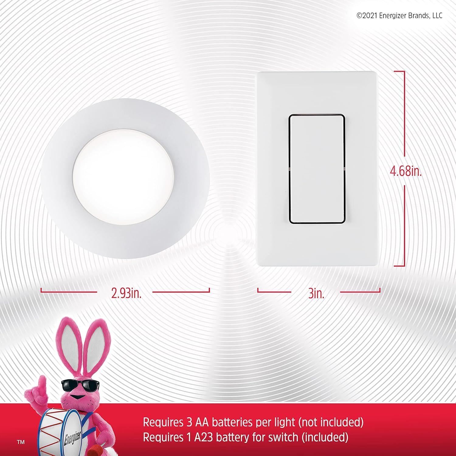 About this itemnLED Puck Light Energy-efficient LED light provides fully diffused bright white light for any room in your home or for on-the-go illuminationnWireless Control Conveniently control the puck light using the mountable ON/OFF switchcompatible with all lights of the same model number (58822) within a 50-foot rangenEasy Install Use the included double-sided tape or screws for a hassle-free installation everything comes in the box and no complicated wiring or expensive electrician is needednBattery Operated Runs on 3 AA batteries (not included) and automatically deactivates after 60 minutes to conserve battery lifenPeace of Mind This Energizer product is created to last, energy efficient and proudly designed in the USAn See more product details
