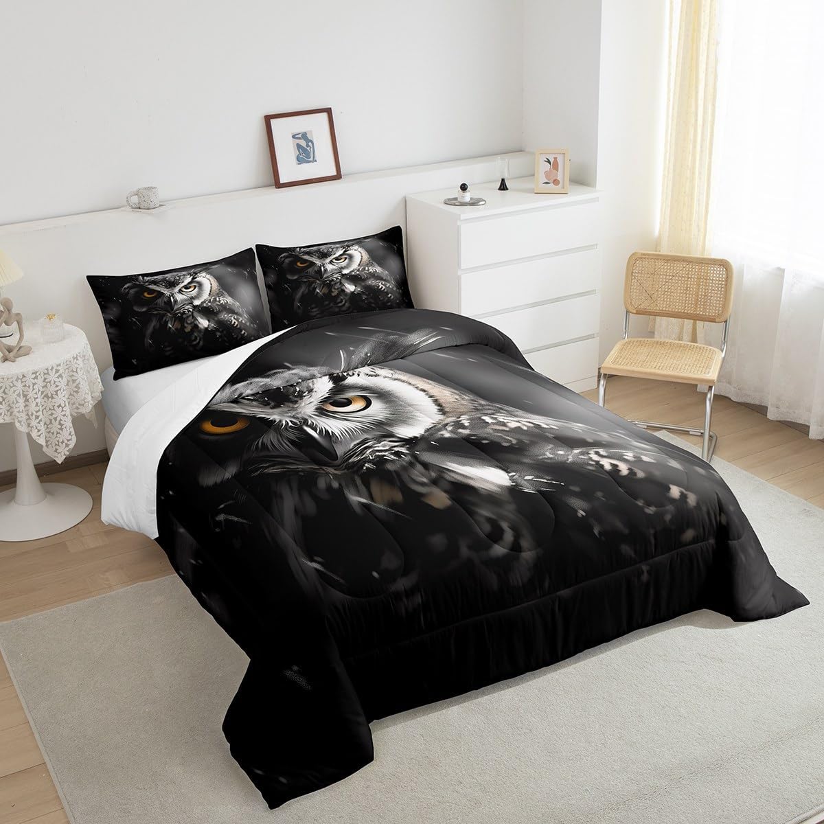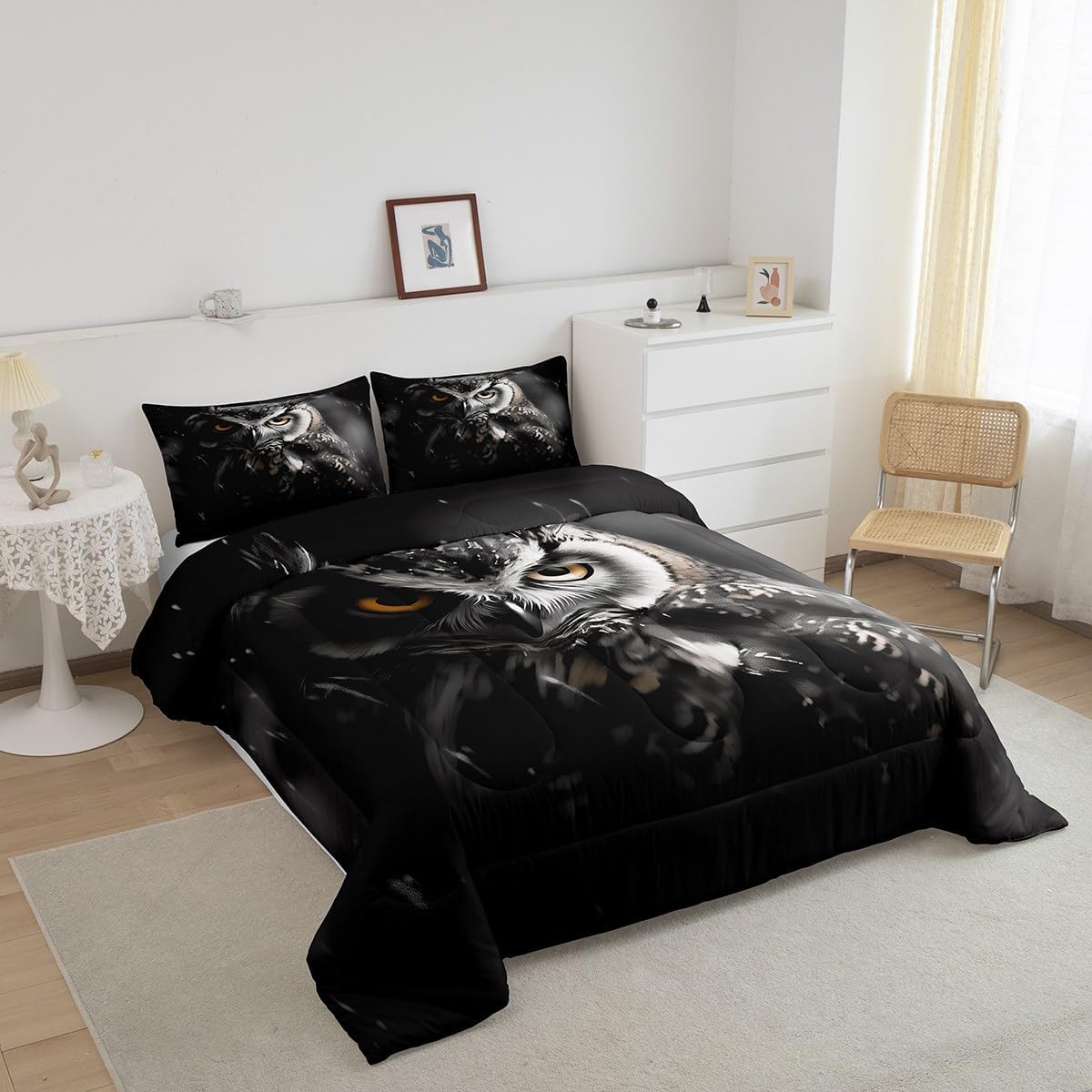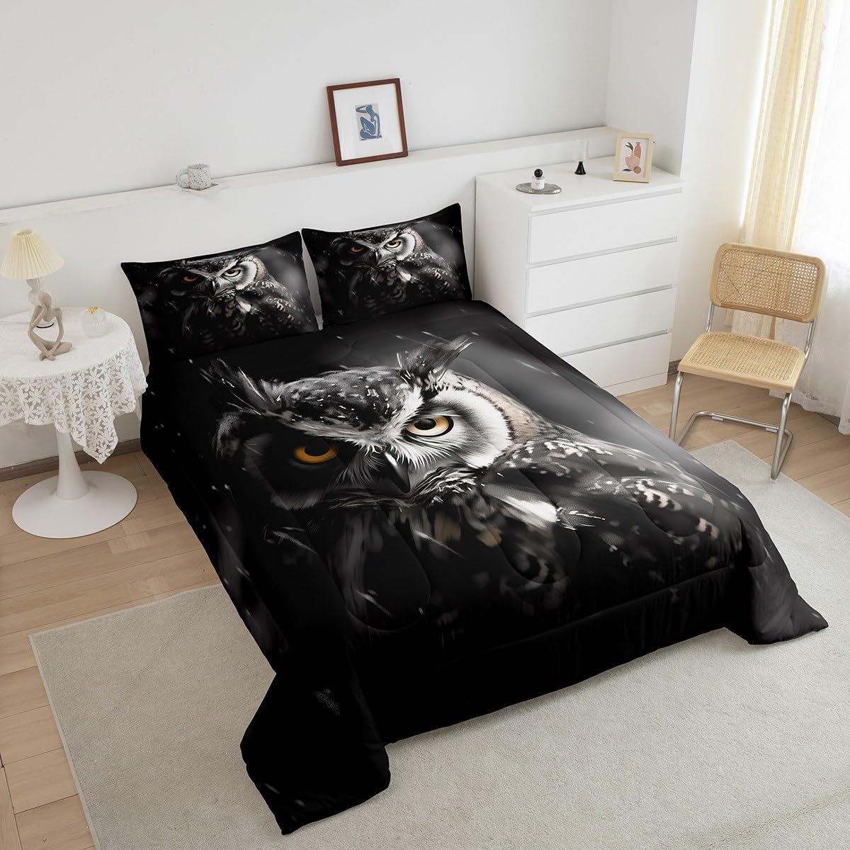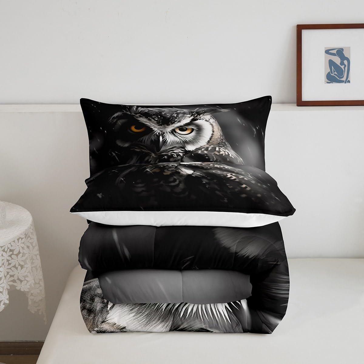 Erosebridal 3D Owl Twin Bedding Sets Black and Grey Comforter Set Twin, Wild Animal Bedding Comforter Sets Cute Bird Duvet Insert, Woodland Wildlife Down Comforter Animal Theme Black Room Decor 2pcs