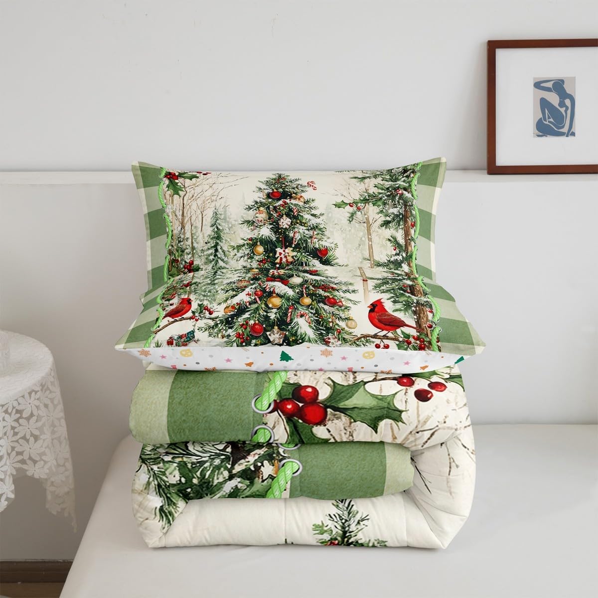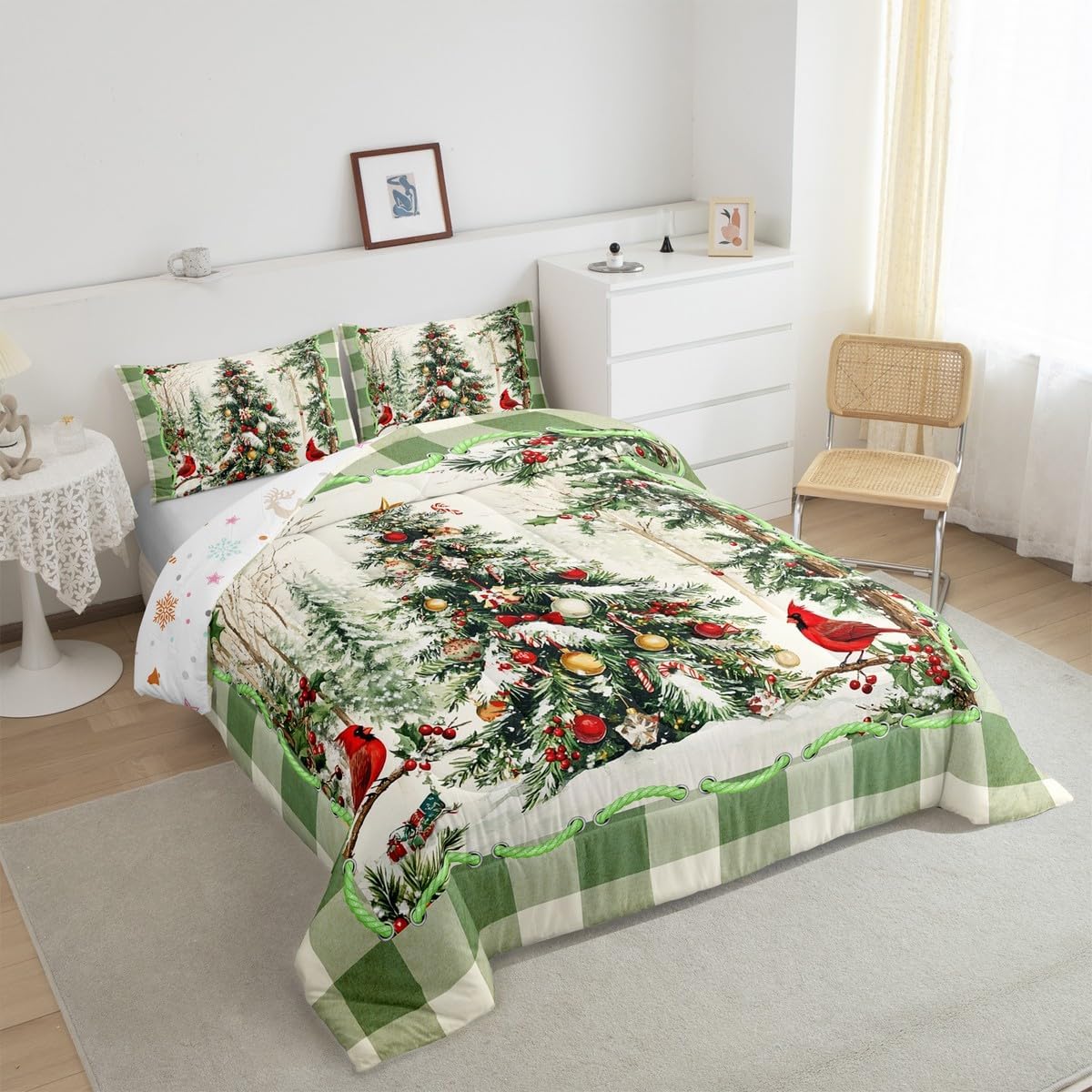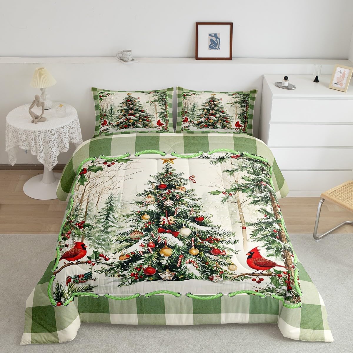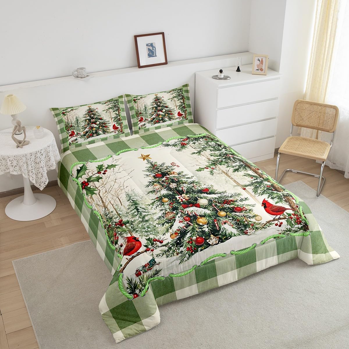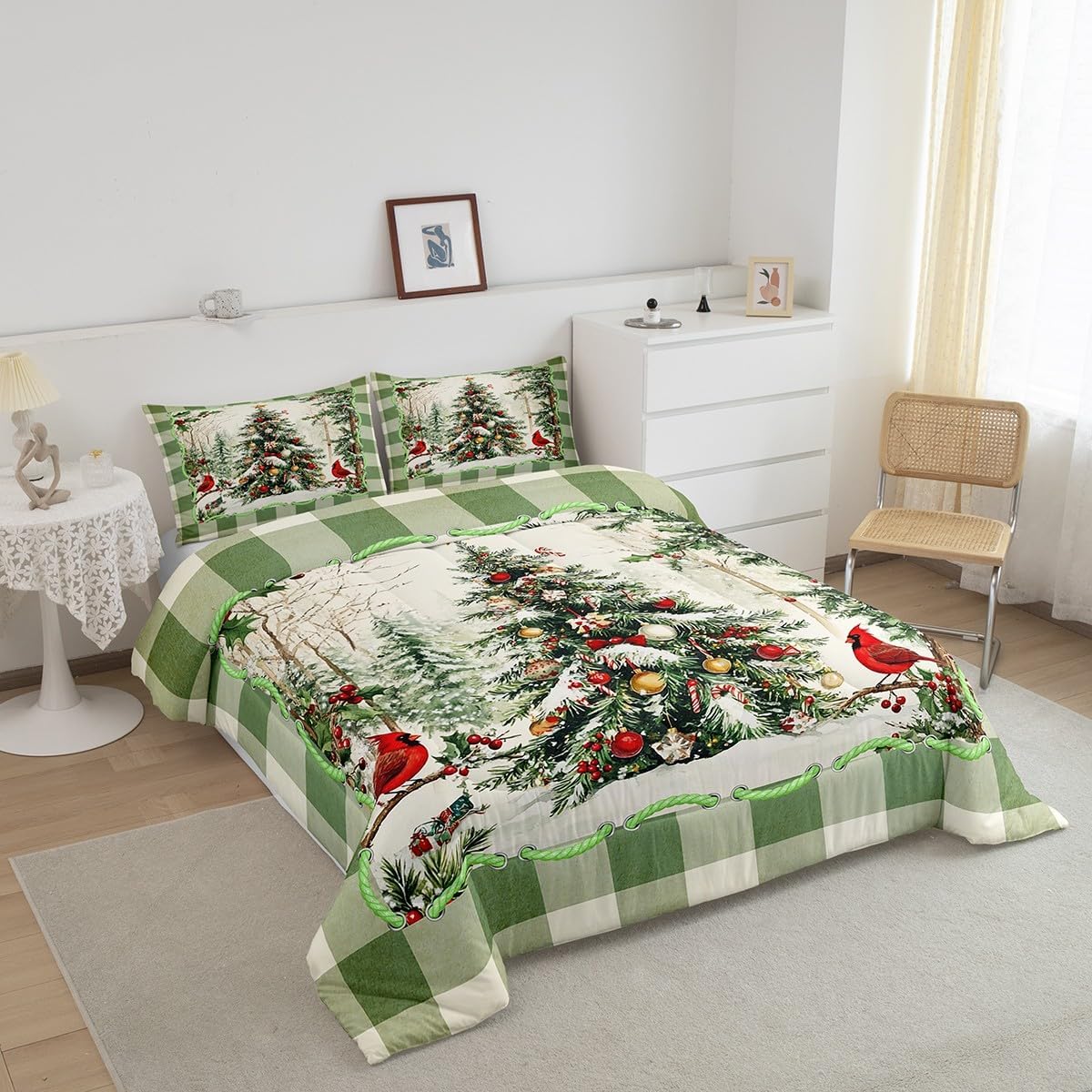 Erosebridal Christmas Holiday Comforter Set Full,Xmas Tree Bedding Comforter Sets Winter Christmas Red Cardinal Bedding Set for Kids Adults,Green Checkered Grids Quilt Duvet Christmas Home Decor