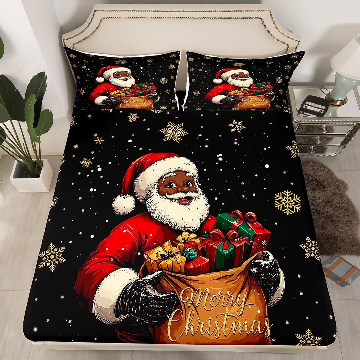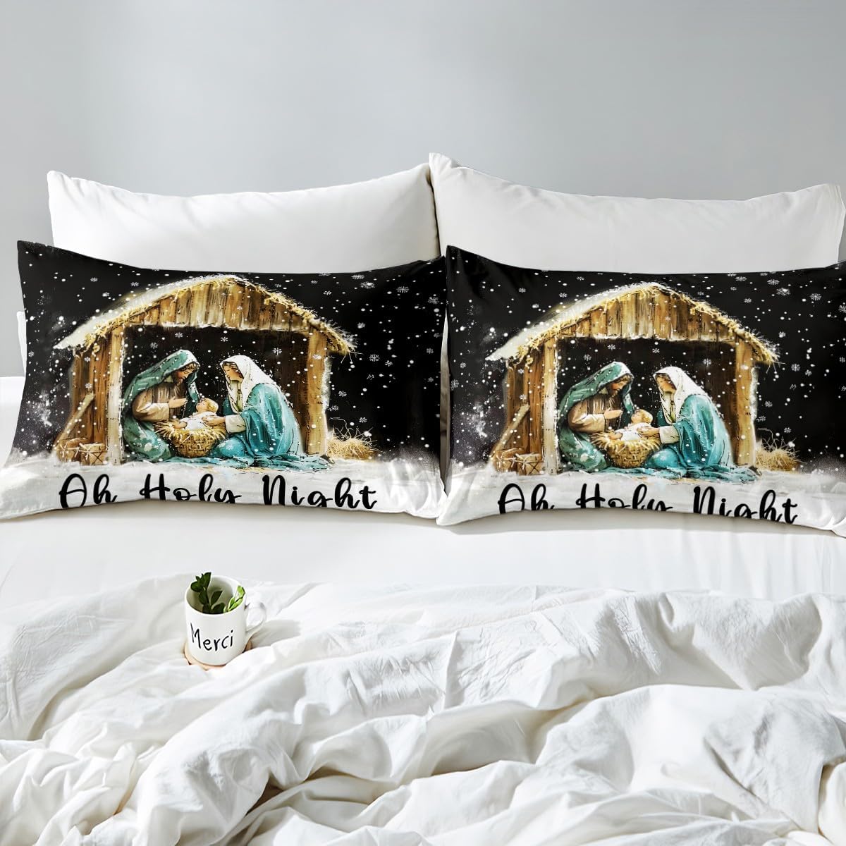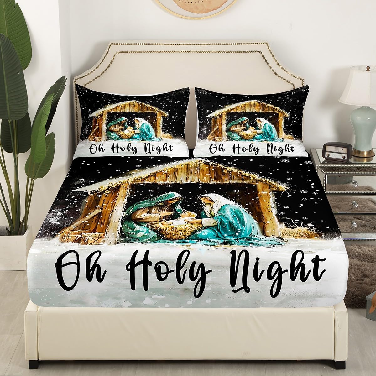 Erosebridal Holy Night Bedding Set Nativity Scene Fitted Sheet, Merry Christmas Bed Sheets Christmas Winter Holiday Festival Themed Sheets Queen Size 3Pcs, No Top Sheet