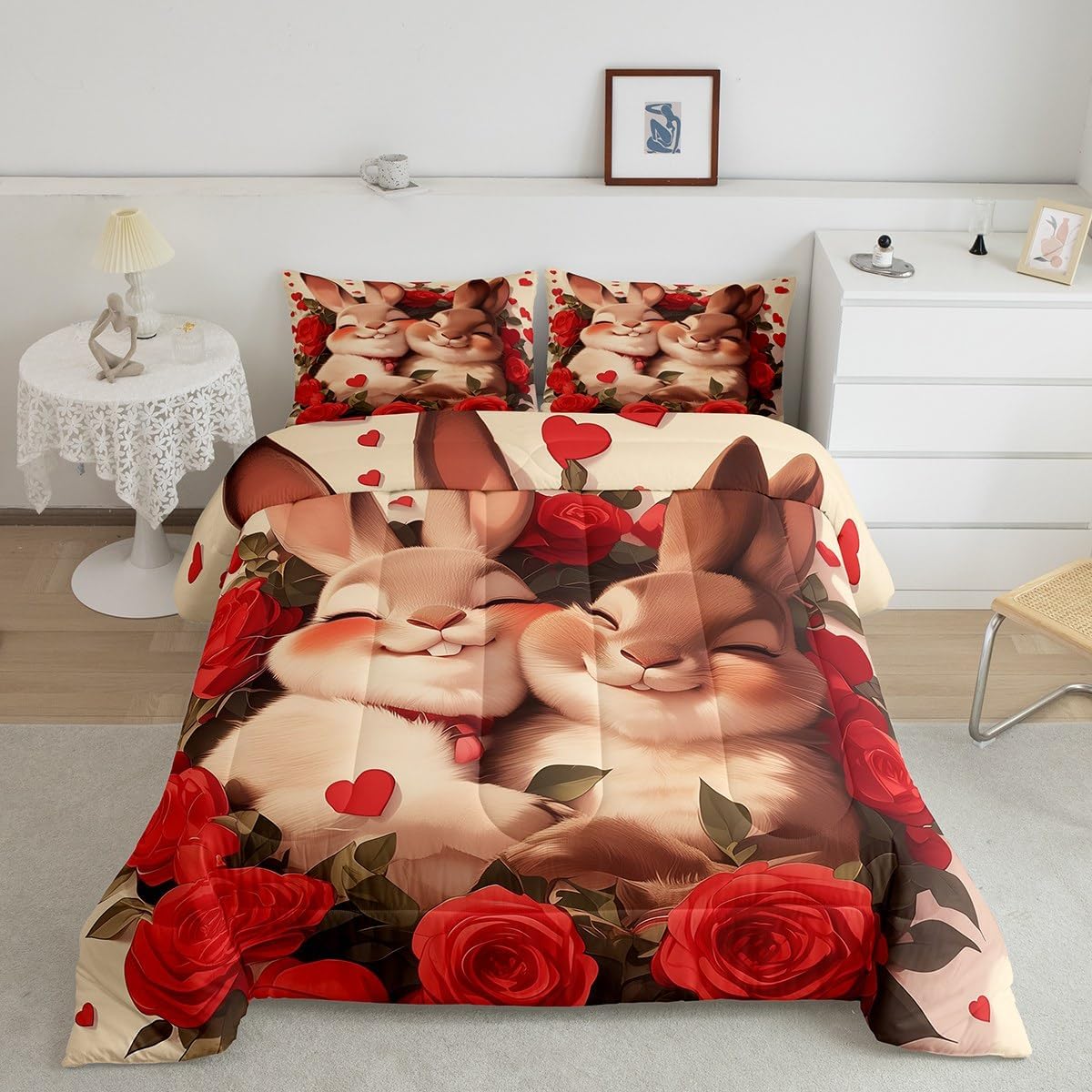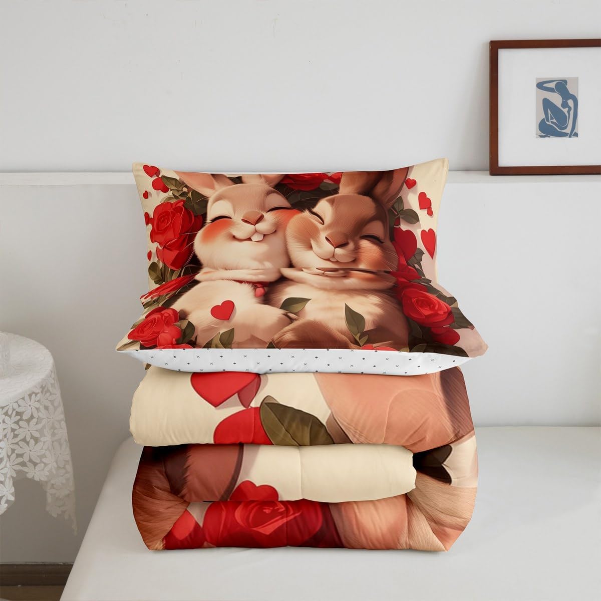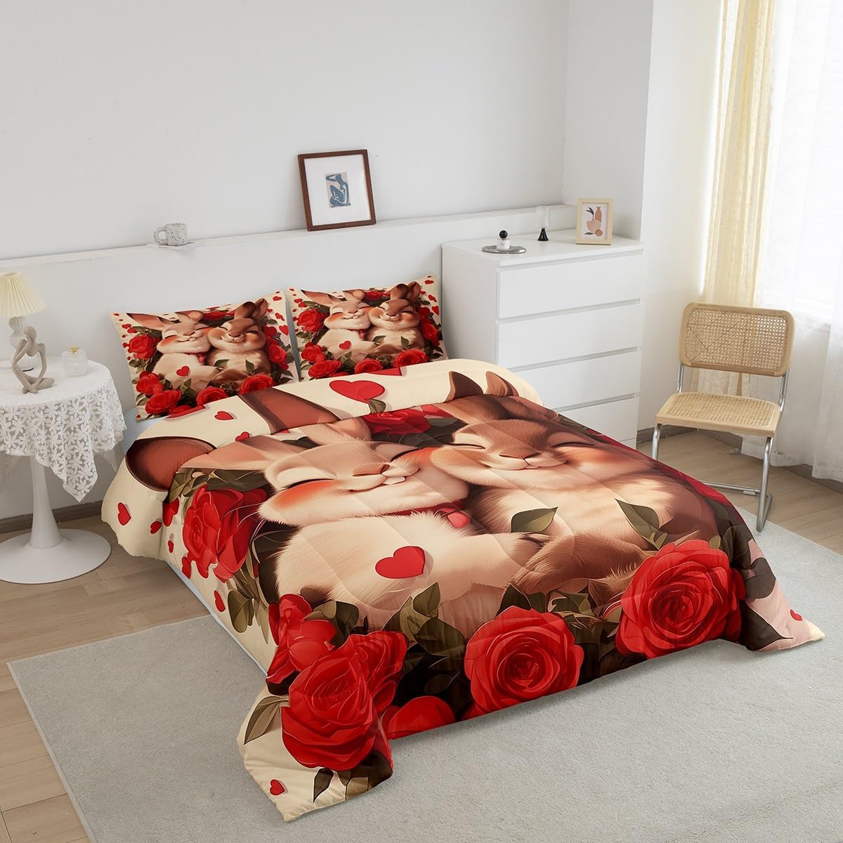 Erosebridal Love Rabbit Down Comforter Couple Rose Lover Comforter Set Romantic Love Themed Twin Bedding Set Red Floral Valentine’s Day Duvet Insert Couple Gifts Quilt Set for Woman Girls Men