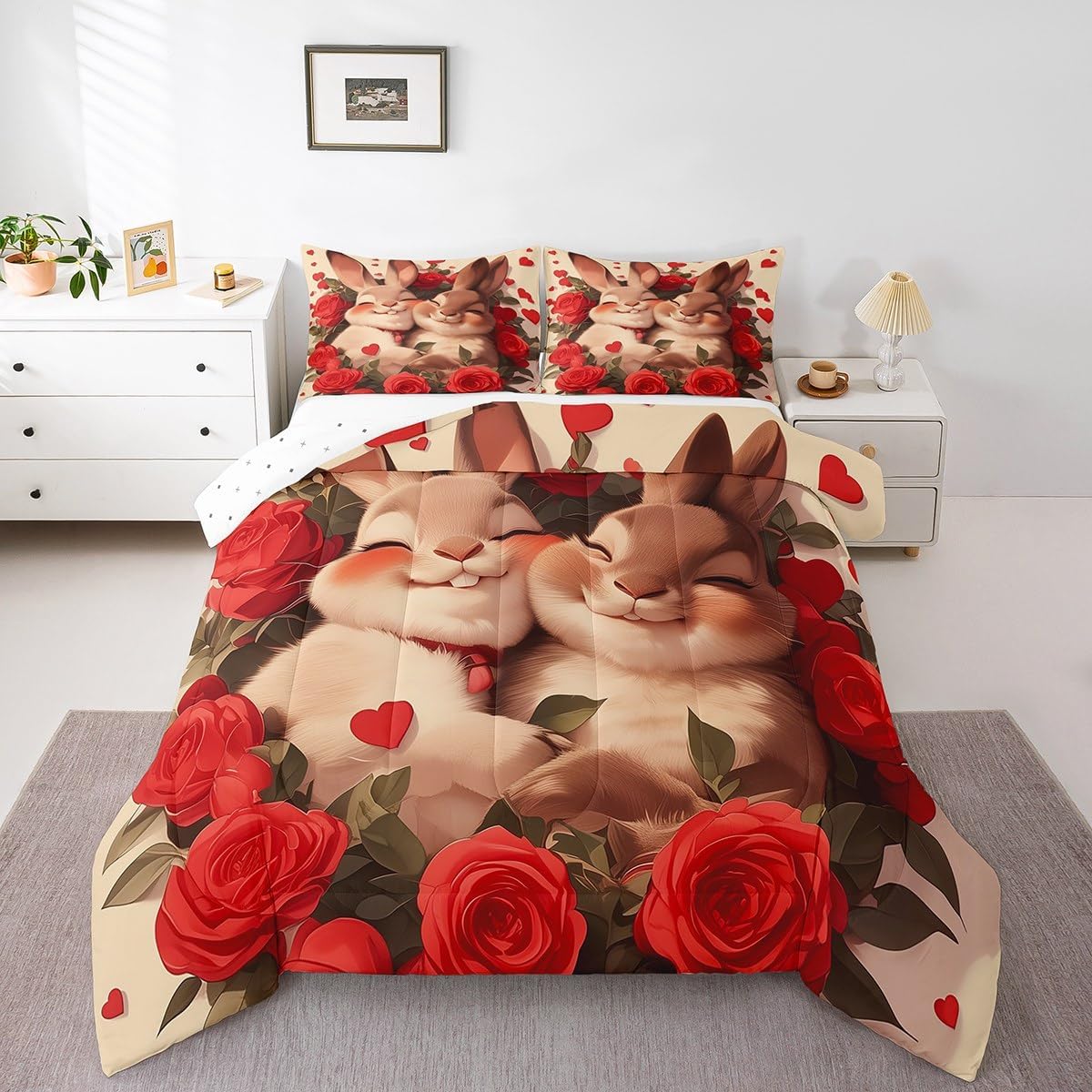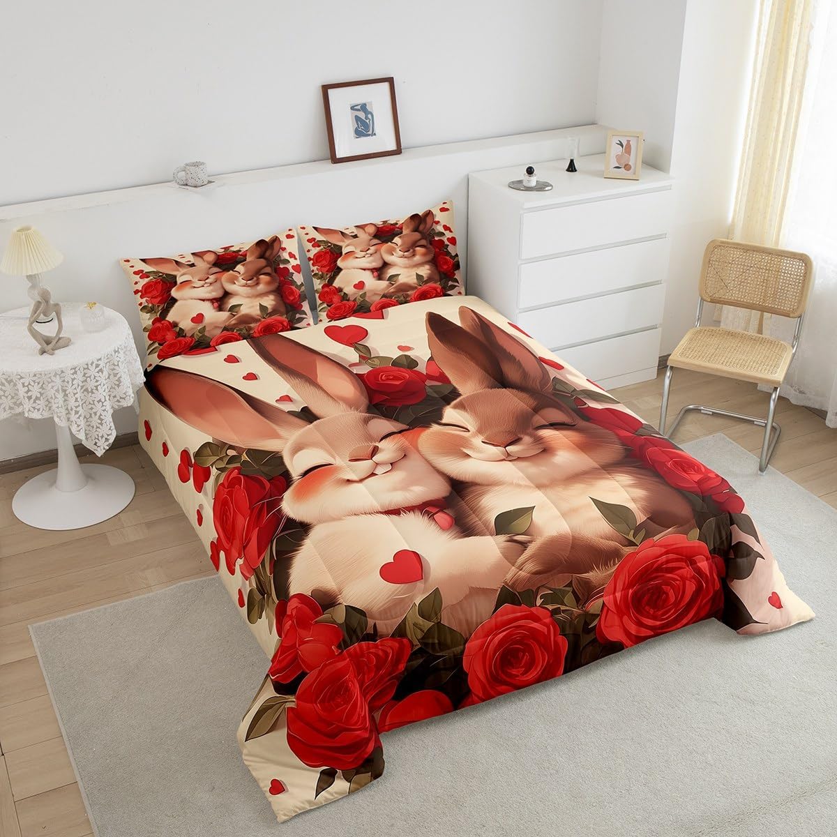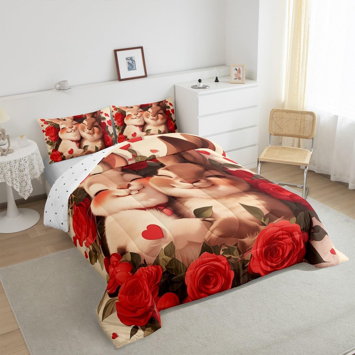 Erosebridal Love Rabbit Down Comforter Couple Rose Lover Comforter Set Romantic Love Themed Twin Bedding Set Red Floral Valentine’s Day Duvet Insert Couple Gifts Quilt Set for Woman Girls Men
