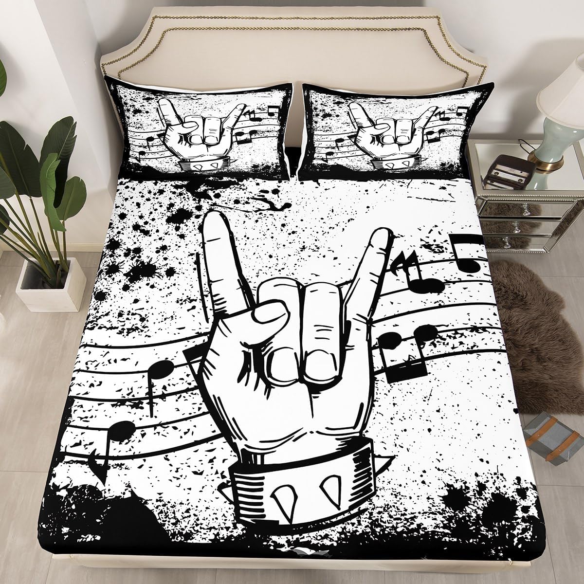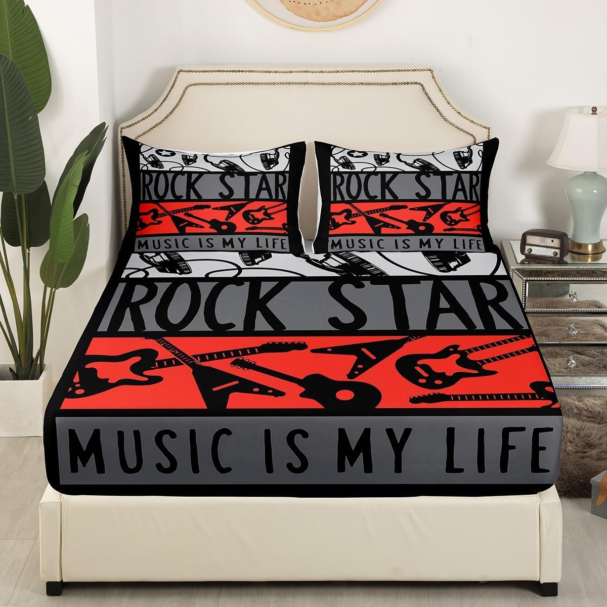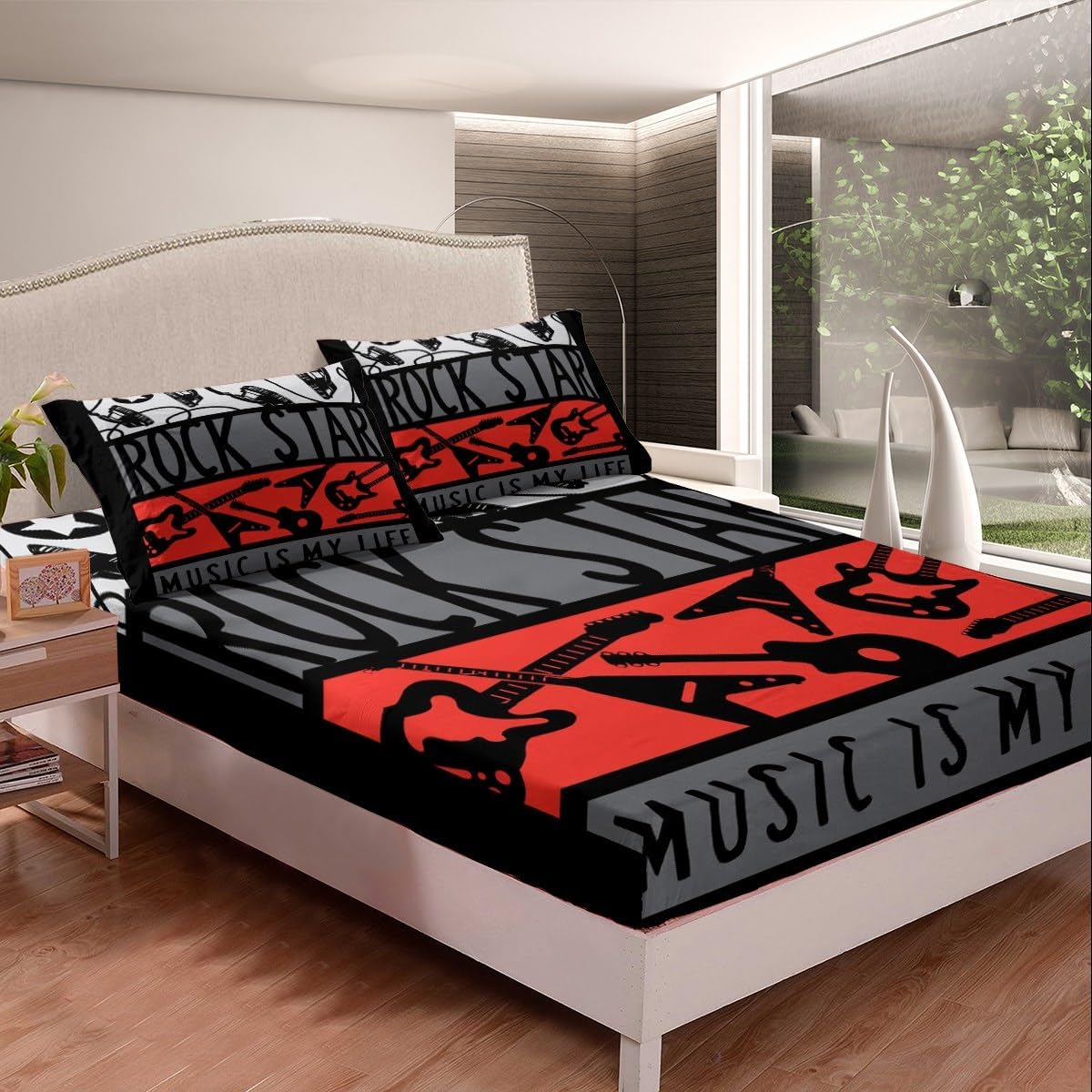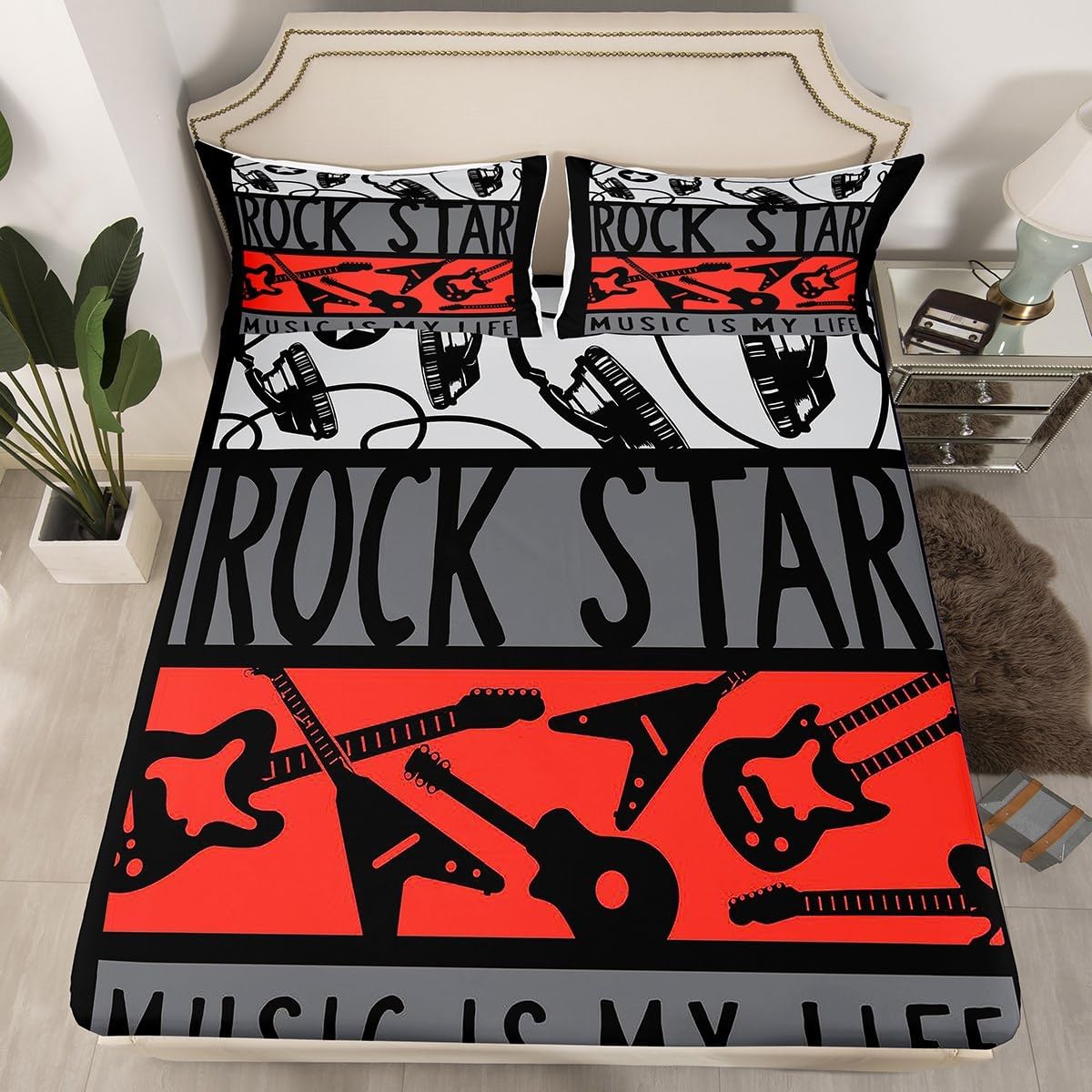 Erosebridal Rock Music Full Sheets Electric Guitar Bed Sheets, Musical Theme Fitted Sheet Punk Rock Popstar Bed Set, Headset Headphone Bedding Black Red Grey Lightweight (Deep Pocket)
