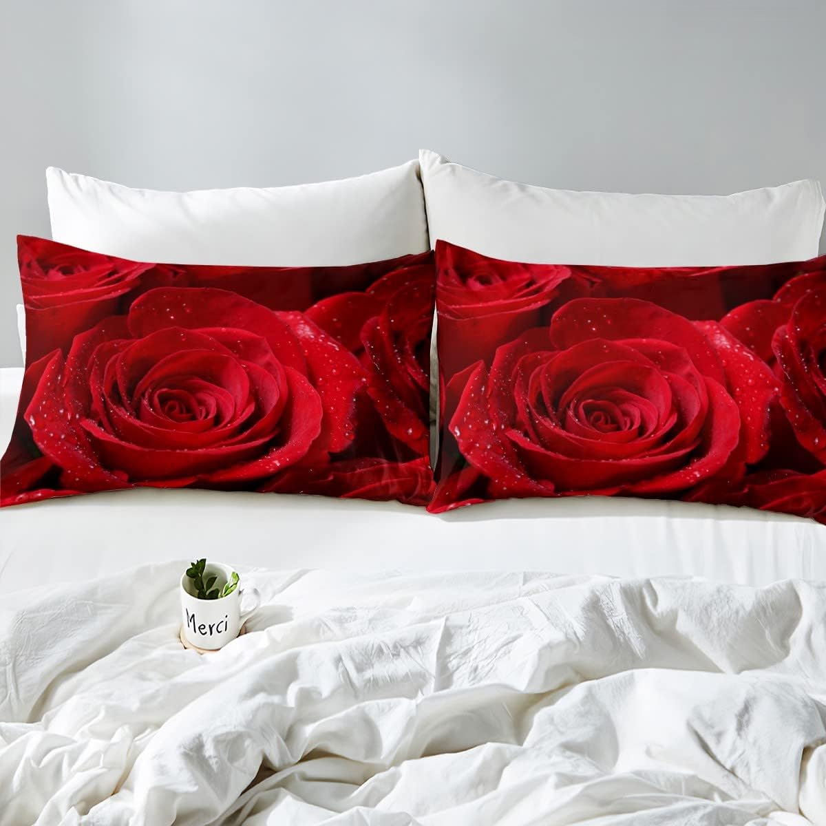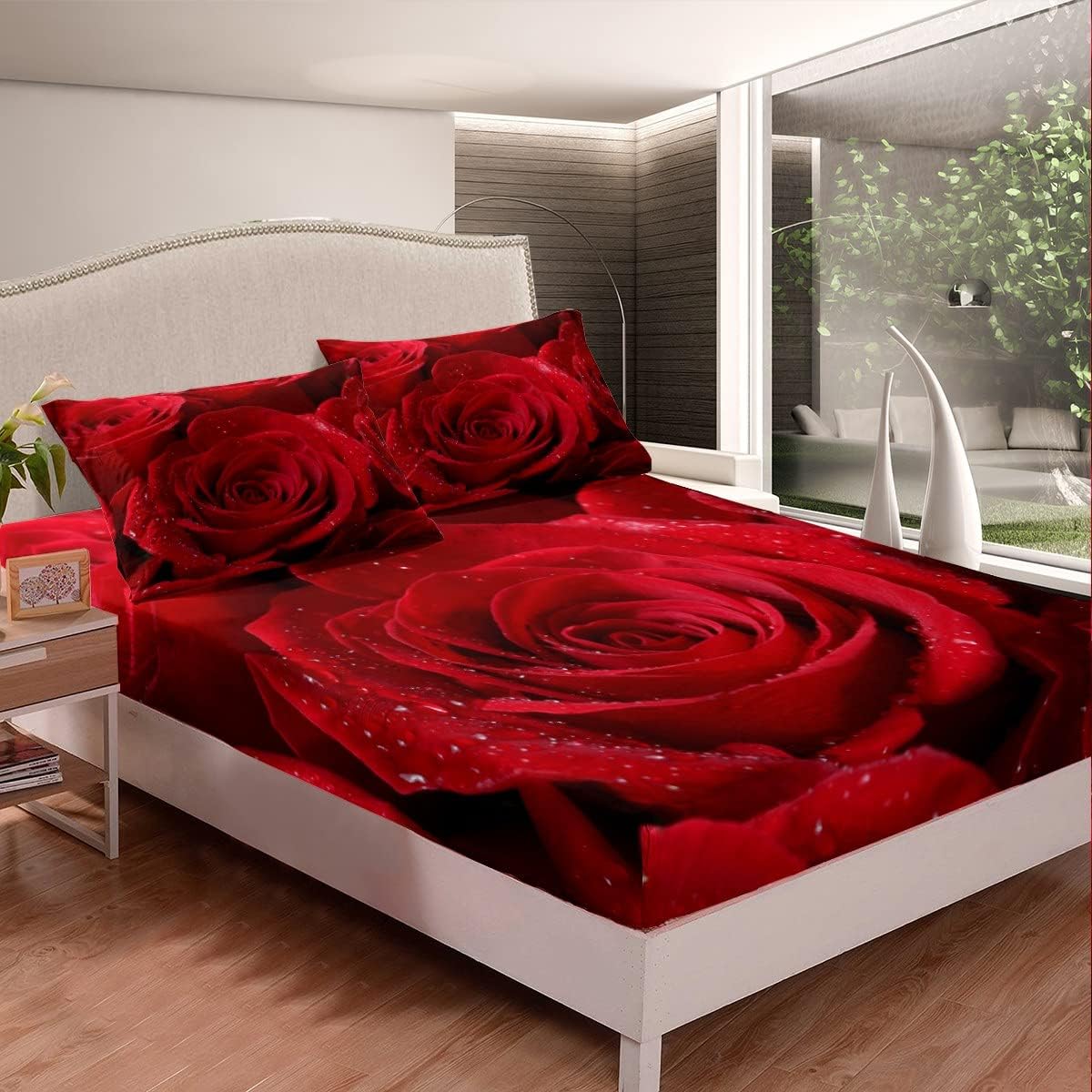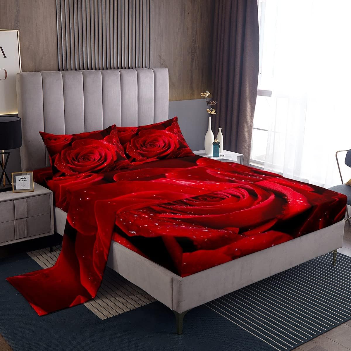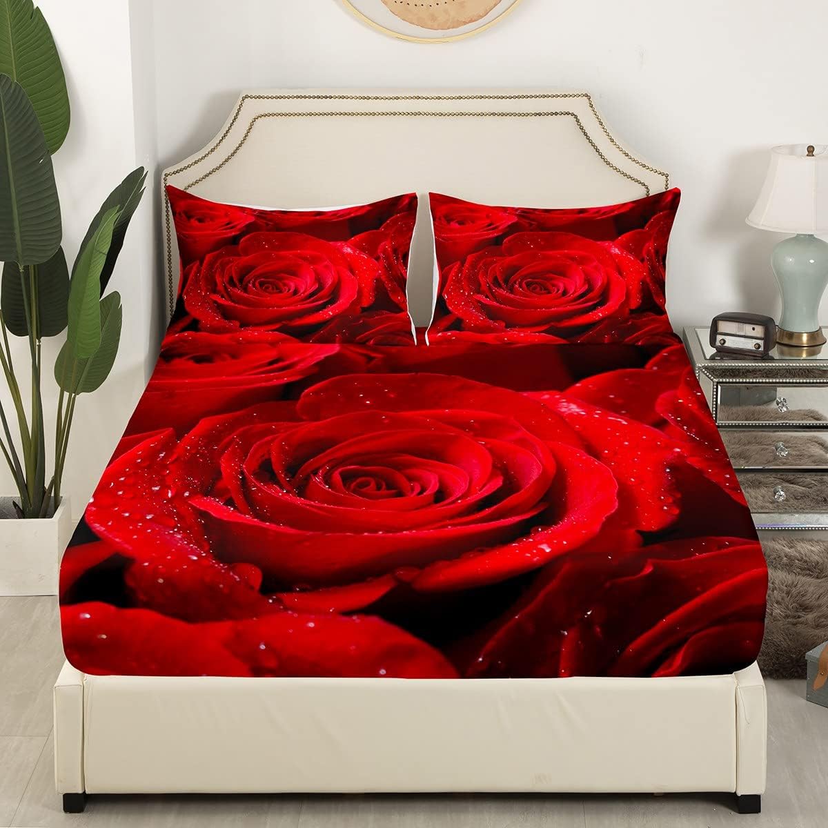 Erosebridal Rose Bed Sheets for Couples Lover,Romantic Red Rose Sheet Set,Valentine’s Day Romantic Flower Bedding Set Queen,Botancial Floral Fitted Sheet + Flat Sheet + 2 Pillow Shams Valentine Decor