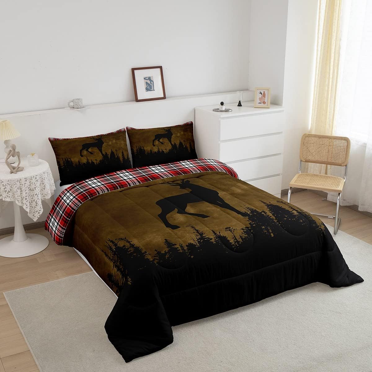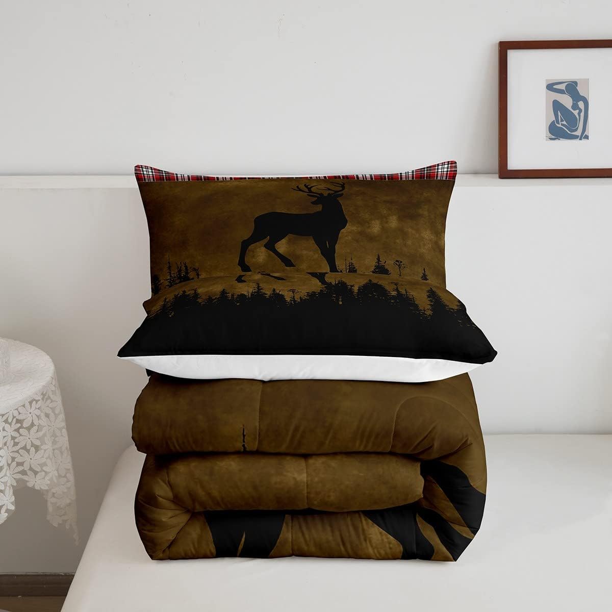 Erosebridal Rustic Farmhouse Bedding Set Deer Hunting Comforter Set Twin, Brown Tie Dye Bedding Comforter Sets Red Buffalo Plaid Duvet, Woodland Pine Tree Quilted Comforter Animal Theme Bedroom Decor