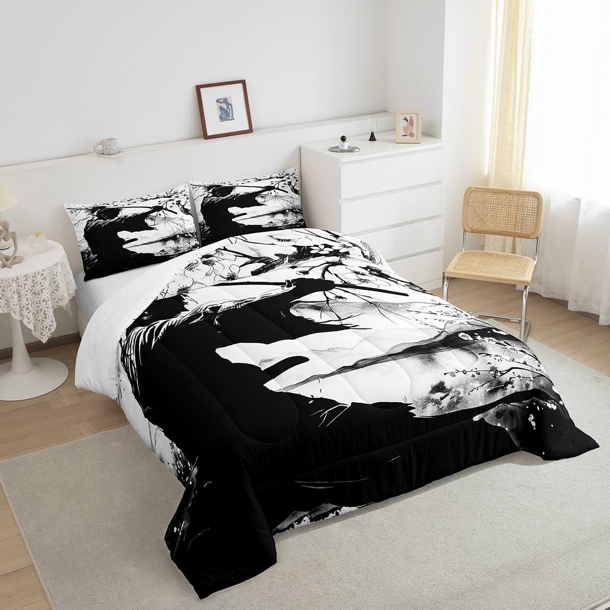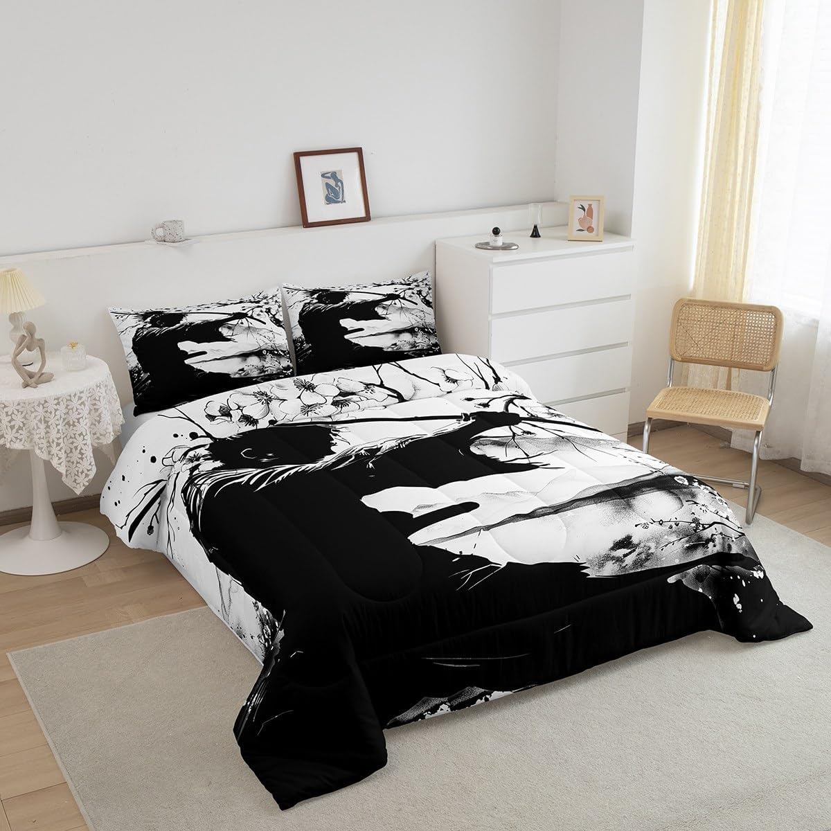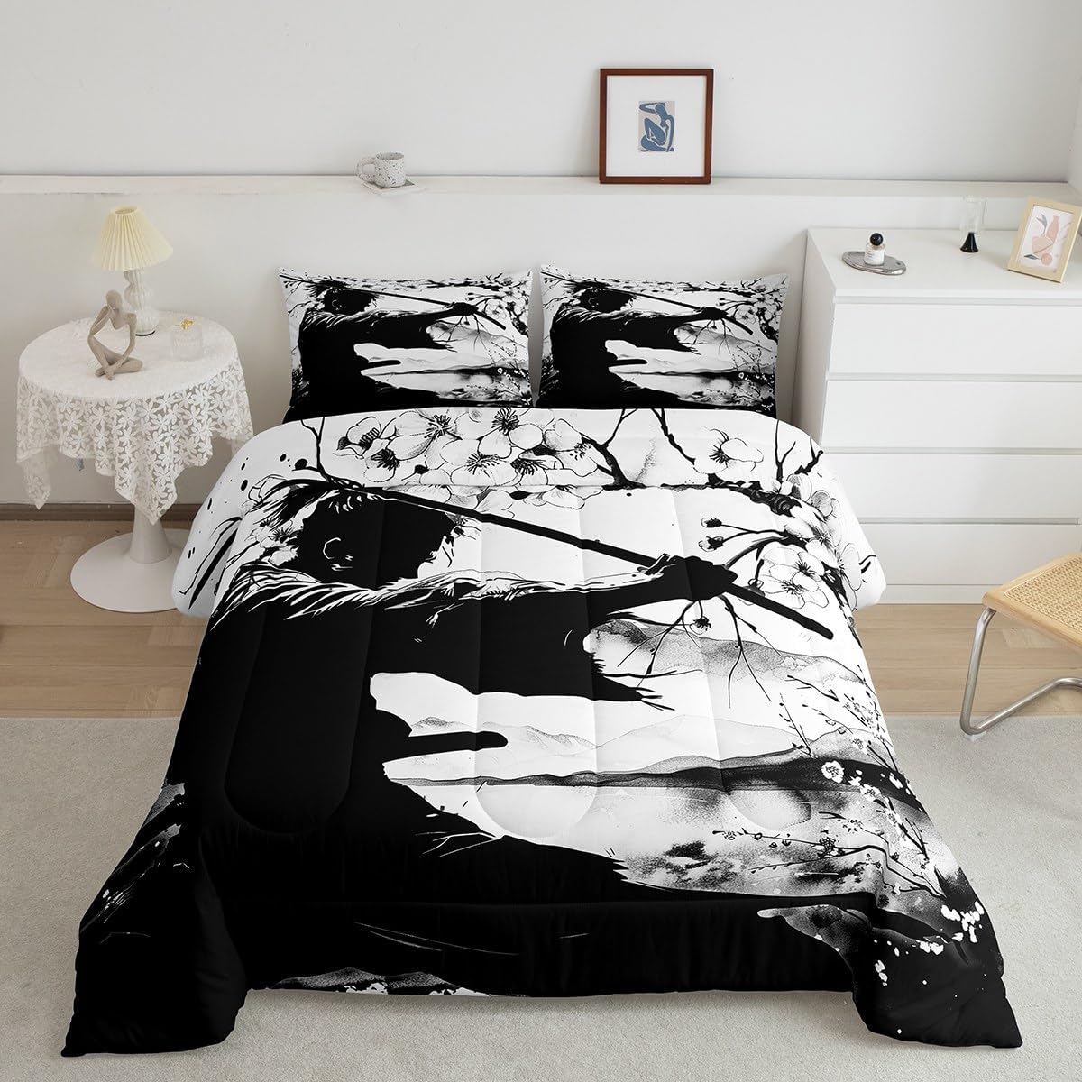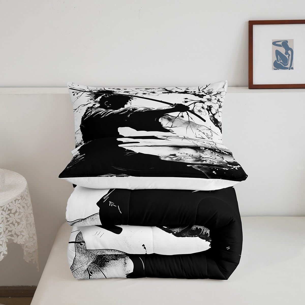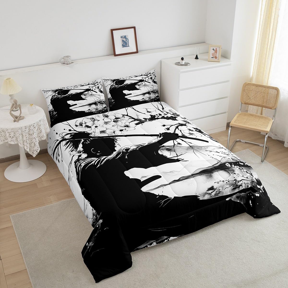 Erosebridal Samurai Comforter Set Twin Size, Japanese Style Print Bedding, Japan Bushido Bedding Comforter Sets, Black and White Decor Silhouette Quilted Duvet, Japanese Ukiyoe Duvet Insert 2Pcs