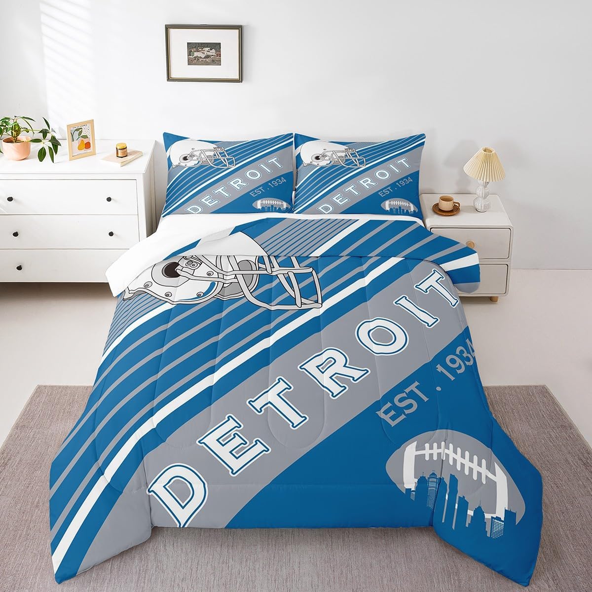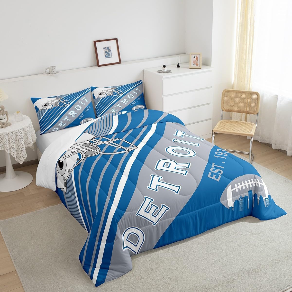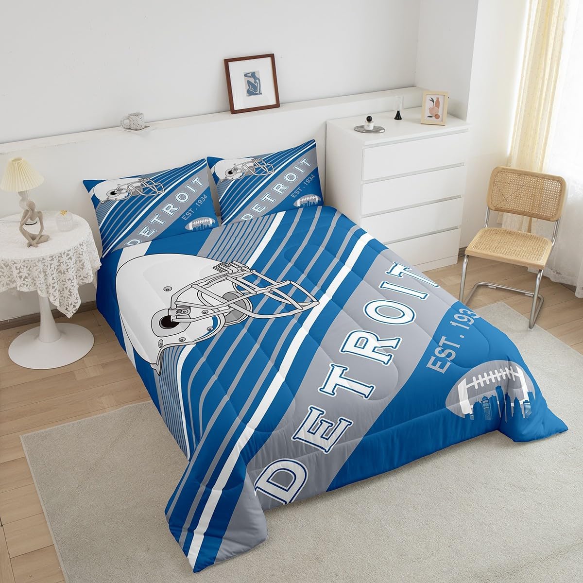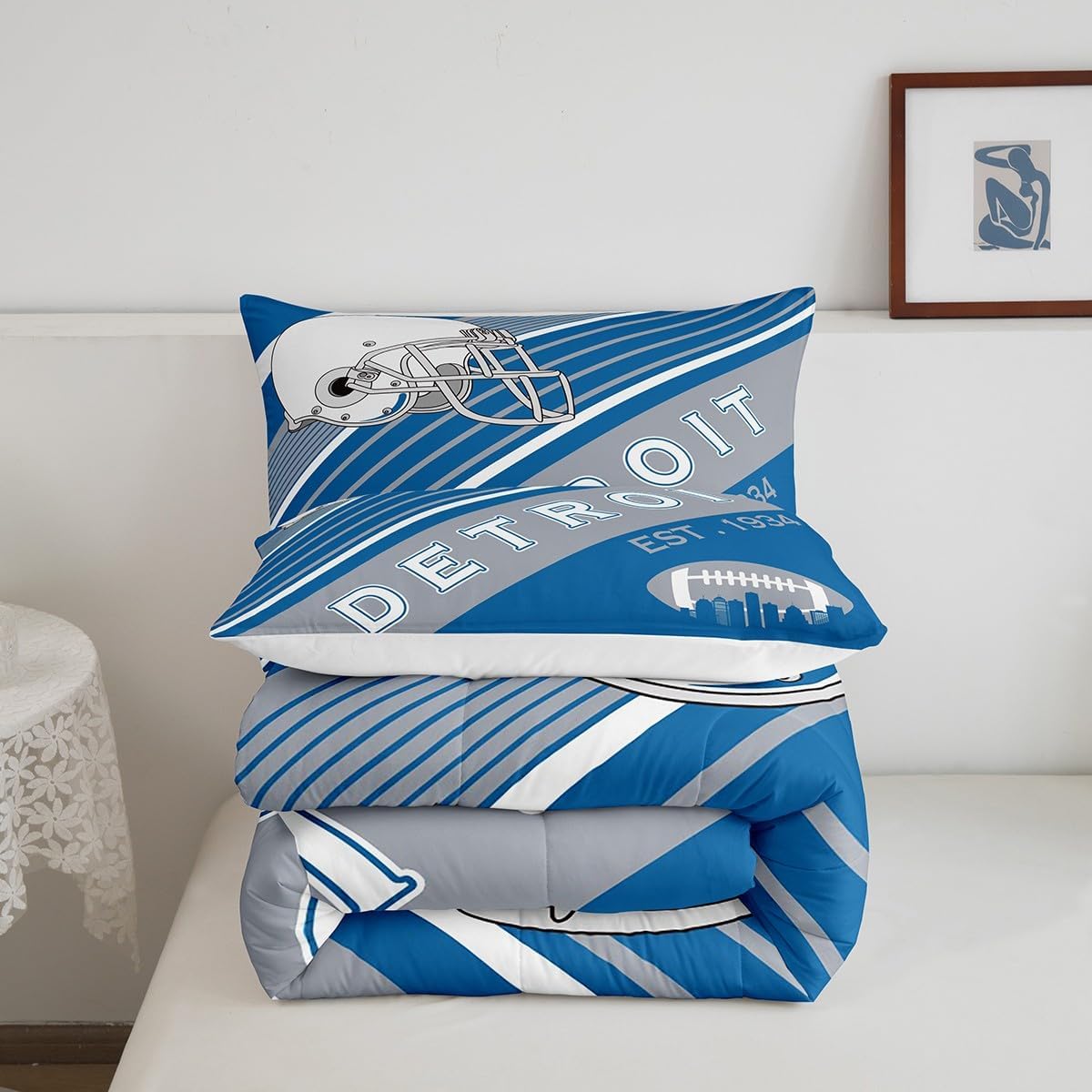 Erosebridal Sports Football Bedding Comforter Sets White and Sky Blue Rugby Helmet Bedding Twin, American Football City Themed Comforter Set Retro 3D Ball Game Quilt with 1 Pillowcase(Detroit)