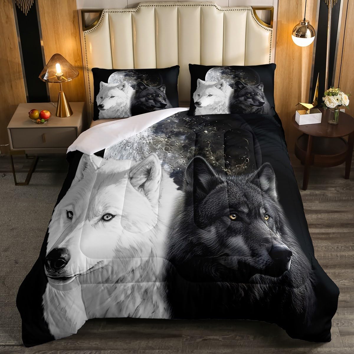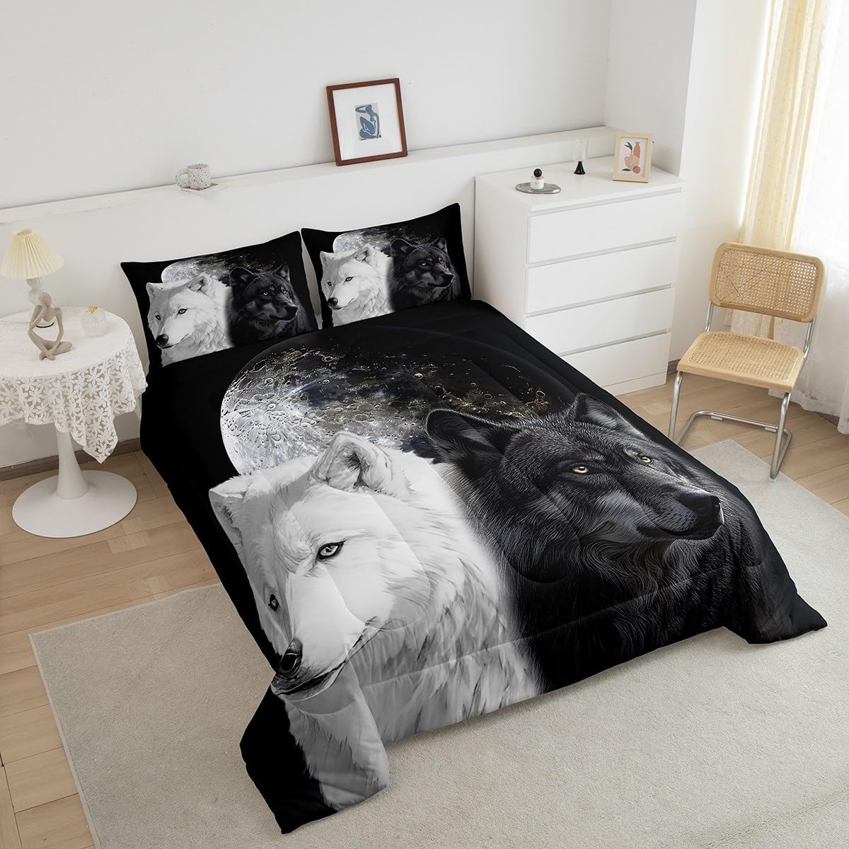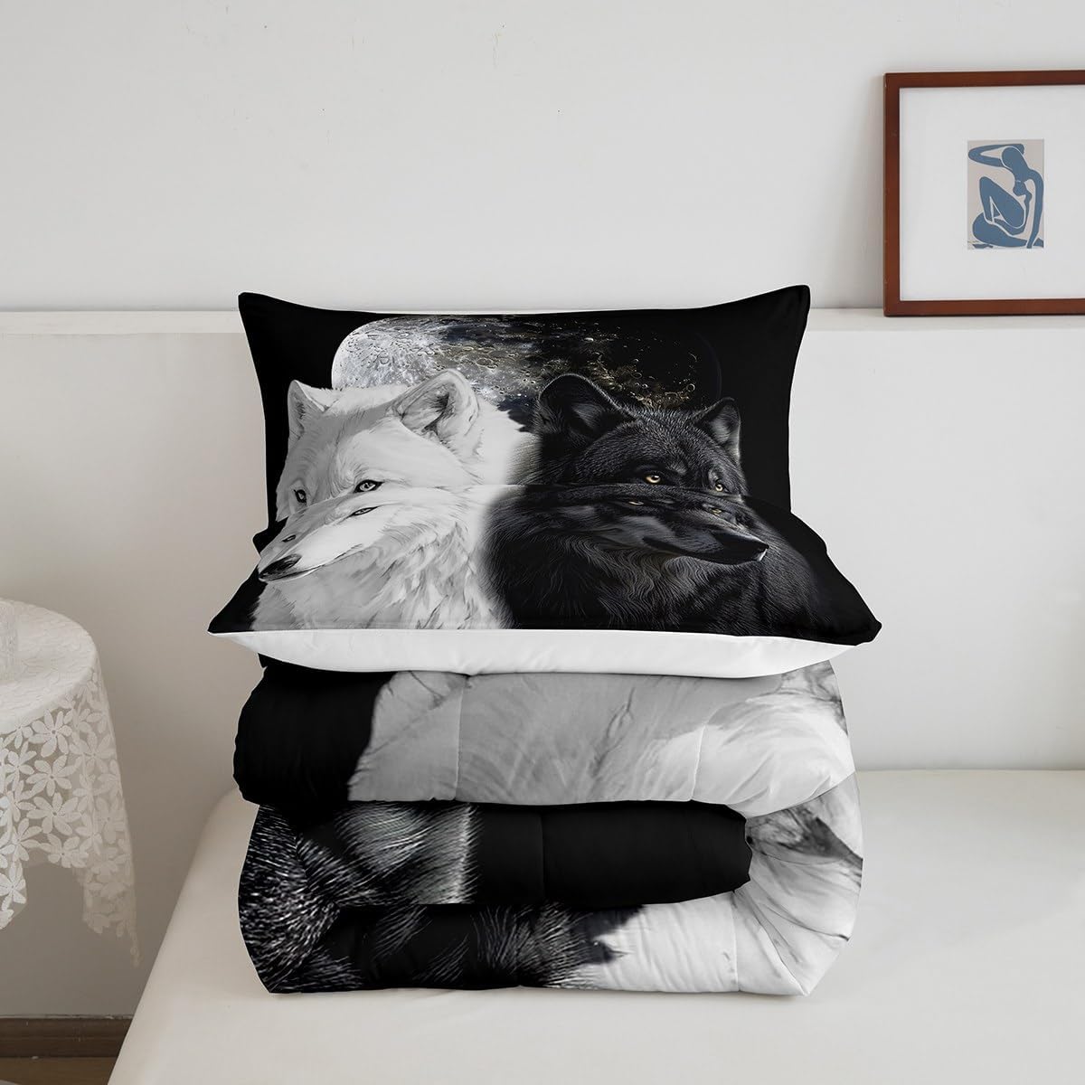 Erosebridal Wolves Bedding Black and White Comforter Set Twin, Moon Wolves Design Bed Comforter Set for Kids Adults 3D Animal Wolves Duvet Set Soft Microfiber Quilt for All Season