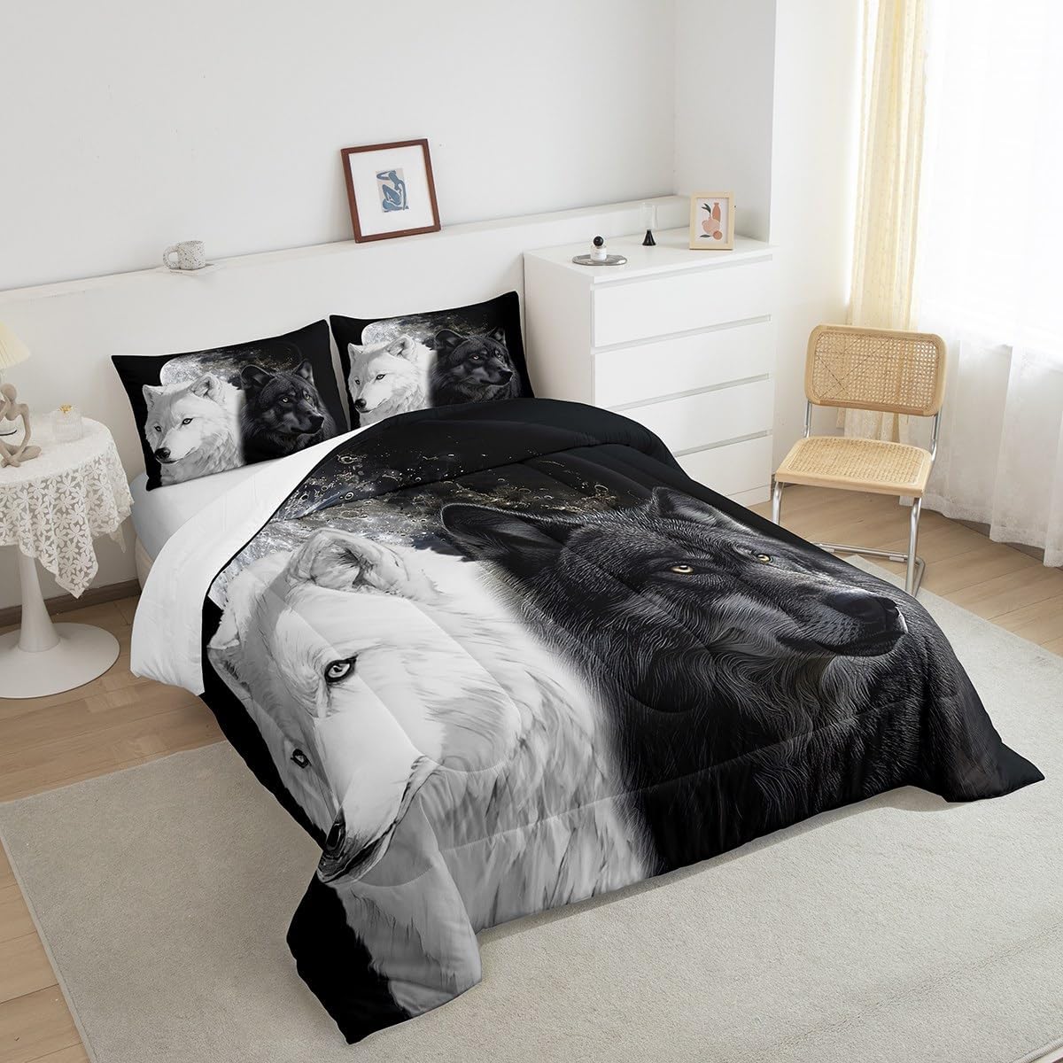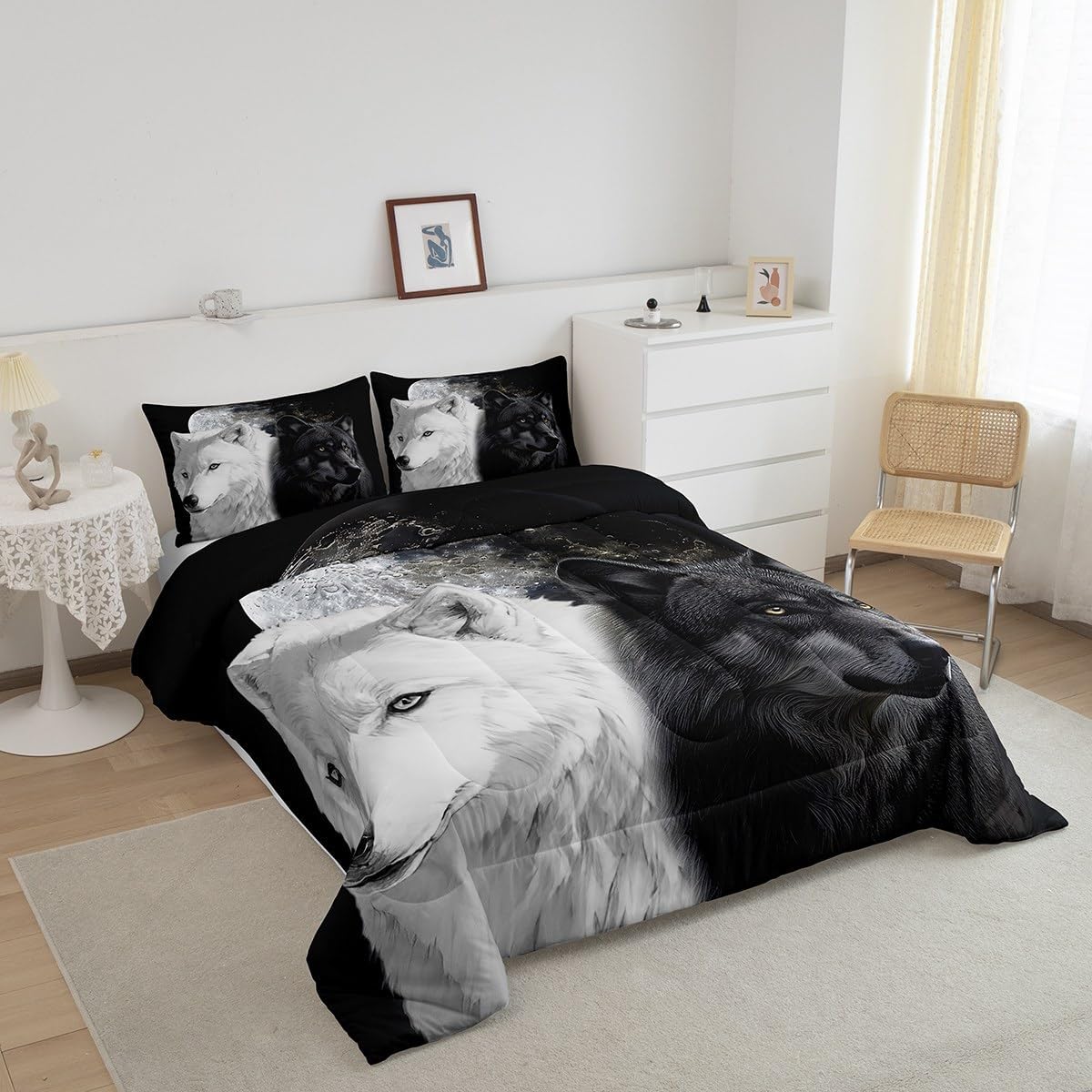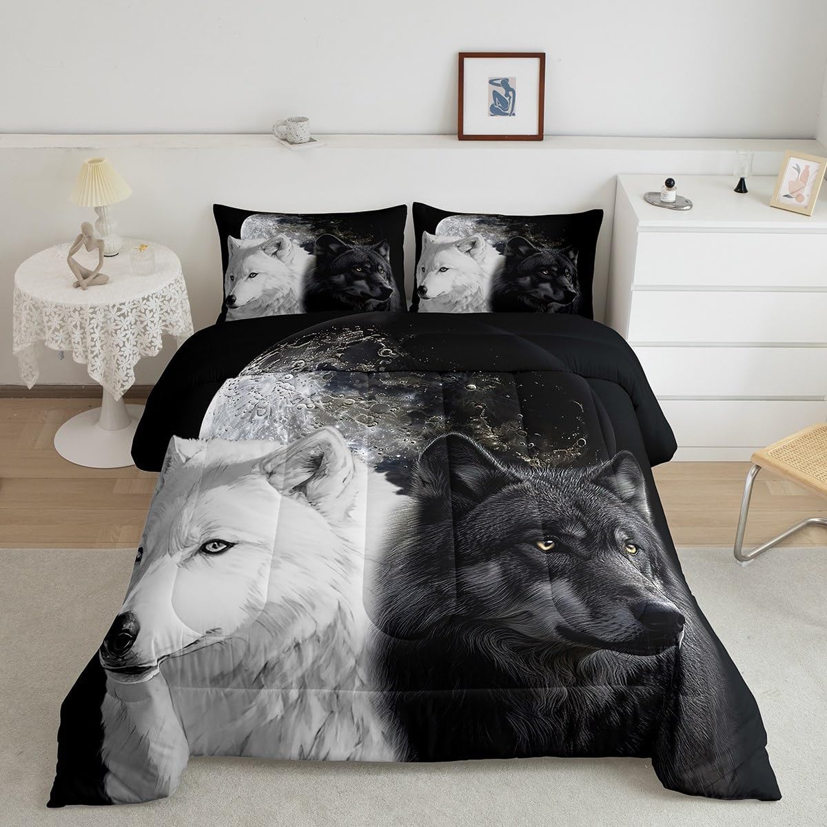 Erosebridal Wolves Bedding Black and White Comforter Set Twin, Moon Wolves Design Bed Comforter Set for Kids Adults 3D Animal Wolves Duvet Set Soft Microfiber Quilt for All Season
