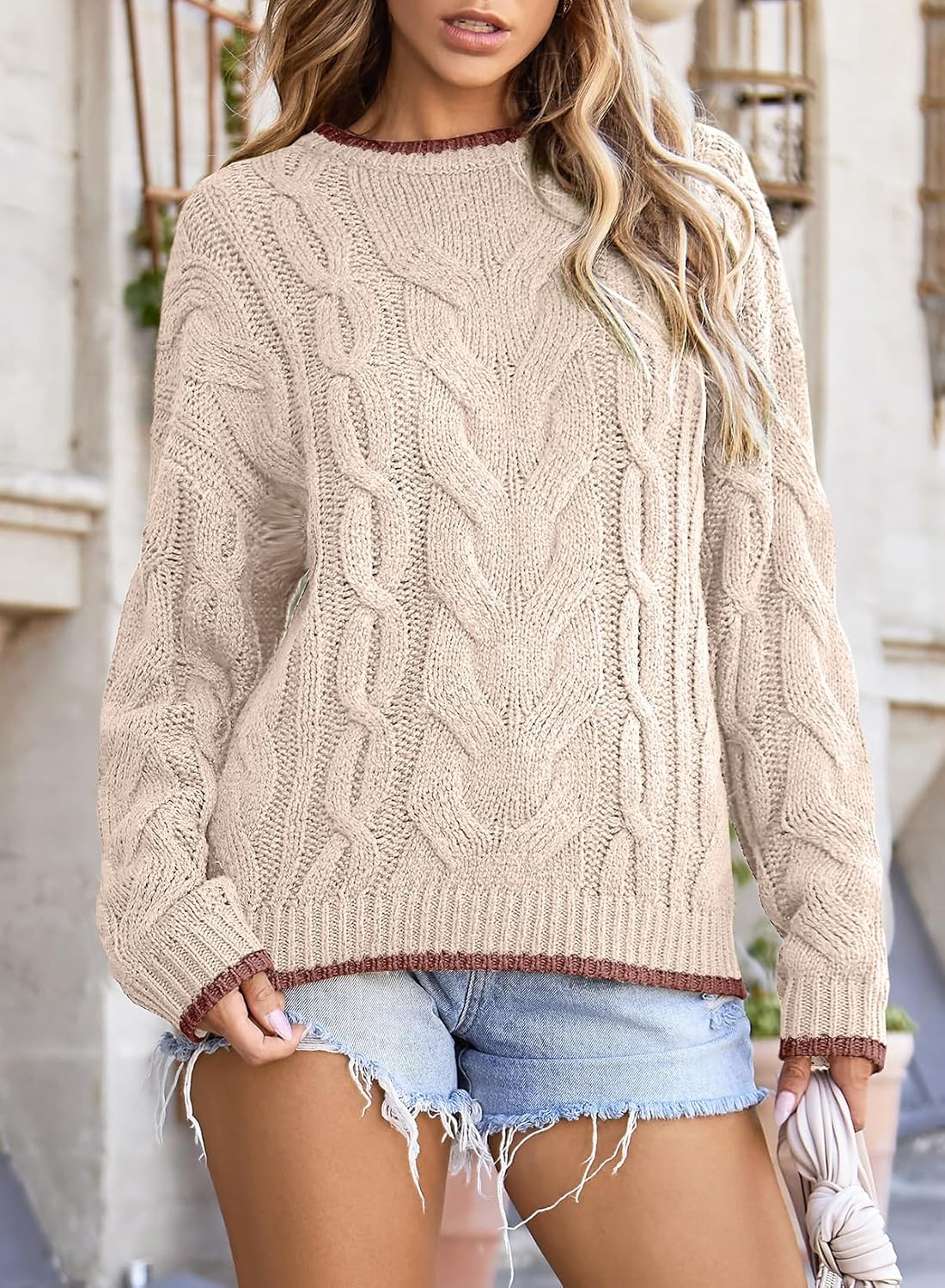 EVALESS Sweaters for Women Trendy Crewneck Long Sleeve Color Block Sweater Tops Fall 2024 Chunky Cable Knit Pullover Sweaters