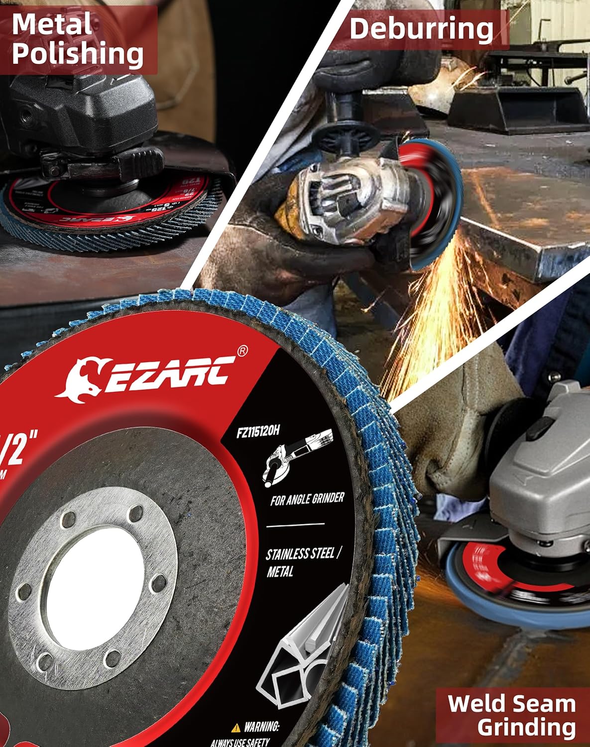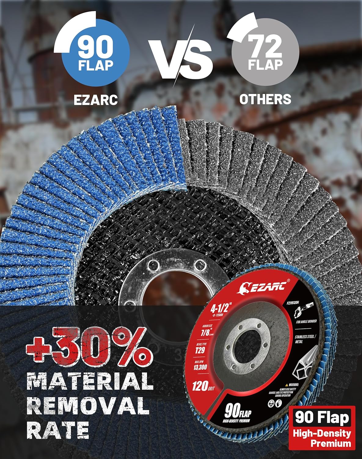 About this itemn?Great Performance?EZARC flap sanding discs are made of hard zirconia material which lasts longer than standard aluminum oxide abrasive material, built for a more robust and economical grinding wheel.n? Widely Used?120 grit flap disc is coarser in build and is ideal for heavier stock removal. Our flap disc is widely used for metal or wood, to remove the weld reinforcement, deburring, polishing, and to rust removal.n? Fast & Efficient Grinding ?Glass fiber and adhesive form a firm combination, will not pollute the working surface. The fiberglass pad can effectively absorb vibration and bring more stable and efficient grinding.n? Convenient to Use ?Bevel Type 29 angle design makes the edge and corner grinding much more convenient, great for surface sanding, and working on welded seams at a working angle of 5 to 15°.n? Professional Grinder Flap Disc ? 4-1/2-inch diameter with a 7/8-inch arbor size compatible with an angle grinder with a maximum 13, 300 RPM grinding speed. This angle grinder flap disc is designed for grinding, blending, sanding, and finishing on a wide range of material.