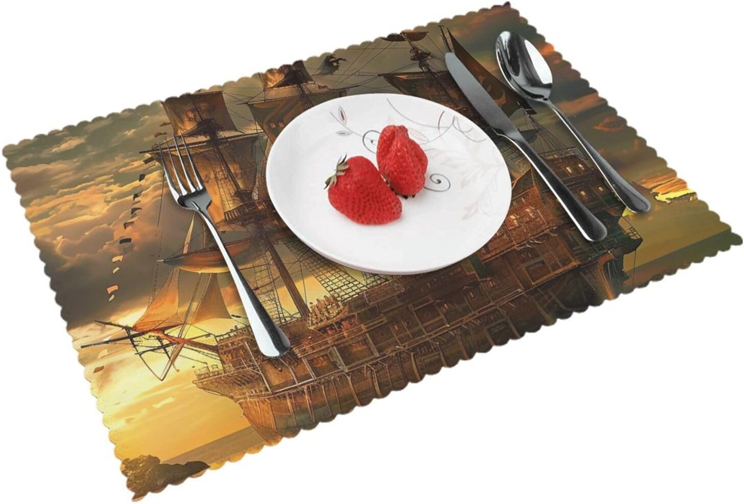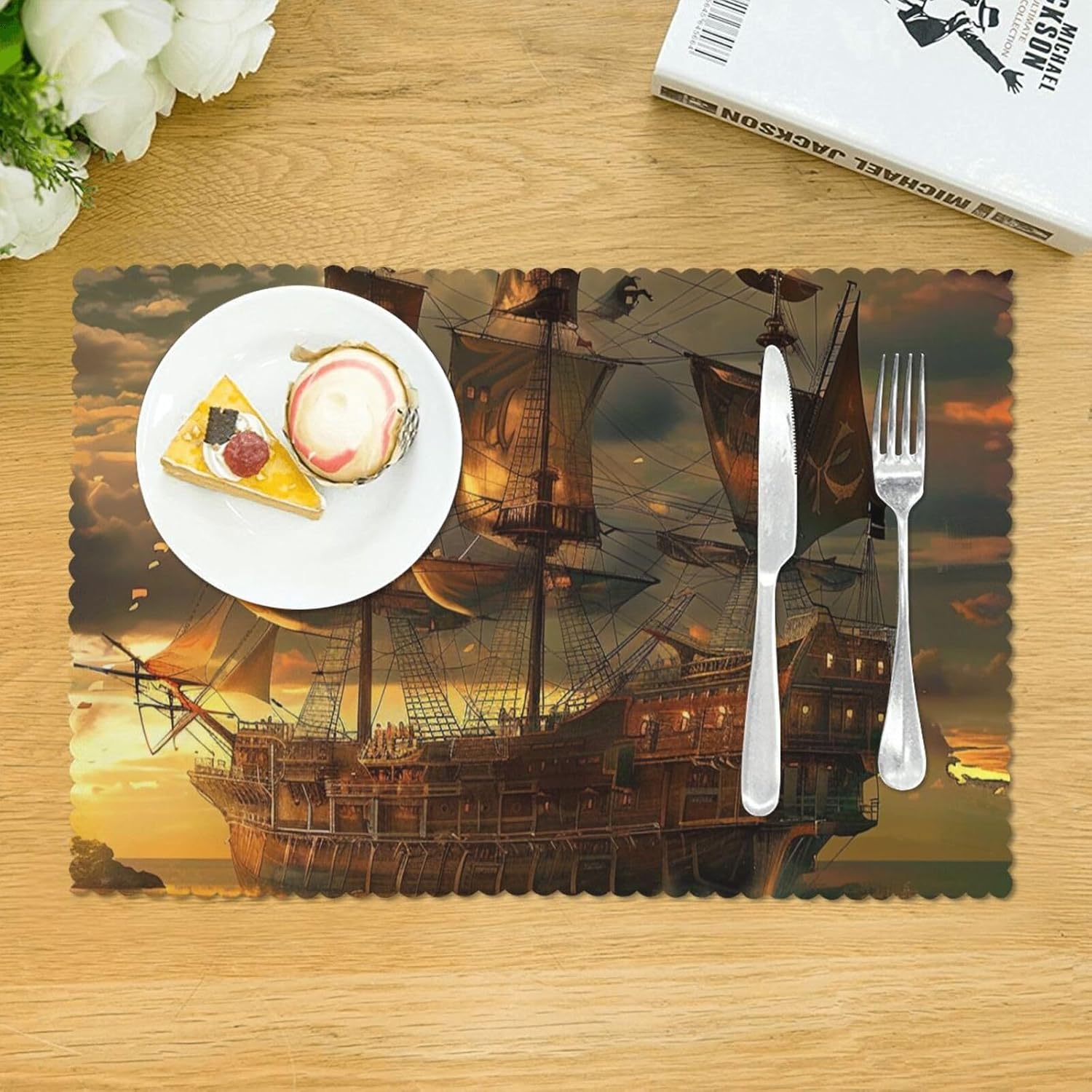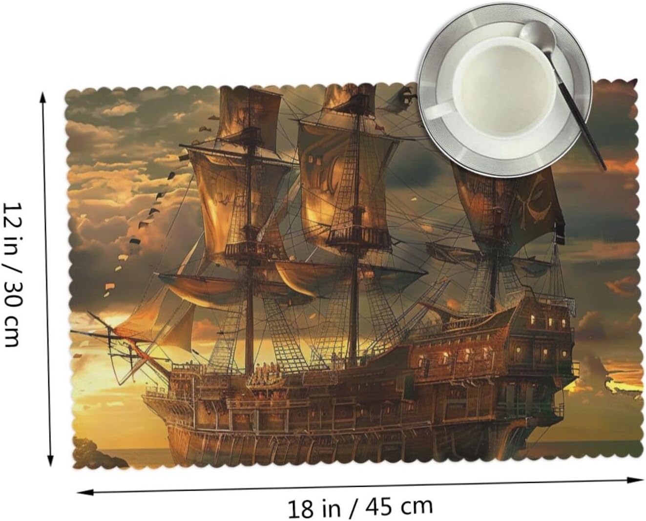 Fantasy Pirate Ship Printed Heat Resistant Placemats 4 PCS – Non-Slip Washable Kitchen Table Mats for Dining, Parties & More (12x18in, Polyeste)