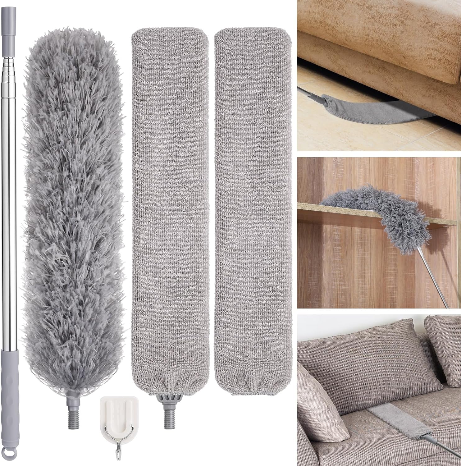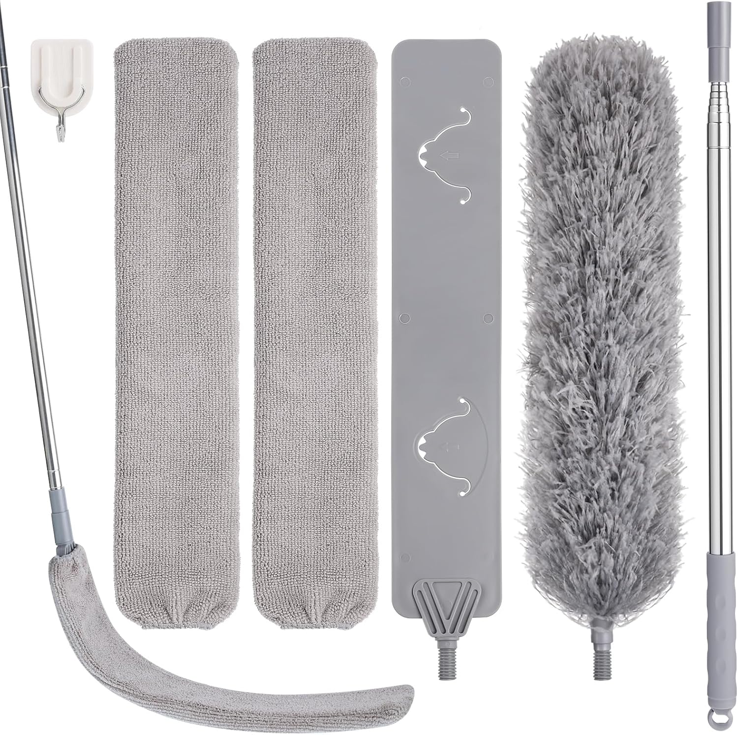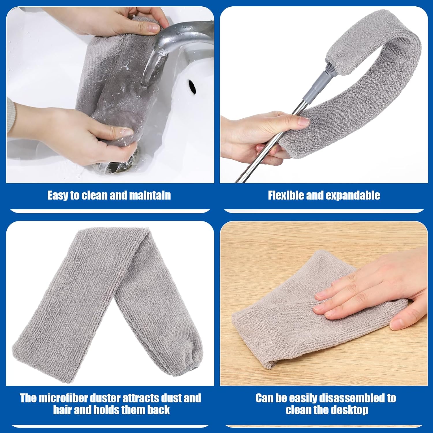 About this itemn?Retractable Duster? The main rod of this duster with extension pole is made of stainless steel and can be extended up to 100 inches. It can be adjusted manually. Whether it is the ceiling or under the sofa, this gap cleaning brush can clean and solve your cleaning problems.n?Bendable feather duster?The head of this dusters for cleaning is 16 inches long and can be bent according to the items to be cleaned. It is used to clean various dead corners and hard-to-reach areas. The duster’s microfiber duster head is designed with a scratch-resistant soft head to protect your ceiling and furniture from scratches.n?Cleaning Tools Set?This household dust cleaner set includes 1 crevice board, 2 crevice brush cloths, 1 feather duster, and 1 hook to hang the cleaning supplies.n?Disassembly and Cleaning?This duster with extension pole is reusable. To clean it, just slide the head off the extension pole, wash it with warm or low-heat water, and then hang it in a ventilated place to fluff it up for next use.n?Has Many Uses?This feather duster can be used as a fan duster for ceiling fan blades, and can also be used to clean ceilings, furniture, stairs, blinds, cobwebs, windows, Under the sofa., without the need for a ladder or footstool. It can clean high and low places.