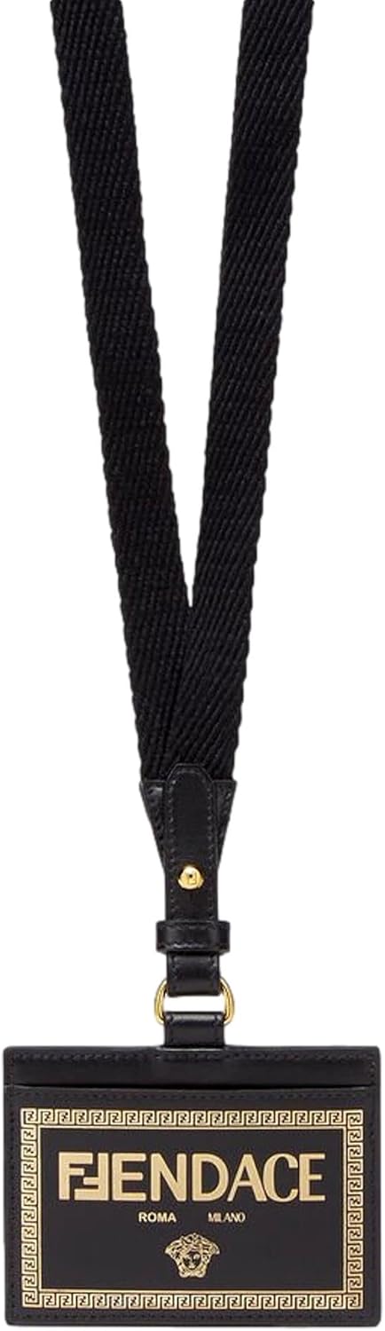 About this itemnFrom the iconic capsule collection, this card case lanyard is ideal for travel, professional, or daily use. Easily access your most essential cards with the front and back card slots.- Model: 7M0335nCrafted from black calf leather, the front face features the Fendace logo printed in metallic gold. Complete with a detachable lanyard strap, experience the perfect blend of convenience and style.nModel: 7M0331 Metallic Gold Printed Fendace Logo Black Calf Leather Gold-tone HardwarenDetachable Canvas and Leather Lanyard Two card slots Black Fabric LiningnMeasurements: 4