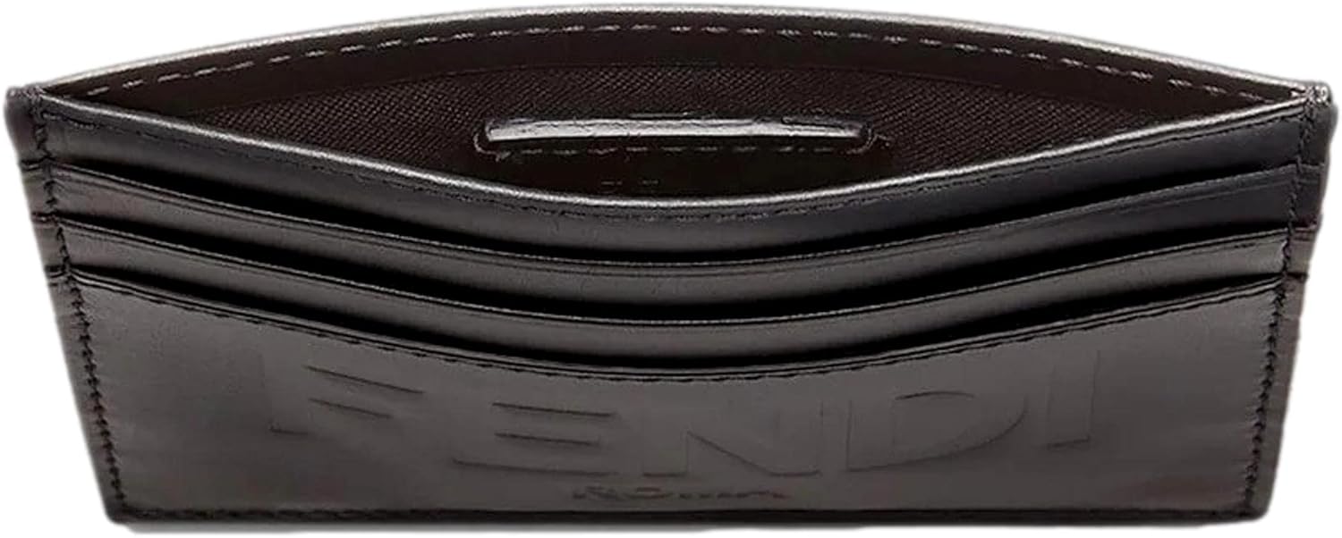About this itemnThePolish your everyday style with this card case from Fendi. Crafted from dark navy calf leather, it features the FF logo print embossed on the front and back.nThere are three card slots on each side of the card case separated by one bill slot in the center. The slim profile and sleek design make for a sophisticated everyday essential.nModel: 7M0164 Dark Navy Calf LeathernSix Credit Card Slots One Center Bill Slot Embossed FF PrintnMeasurements 4 x 0.2 x 3.2 inch (LWH)