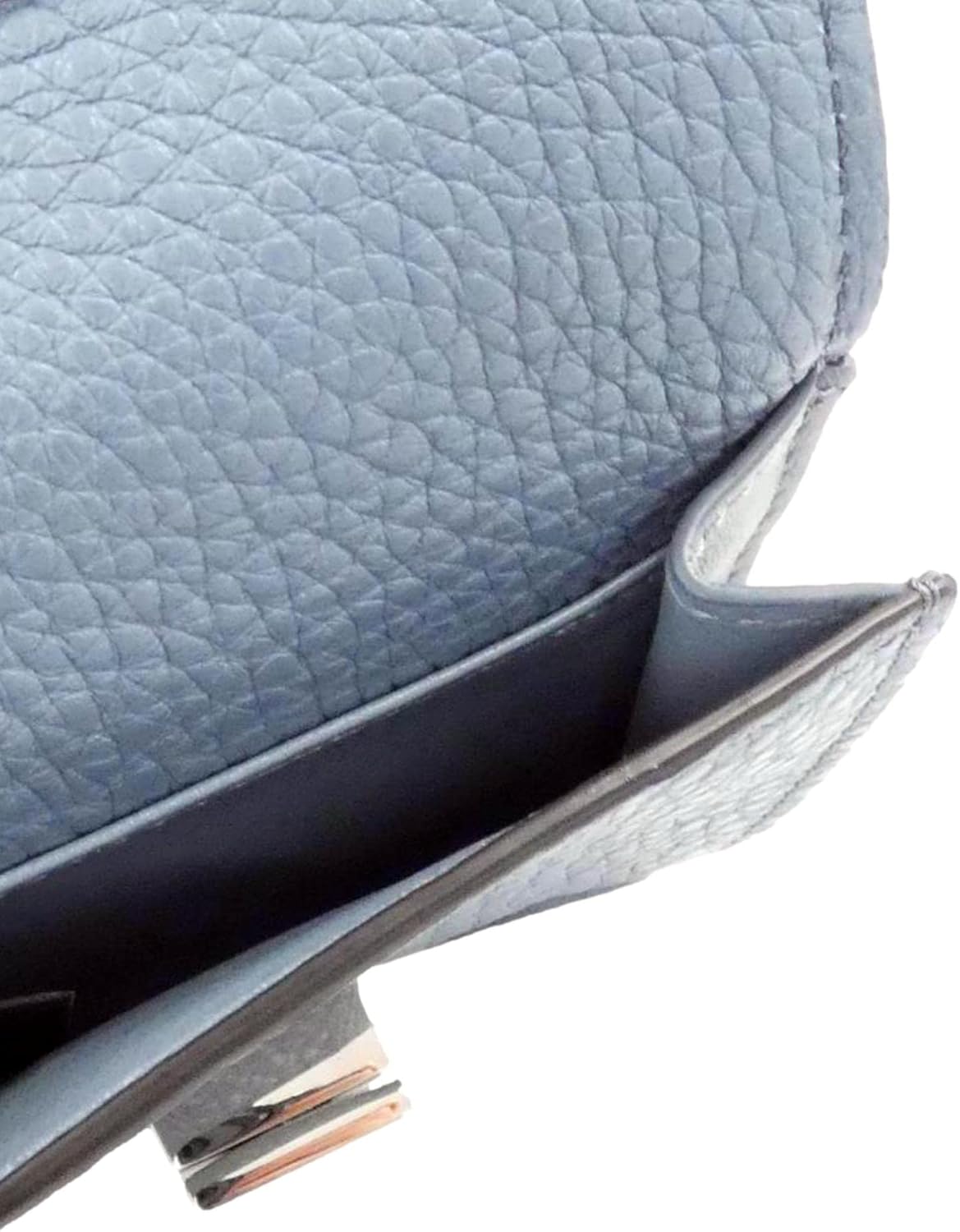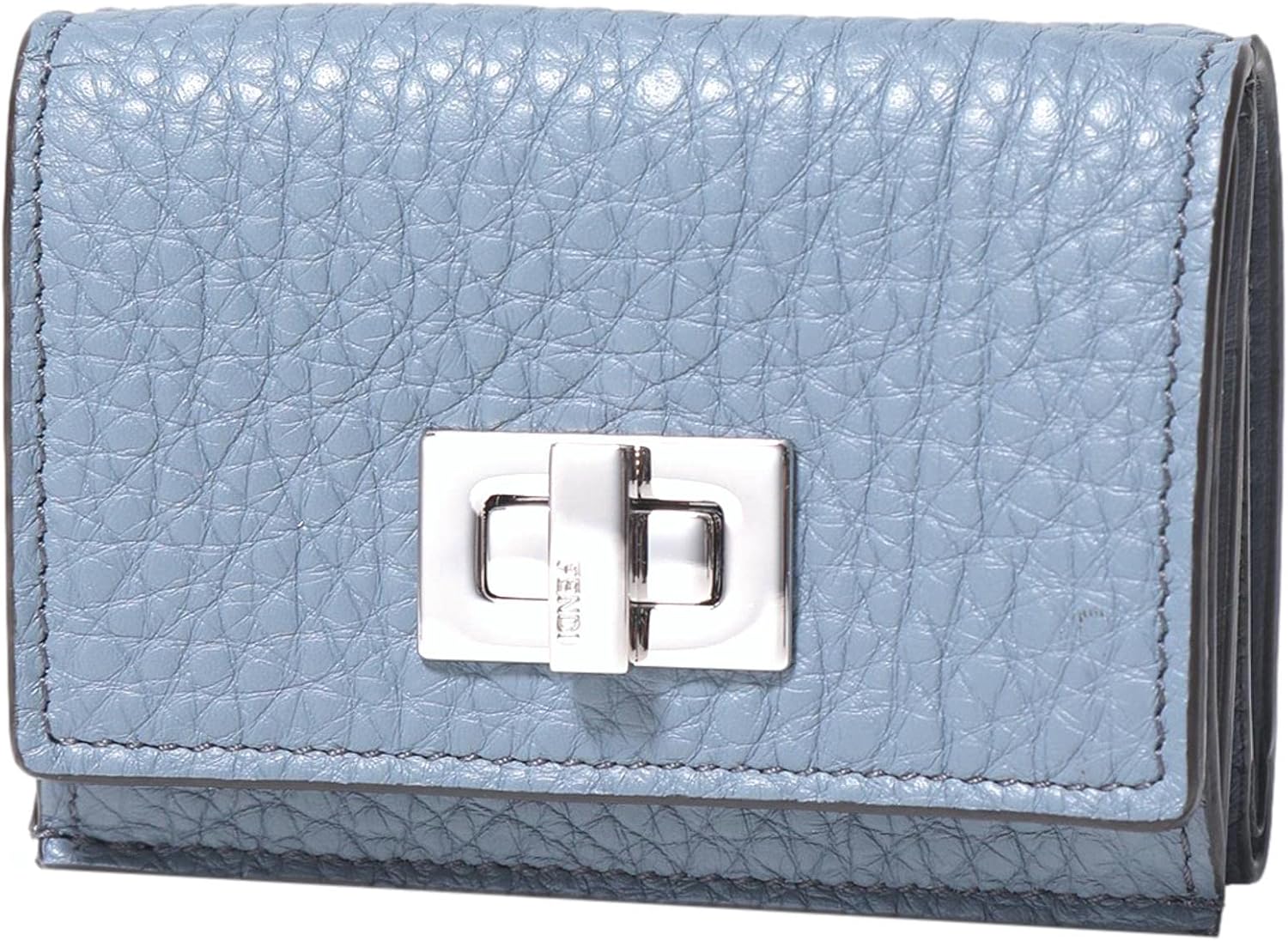About this itemnThis trifold wallet from Fendi is not only fun, but functional. It is crafted from sky blue selleria leather and features a turn lock opening on the front face.nInside, there is one bill slot and three card slots in addition to the front compartment. Hold your necessities in style with this signature accessory from Fendi!nModel number: 8M0426 Trifold wallet Sky Blue leather Gold-tone hardwarenSignature turn lock closure with Fendi engraved logo Three card slots One bill slot Coin compartmentnMeasurements: 3.75 x 1.5 x 2.75