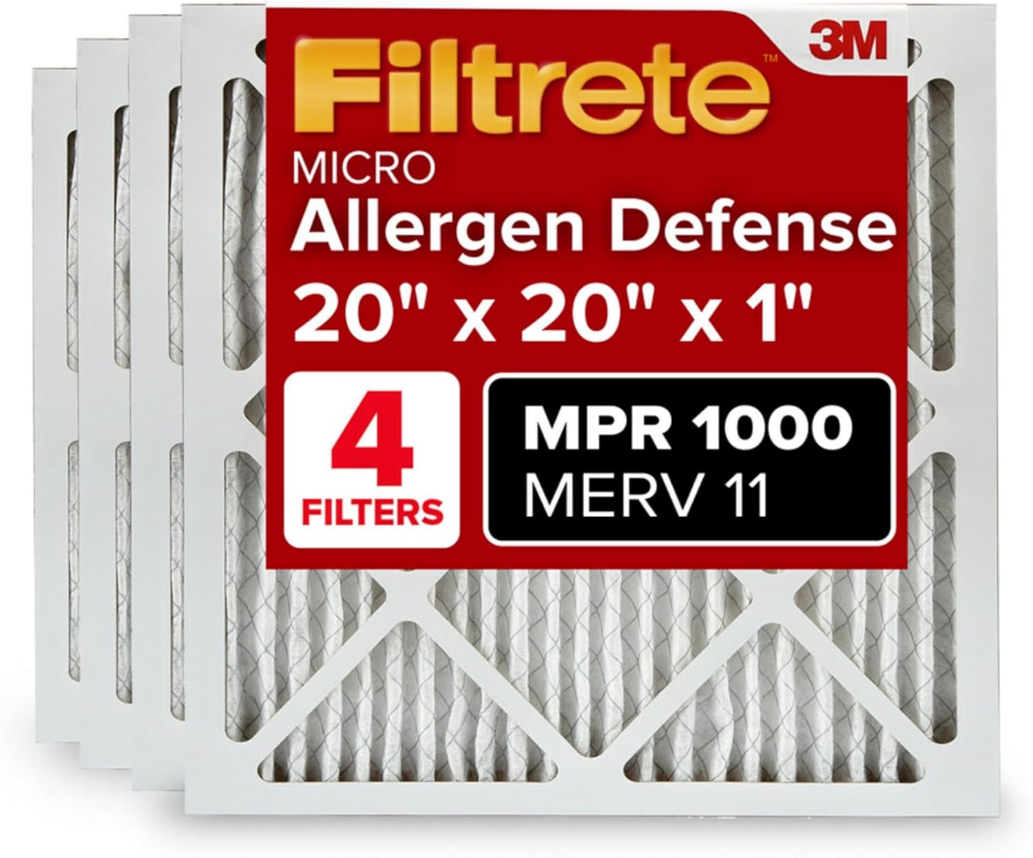 Filtrete 20x20x1 AC Furnace Air Filter, MERV 11, MPR 1000, Micro Allergen Defense, 3-Month Pleated 1-Inch Electrostatic Air Cleaning Filter, 4 Pack (Actual Size 19.69×19.69×0.81 in)