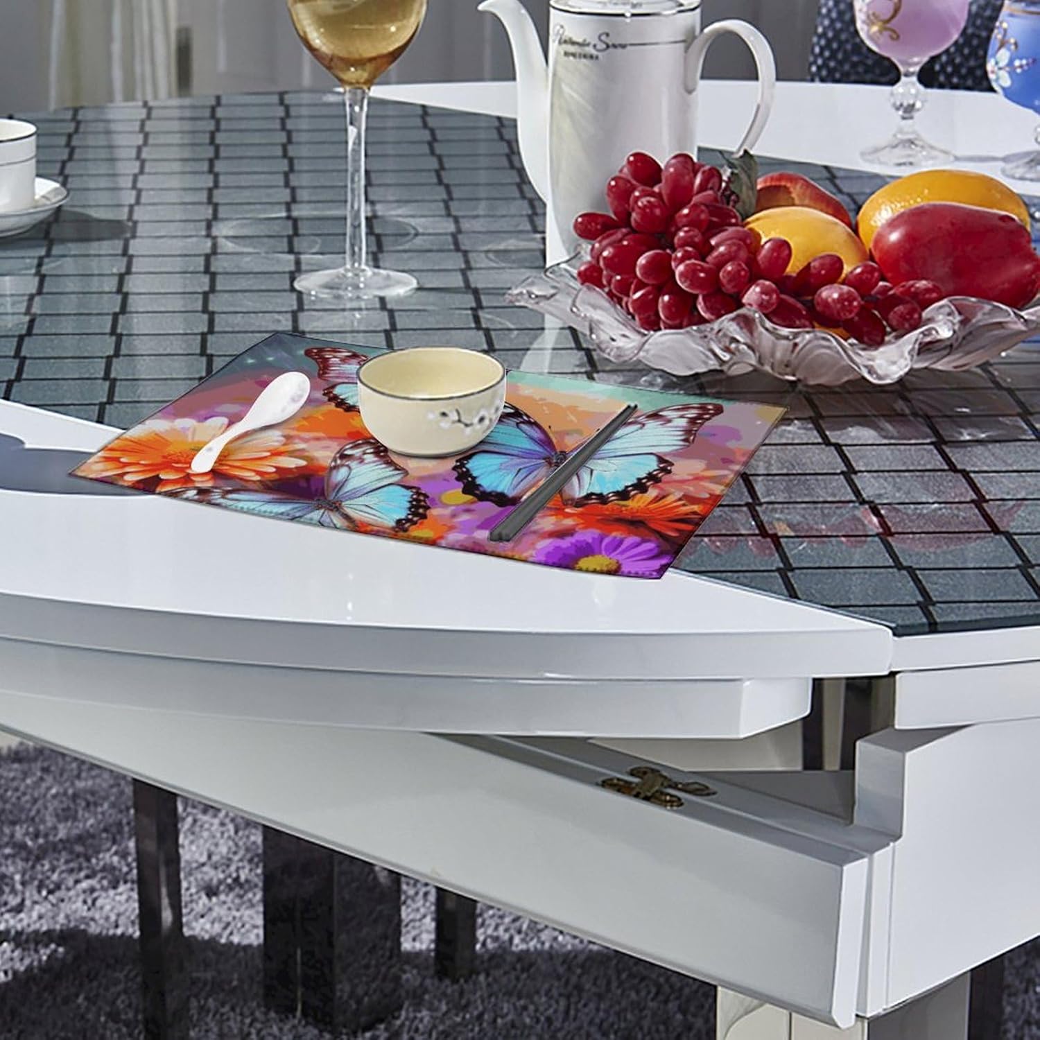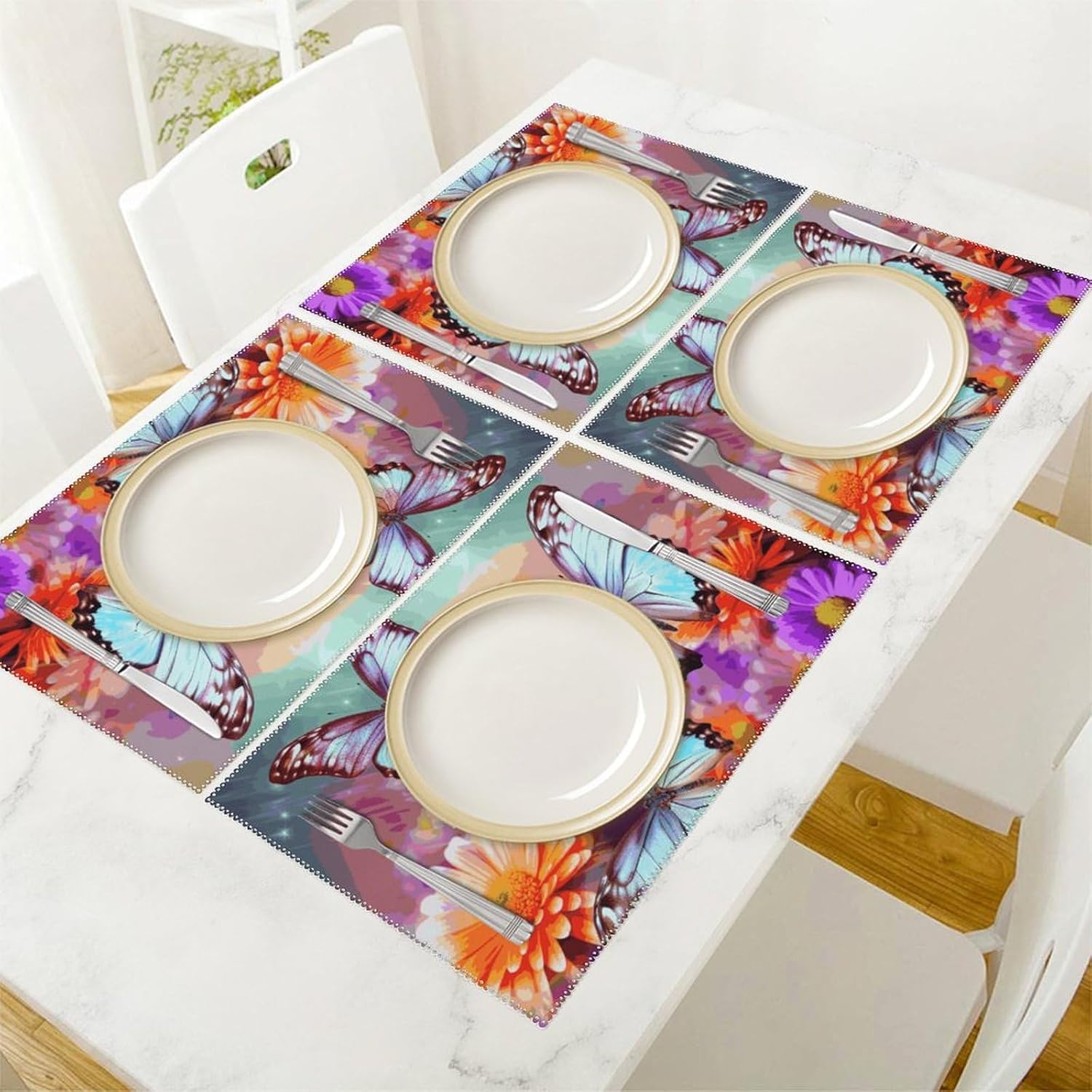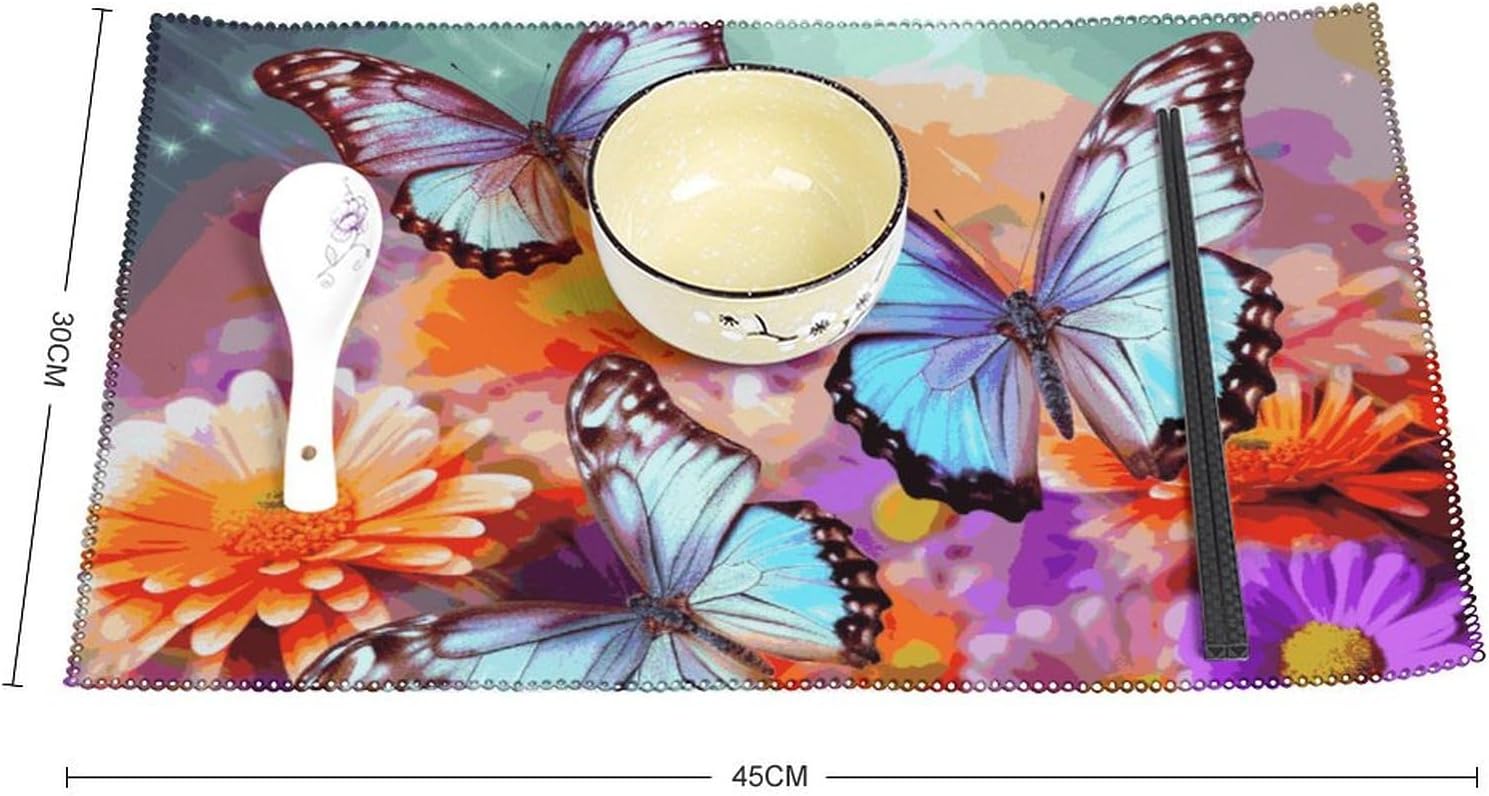 About this itemnPerfect Protection: Crafted from high quality canvas fabric, the Flowers Colorful Butterfly table protector is thick, protecting your tables and furniture from hot dishes, stains and scratches.They provide a non-slip surface, resist fading, and are easy to clean, elevating your dining experience.nMeasurements: Each package includes 4 pieces of placemats measuring 17.7 x 11.8Inch.If there is any problem,please contact us, our customer support team is always ready to help you. It is suitable for all hot drinks and plates, protect your dining table from scalding.nGreat Gift Idea: The stylish placemats set makes s great housewarming, wedding or birthday gift. They are quality assured, practical, stylish, and add a touch of elegance to any home. Add style to your dining setting while ensuring table protection.nVersatile Uses:Our placemats can be used as nice accessories to match your different decor purposes such as table mats, pot holders, coasters, laptop pads, etc. The rustic and neutral design fits any occasions and helps to create a warm and inviting atmopshere.nEasy to Care: Hand wash with warm soapy water or wipe dry directly; do not wash in a washing machine or use steel balls or something very difficult to clean.They provide a non-slip surface, resist fading, and are easy to clean, elevating your dining experience.