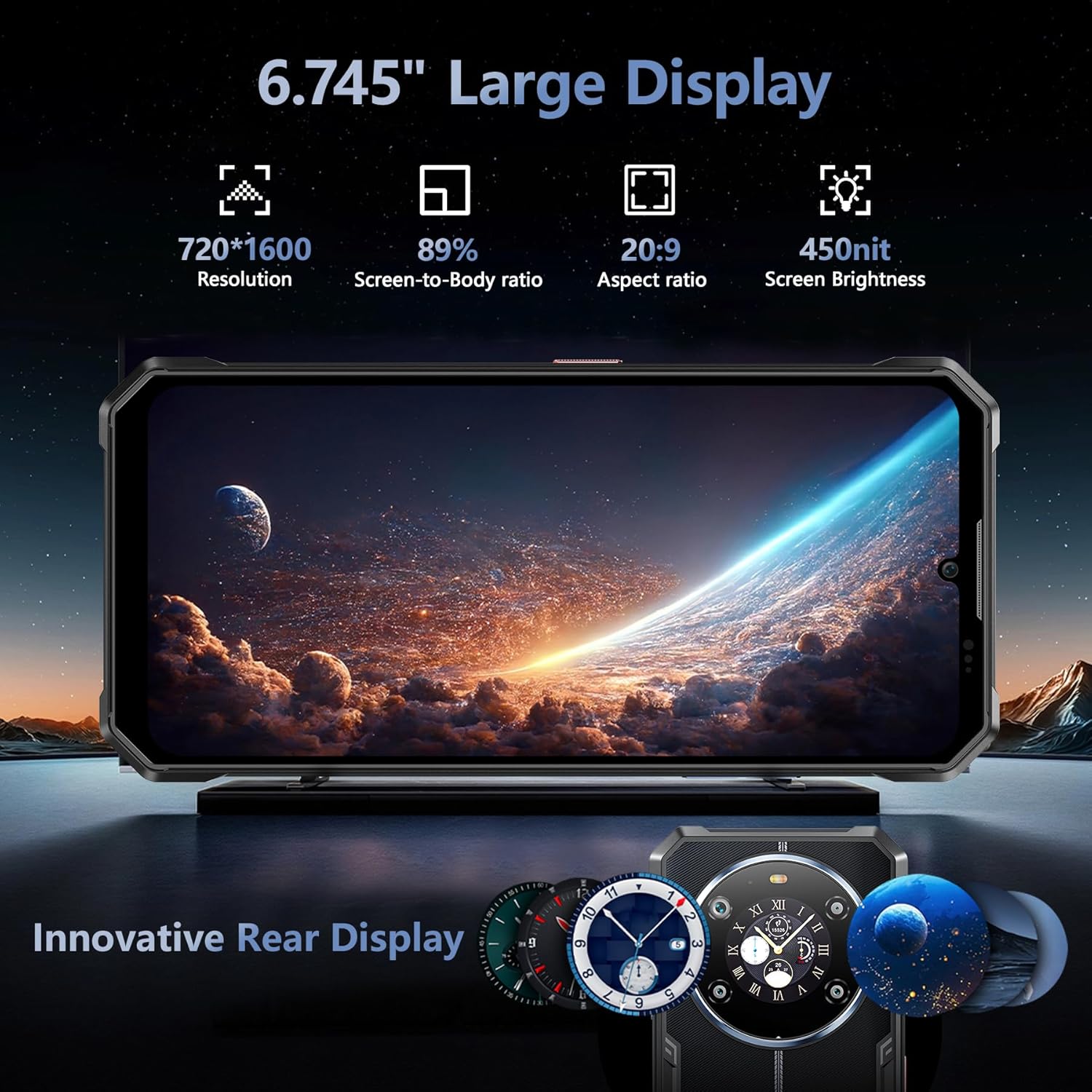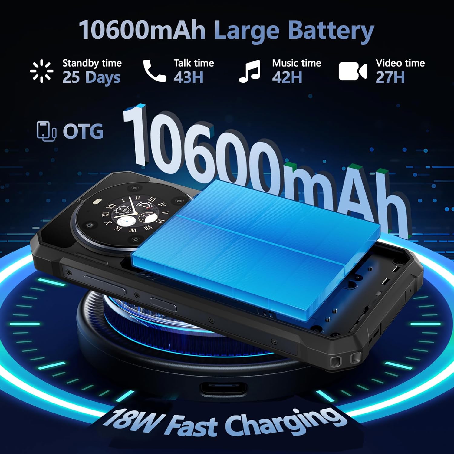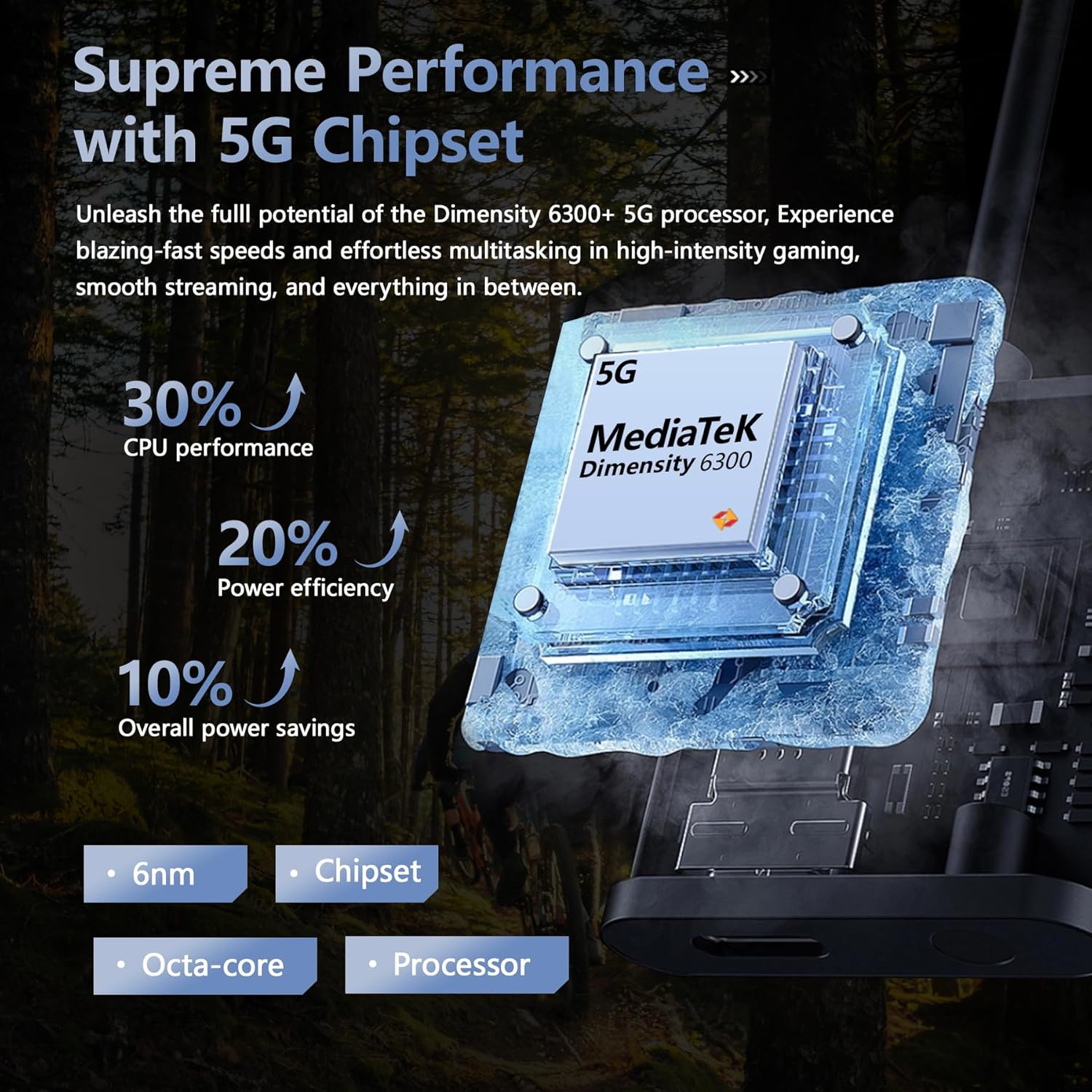 About this itemn5G MediaTek Dimensity 6300+& 24GB RAM+256GB ROM Memory: The FOSSiBOT F109 Smartphone features an octa-core Dimensity 6300 5G processor, built on an advanced 6nm architecture and clocked at an im-pressive 2.2GHz, and equipped with 24GB (8GB + 16GB virtual) RAM + 256GB ROM, experience blazing-fast speeds and effortless multitasking in high-intensity gaming, smooth streaming, and everything in between. Don’t worry about running out of memory.n10600mAh Battery & OTG Reverse Charge: The FOSSiBOT F109 rugged smartphone is powered by a massive 10600mAh (18w) battery, providing extended usage for outdoor enthusiasts and heavy users. With the OTG (not excluding cables) reverse charge feature, this rugged phone unlocked can serve as an emergency power source for other devices. Stay powered up and ready for action, as this rugged cell phone is designed to keep pace with your demanding lifestyle.n6.745