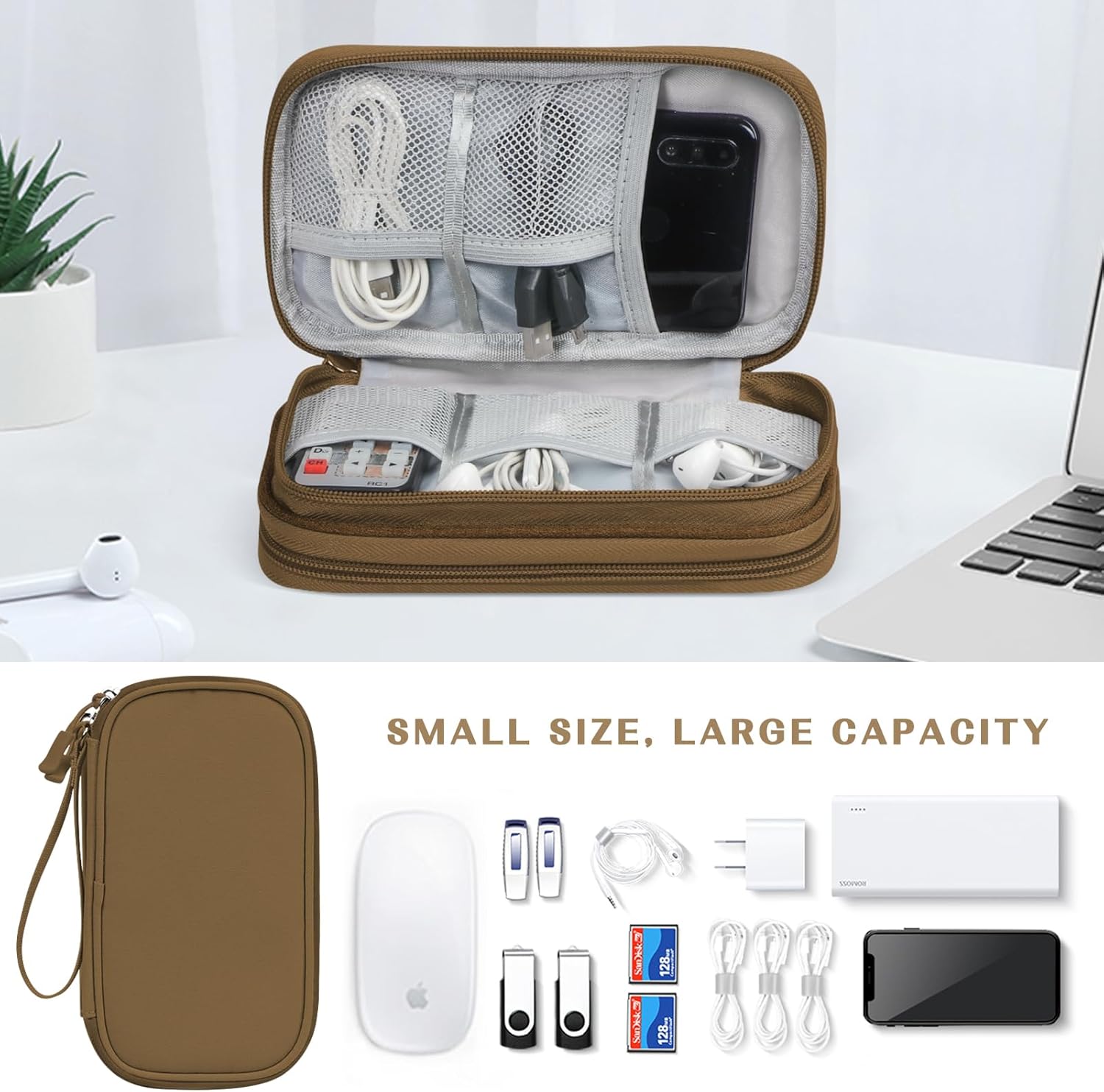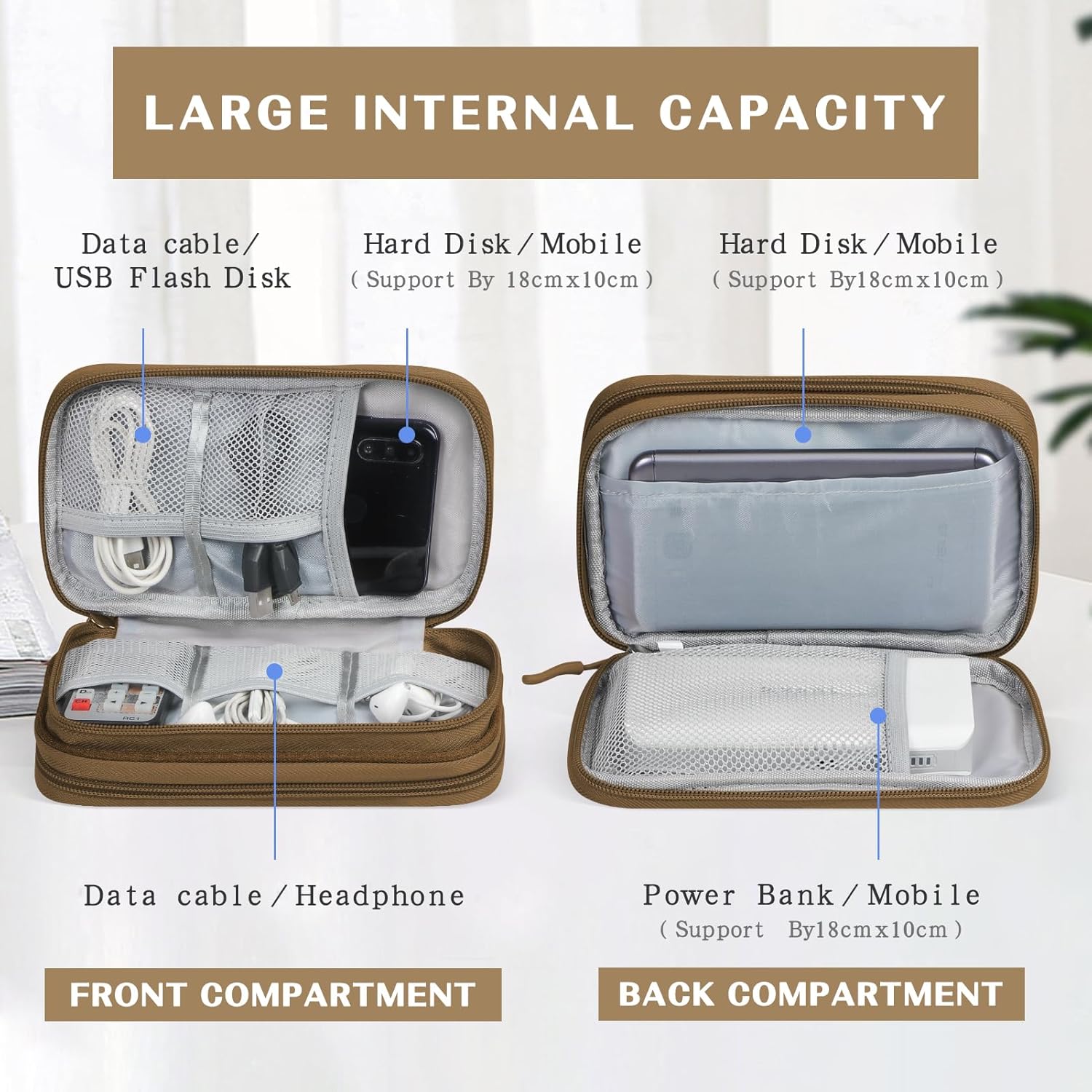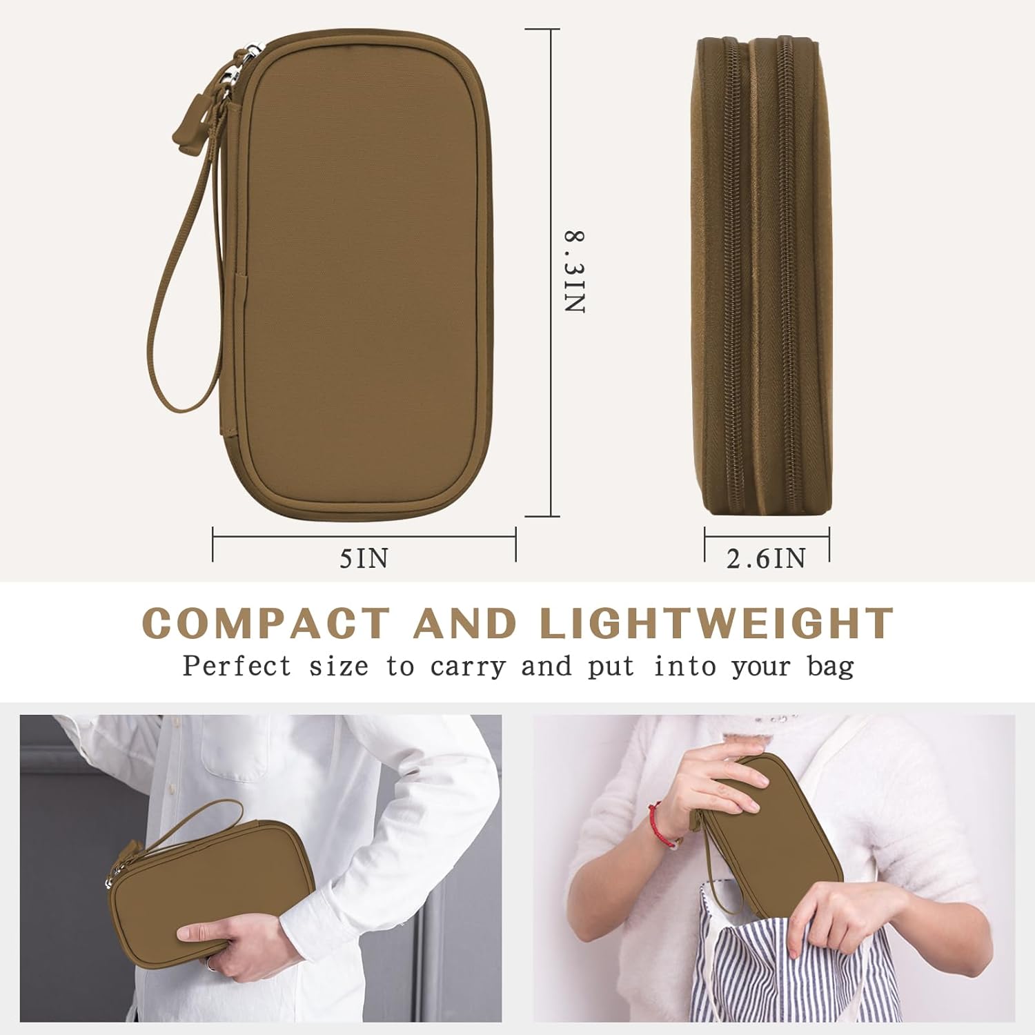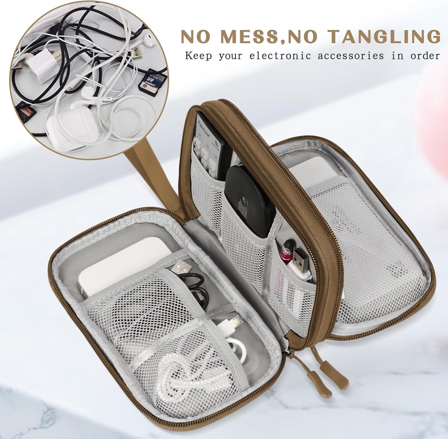 FYY Electronic Organizer, Travel Cable Organizer Bag Pouch Electronic Accessories Carry Case Portable Waterproof Double Layers Storage Bag for Cable, Charger, Phone, Earphone, Medium Size- Brown