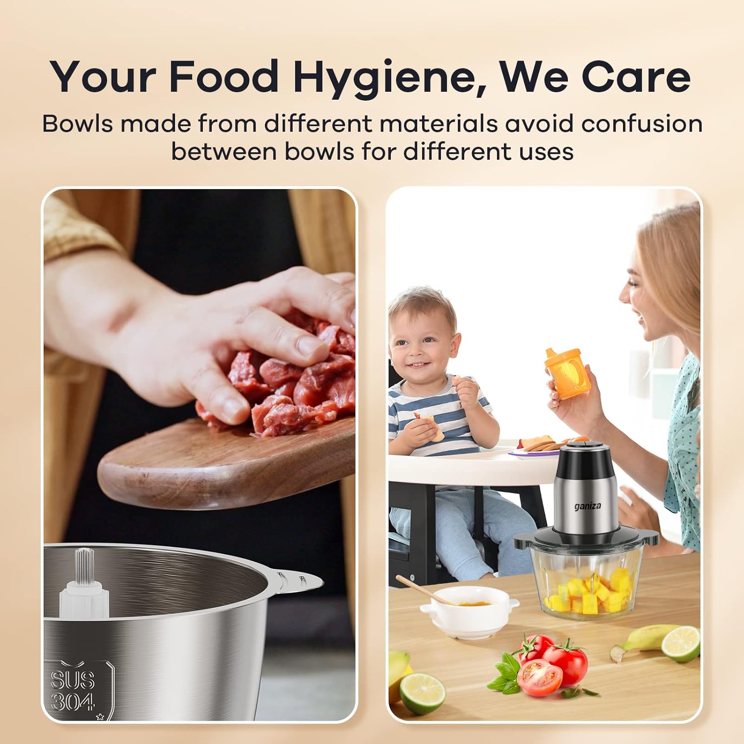 About this itemn?Indispensable Kitchen Helper?GANIZA BPA-FREE food processor features 2 sets of blades and paired bowls (8-Cup glass bowl and 8-Cup stainless steel bowl). Easily chop meat, fish, vegetables, nuts, frozen fruit, or make a salad, guacamole, etc, the food chopper is ideal for multiple kitchen tasks!n?Efficient Motor & Safety Insurance?The Full-copper motor supports a 3 times longer service life than regular motors. Adopting patented automatic stopping design to protect your family and child, and blades are spring-loaded and stop rotating immediately once you pop the motor out of the way.n?Please Note?Ganiza food processor is equipped with an overheating protection system. If the machine stops working, please wait a few minutes for the machine to cool down before starting it. Overheating protection system is built to ensure quality & lifetime, and also makes the food processor safe.n?Unlock Versatility with Two Bowls?Your food hygiene, we care. The Mixing Bowls are made from different materials (glass and sus 304 stainless steel) to avoid confusion between bowls for different uses, meat chopper and vegetable chopper, food processor.n?2 Speed – Great Time Saver?450 watts motor certified for professional use combined with upgraded two levels of