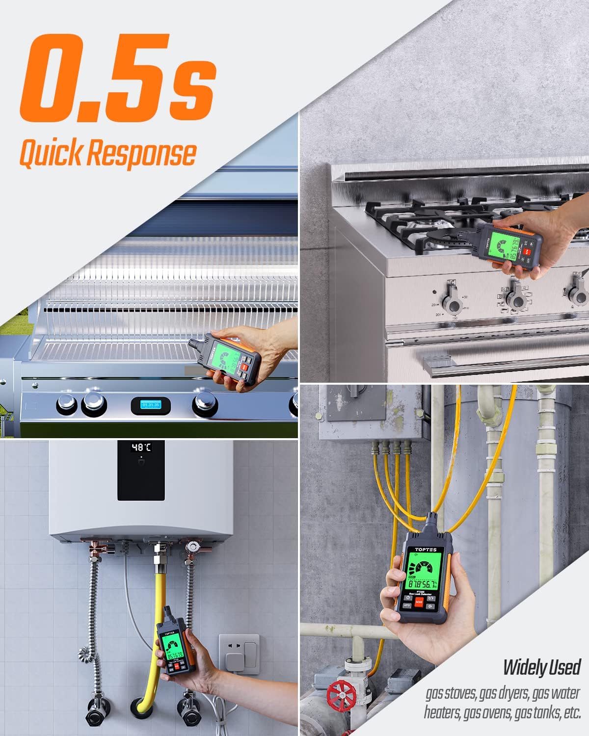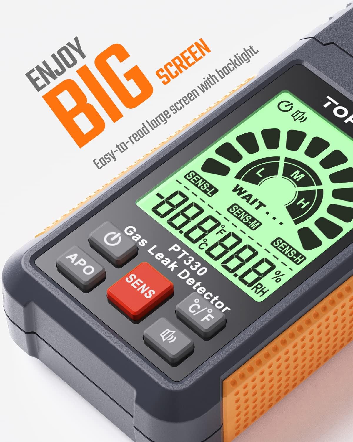 About this itemnHandy Combustible Gas Leak Detector: The TopTes PT330 gas detector helps you to accurately detect and locate combustible gas leaks like LPG, LNG, methane, ethane, propane, butane, natural gas, coal gas, gas fuel, etc. Detection range: 50 to 10,000 ppm (based on Methane)nEasy to Read, Big LCD Screen: The TopTes PT330 features a user-friendly 2.26-inch LCD tricolor screen, where you can easily get the readings. You can accurately pinpoint gas leaks in a gas stove, gas dryer, gas water heater, gas oven, camping cooker, or gas tank. It can reduce the risk of gas explosions and keep your family and property safenQuick Response, Visual and Audible Alarm: With an excellent semiconductor, the TopTes PT330 can react to leaks within 0.5 to 3 seconds. The three-color backlight screen displays the current gas concentration: green for low, orange for medium, and red for high. Leaks can be easily pinpointed as the bar graphs and beep sounds increase with the gas concentrationnUser-Friendly and Energy-Saving: With the Auto Power-Off button, you can switch the auto power-off function on or off. When enabled, the PT330 gas leak detector will turn off after 10 minutes of inactivity to save energy. Additionally, the audible warning alarm can be turned off using the Mute button. High-precision temperature and humidity sensors are also included for measuring gas leaks under different conditionsnWhat You Get: One PT330 Gas Leak Detector, one Storage Bag, three AAA Batteries, and one User Manual. Note: Please allow 30 seconds of warm-up time before operationn See more product details