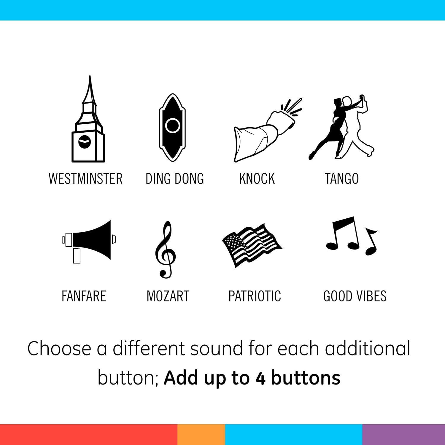 All-in-One Kit One battery-operated receiver featuring up to a 150ft. range, two push buttons with CR2032 batteries and mounting hardware are all includednMelody Selection Choose four volume options and eight melodies, including ding-dong, fanfare, good vibes, knocks, Mozart, patriotic, tango and Westminster, to customize your chimenEasy Installation The indoor doorbell receiver requires three C batteries (not included), the push buttons arrive paired in the package and mounting instructions are providednExpanded Network Up to four GE-branded push buttons (additional buttons sold separately) can be paired to the receiver within the 150ft. range, and a melody can be selected for each button, so you know where to greet visitorsnClassic Style The subtle styling and classic appeal of the bright white doorbell kit make it a must-have for temporary or permanent living spaces, like homes, apartments, college dorm rooms, RVs, businesses, rental units, and moren See more product details