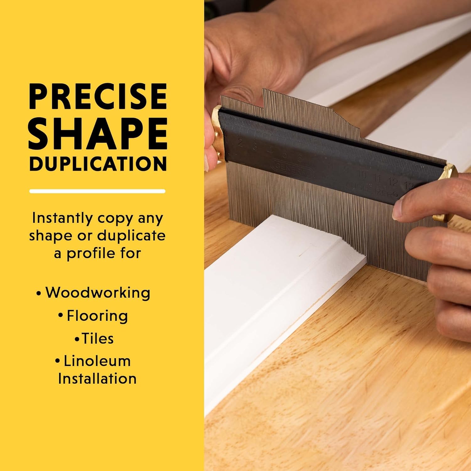 PRECISE SHAPE DUPLICATION: Instantly copy any shape or duplicate a profile for woodworking, tile flooring, and linoleum installation. This ANGLE-IZER tool can replicate the detailed moldings or match cut-outs around door casings and pipes.nPERFECT PROFILE: With 35 leaves-per-inch, our contour gauge duplicator accurately records the cross-sectional shape of any surface. It can measure profiles up to 3