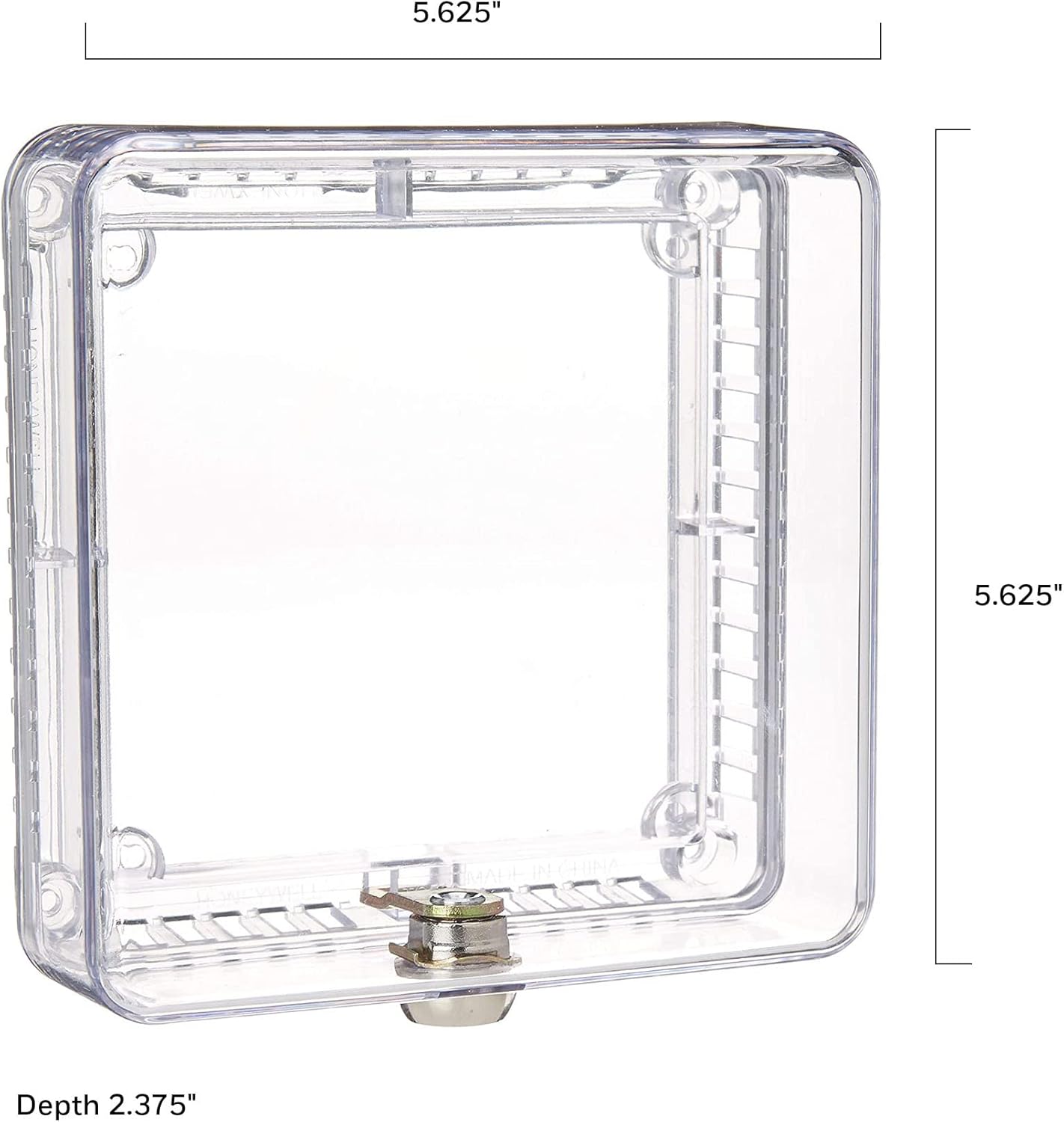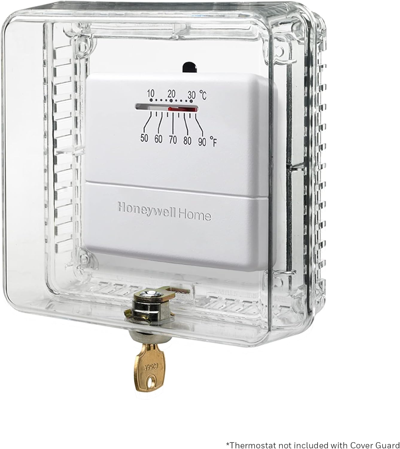 The Small Thermostat Guard protects your thermostat and prevents others from tampering with your heating and cooling options. Fits Thermostats 4.375H x 4.375W inches or smallernThis easy-to-install cover includes a lock and key for complete control, as well as air vents for optimum thermostat performance. Key lock with inner shelf to prevent tampering.nThe clear plastic casing is chemical and UV resistant that resists yellowing.nIdeal for use in a commercial or residential environment.nDesigned to fit over existing thermostat for easy installation.nCover fits Honeywell Home Thermostat models RTH8800WF, RTH8560D, CT87K, CT30A, CT31A, CT33A models without the wall plate.nOutside dimensions: 5.88”W x 5.88”H x 2.50”DnInterior dimensions: 4.44”W x 4.44”H x 2.25”Dn See more product details