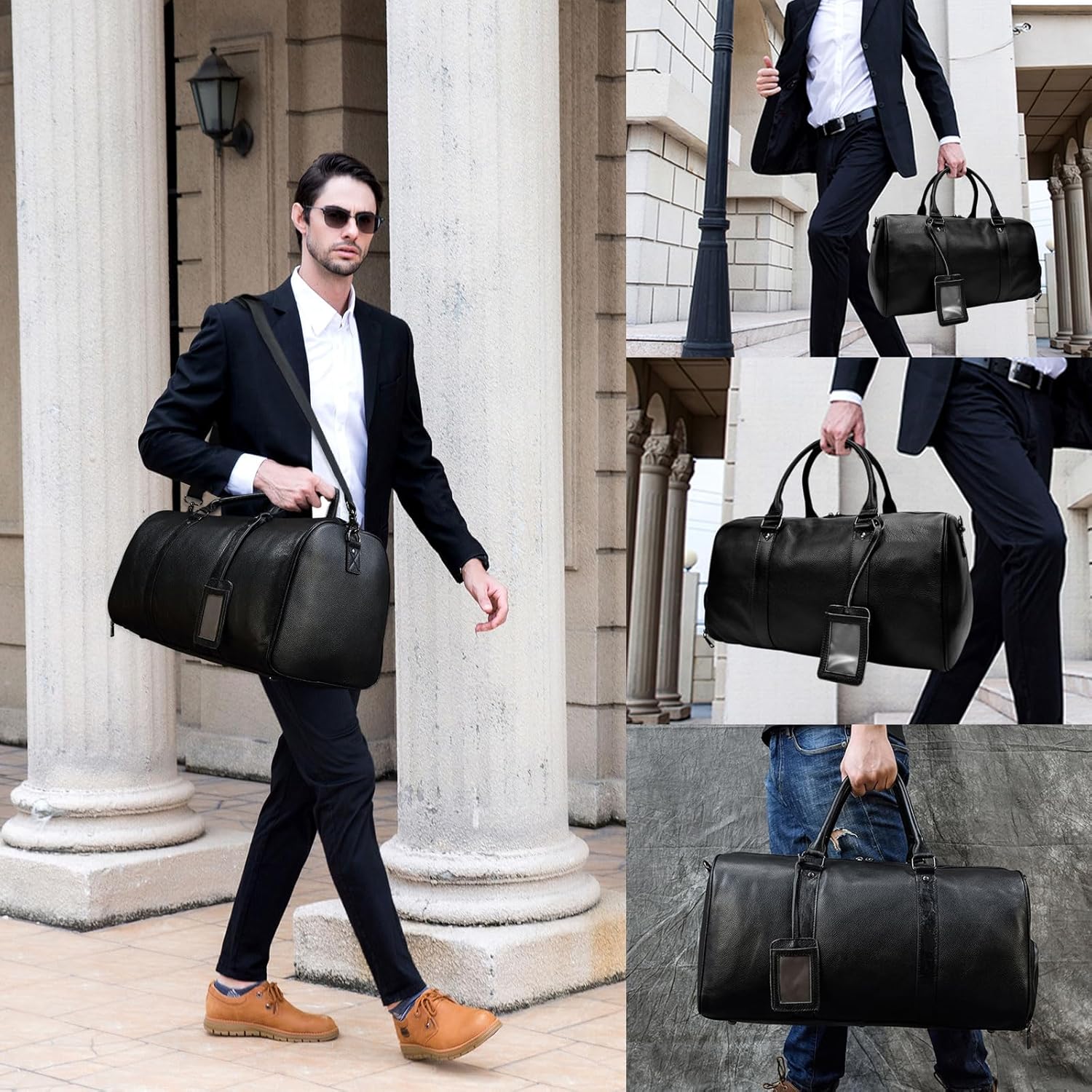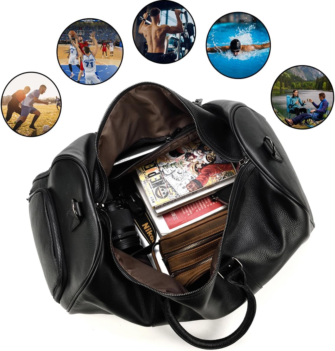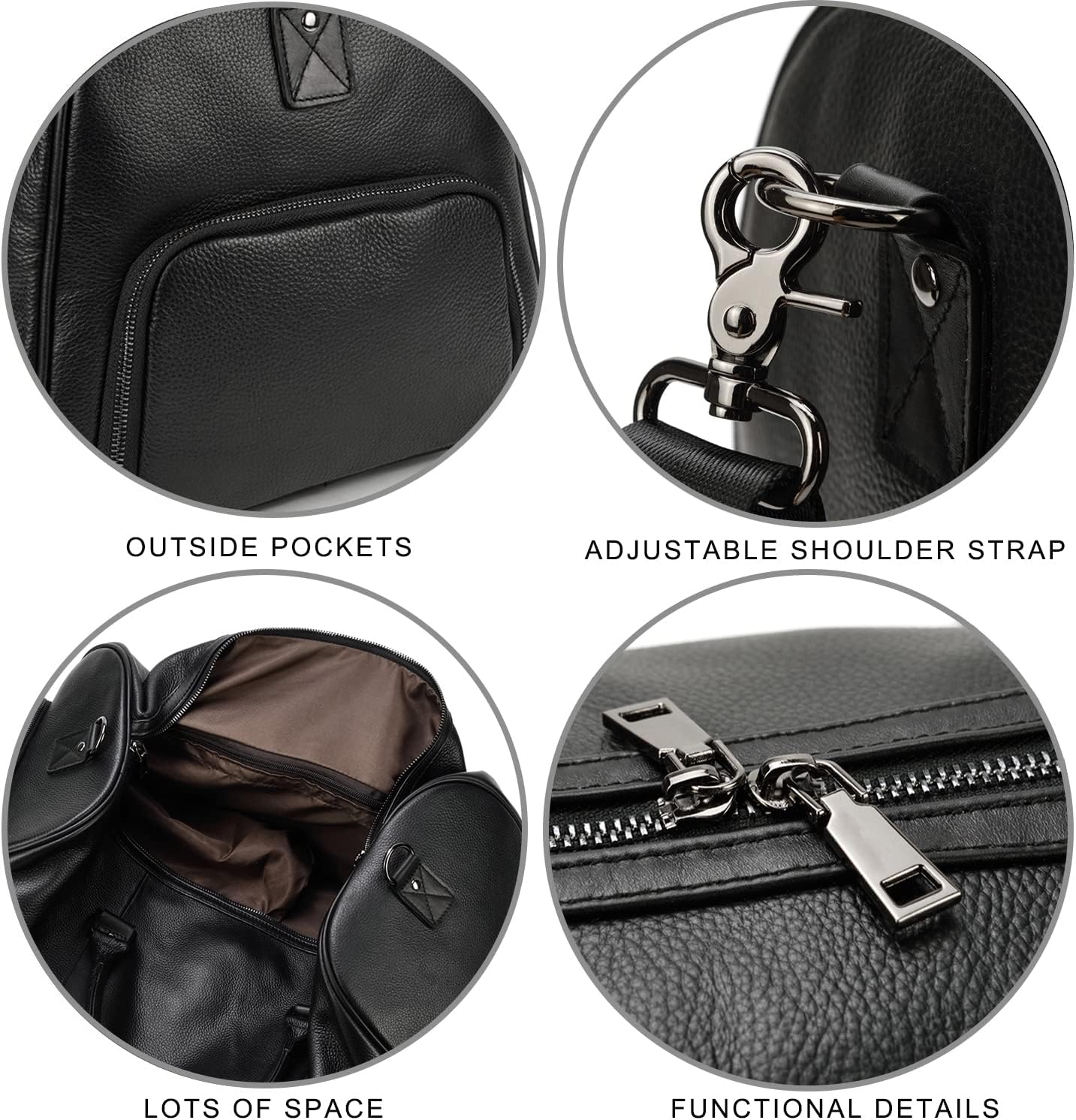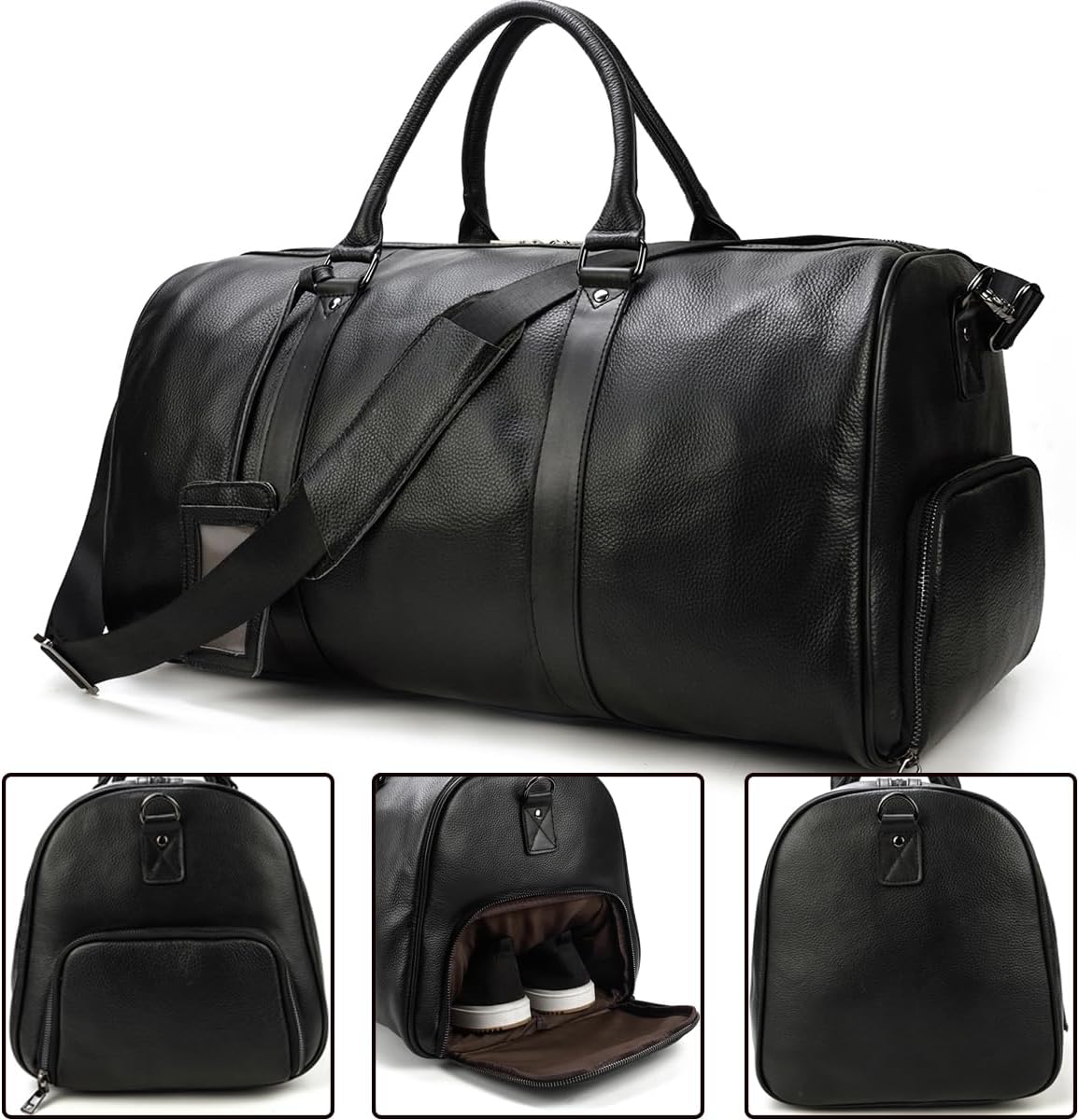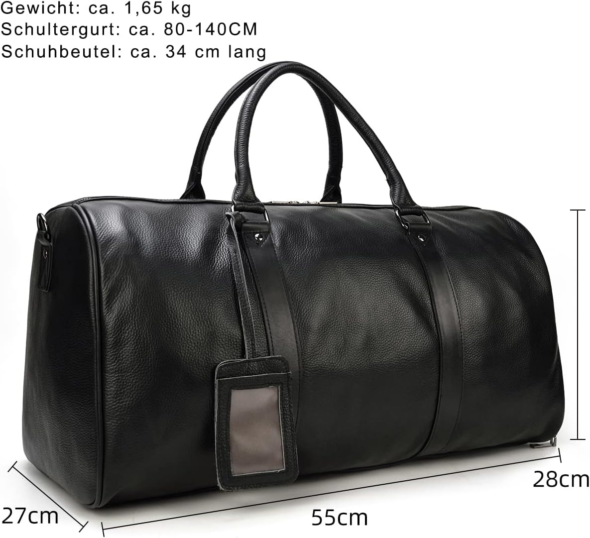 [Size]: (L) 55 x (W) 27 x (H) 28 cm, the length of the shoe bag is about 34. The long shoulder strap is about 80-140 cm. Weight: 1.65 kg.n[Structure]:This travel bag contains 1 large inner pocket(for 15 inch PC,business suits,A3,B4,A4 files and other large items),2 inner zipper pocket(for iPad, iPhone 7plus, wallet and other small items),1 shoe compartment with zipper Removable adjustable shoulder straps are suitable for any body size. It is very spacious and has enough space for everything you wear daily for travel or sports.n[Main Material]:Top quality genuine leather(first layer of cowhide). A modern bag ideal as a sports bag, weekender, leisure bag, leather case, travel bag, outdoor bag, made of cowhide leather with durable lining, zip and metal fittings. Genuine leather, clean workmanship and sturdy zips ensure endurance.n[Large leather weekend bag]: practical interior dividers with plenty of space for clothes, shoes, towels, books and toiletry bag.n[Suitable]: This leather bag is a good choice for weekend trip, business trip, vacation and sports/fitness.