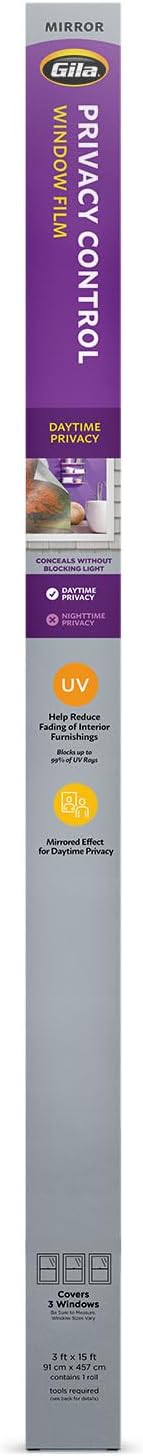 About this itemnDAYTIME PRIVACY: Mirrored exterior appearance provides daytime privacy (when the sun is down and lights are on inside, film no longer conceals views)nENERGY EFFICIENT: Rejects up to 79% of total Solar EnergynPROTECTS INTERIORS: Blocks up to 99% of UV rays, helping to keep your interior from fadingnINCREASED COMFORT: Reduces glare up to 82%, making interiors more comfortablenEASY INSTALL, LASTING RESULTS: Durable adhesive material is easy to handle and firmly sticks to windows for ongoing benefitsn› See more product details