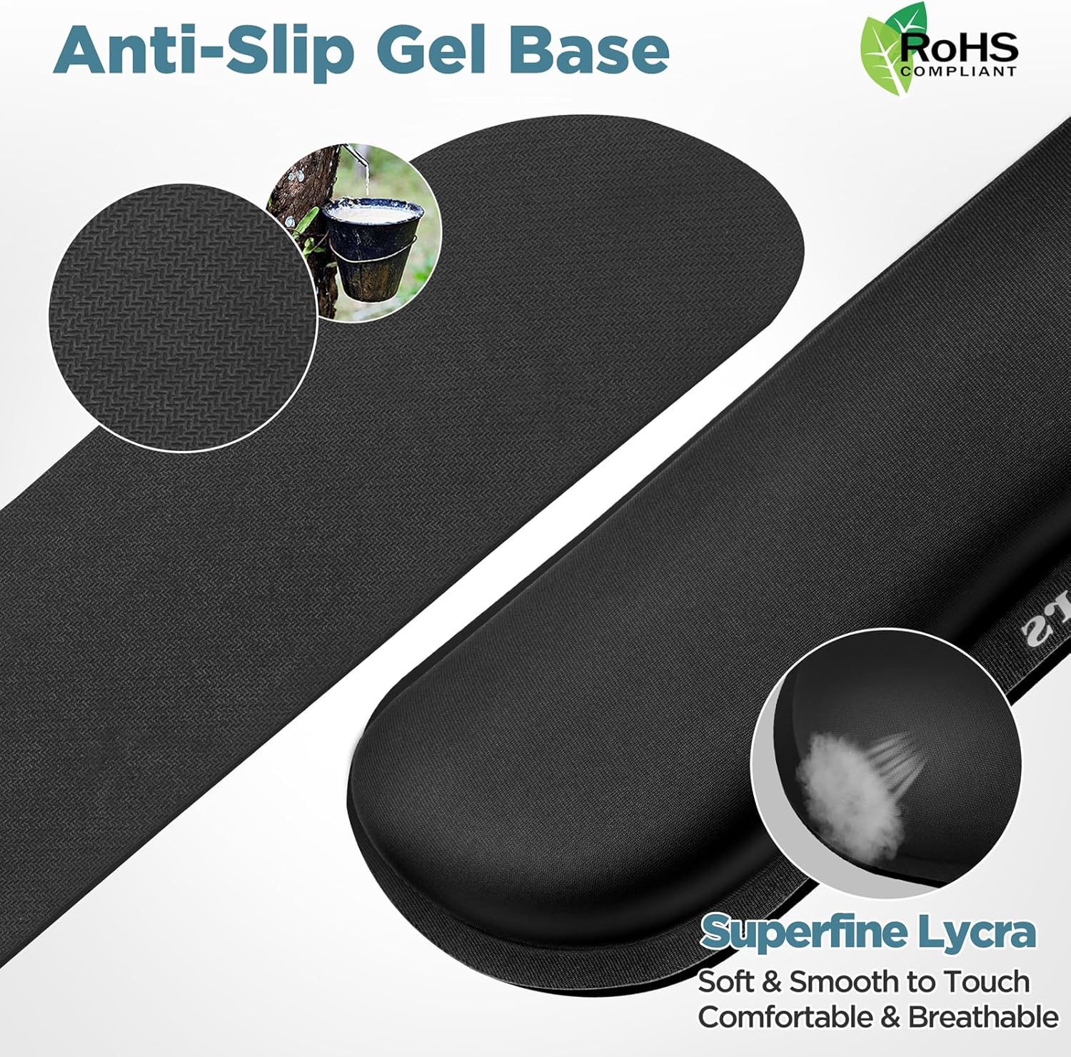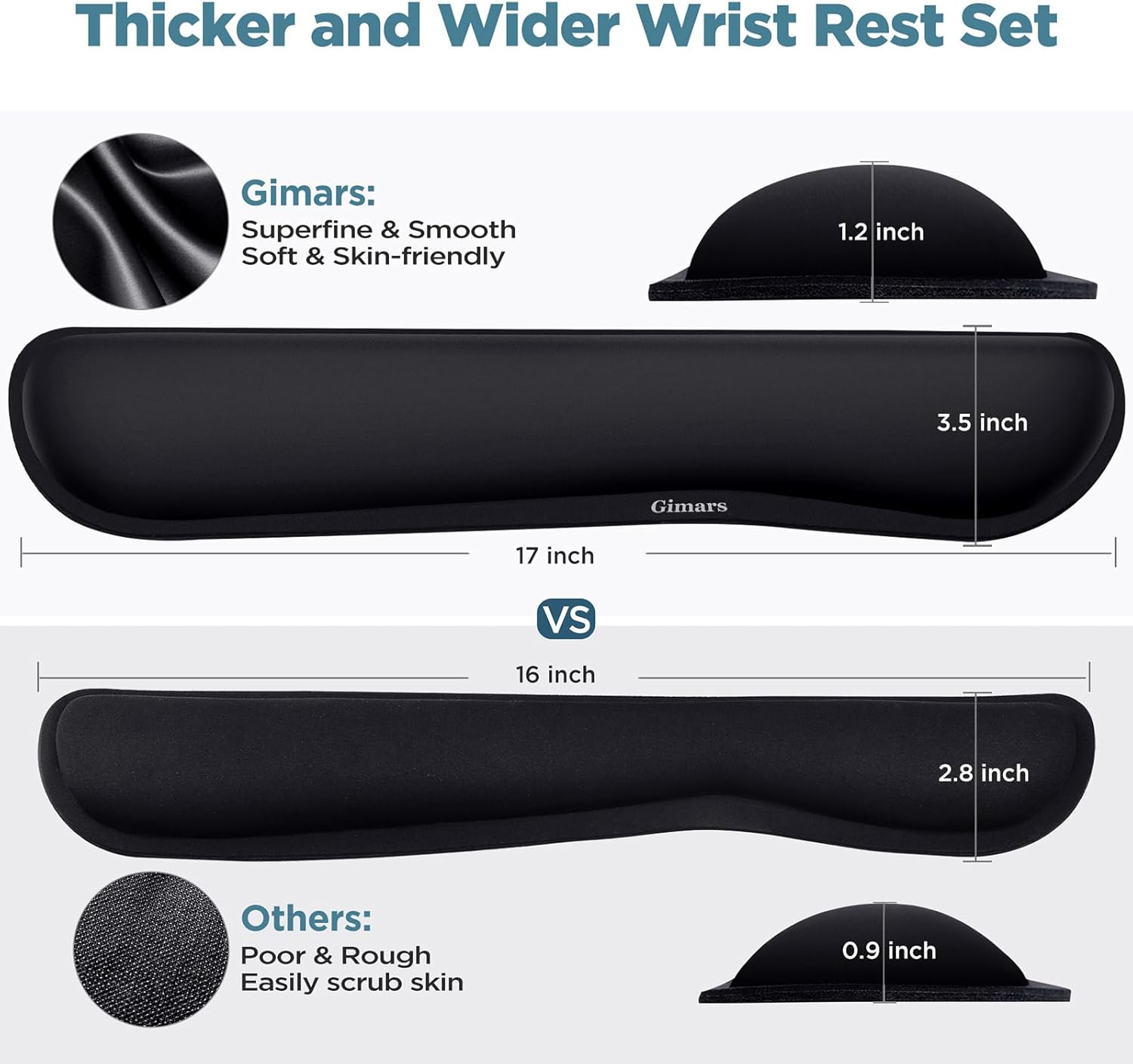 About this itemnMORE COMFORTABLE & SUPPORTIVE: We have newly upgraded the softness of the memory foam in the keyboard wrist rest; the inner cushion is now made of more comfortable and highly resilient memory foam, which is much softer and supportive than other products on the market, can rebound slowly and is not easy to deform; the surface is made of smooth and breathable spandex material, providing you with lightweight, comfortable, durable and skin-friendly touch, ideal for long time usenULTRA THICK & LARGE MEMORY FOAM: 17*3.5*1.2 inches keyboard wrist rest and 6.3*3.3*1.2 inches mouse wrist rest fits most computers and laptops; after years of sales experience and statistics, the 1.2inch Gimars wrist rest height is the most suitable height to keep your wrist and palm & arm at the same level; it improves forearm and wrist posture, avoids joint and wrist problems, and releases pressure on elbows and shoulders during prolonged computer usenERGONOMIC DESIGN: the groove design on the mouse wrist rest fits your hand better; no deformation of the keyboard pad, static when typing; our products are ergonomically designed to relieve typing pain and carpal tunnel syndrome, and can be used in a variety of scenarios, such as home, office, Internet cafes, etcnNATURAL NON-SLIP BASE & STICKERS: the non-slip rubber base provides a strong grip and prevents the keyboard and mouse pad from sliding; package also comes with small anti-slip stickers/pad that you can stick on the bottom, two anti-slip designs keep the wrist pad firmly gripping the desktop; double bonding and pressing technique makes the edges flat and smooth, won’t roll or split, let you focus on your worknWE CARE YOUR HEALTH & PURCHASE EXPERIENCE: keep your wrists straight and relieve wrist pain in gaming, working and studying; it is an essential accessory for people who use computers and type a lot, and a great choice to your family, friends and students; our support team will provide you with a 24-hour reply; if you have any questions, please let us know