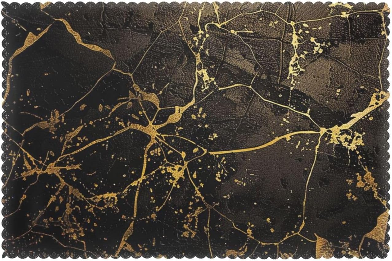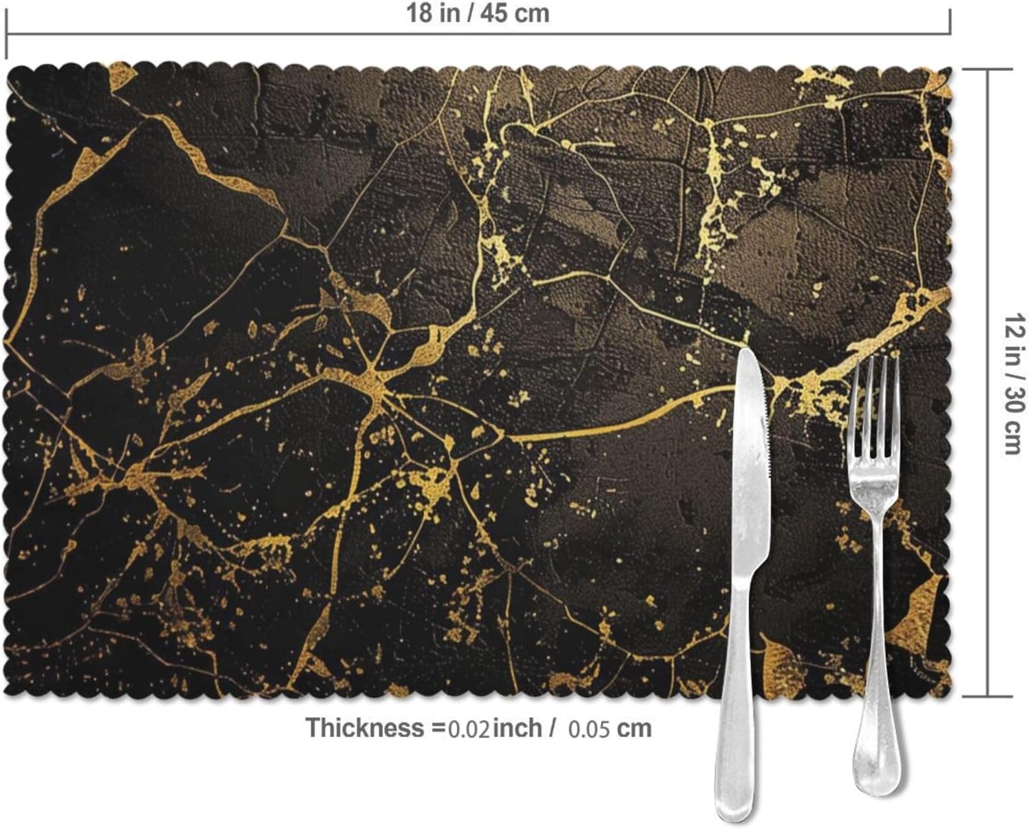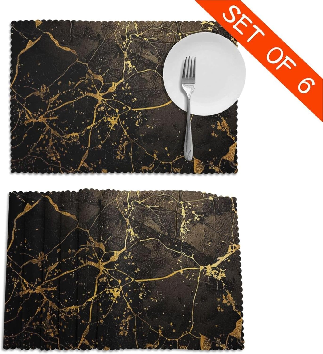 Gold Black Wallpaper Printed Heat Resistant Placemats 6 PCS – Non-Slip Washable Kitchen Table Mats for Dining, Parties & More (18x12in, Polyeste)