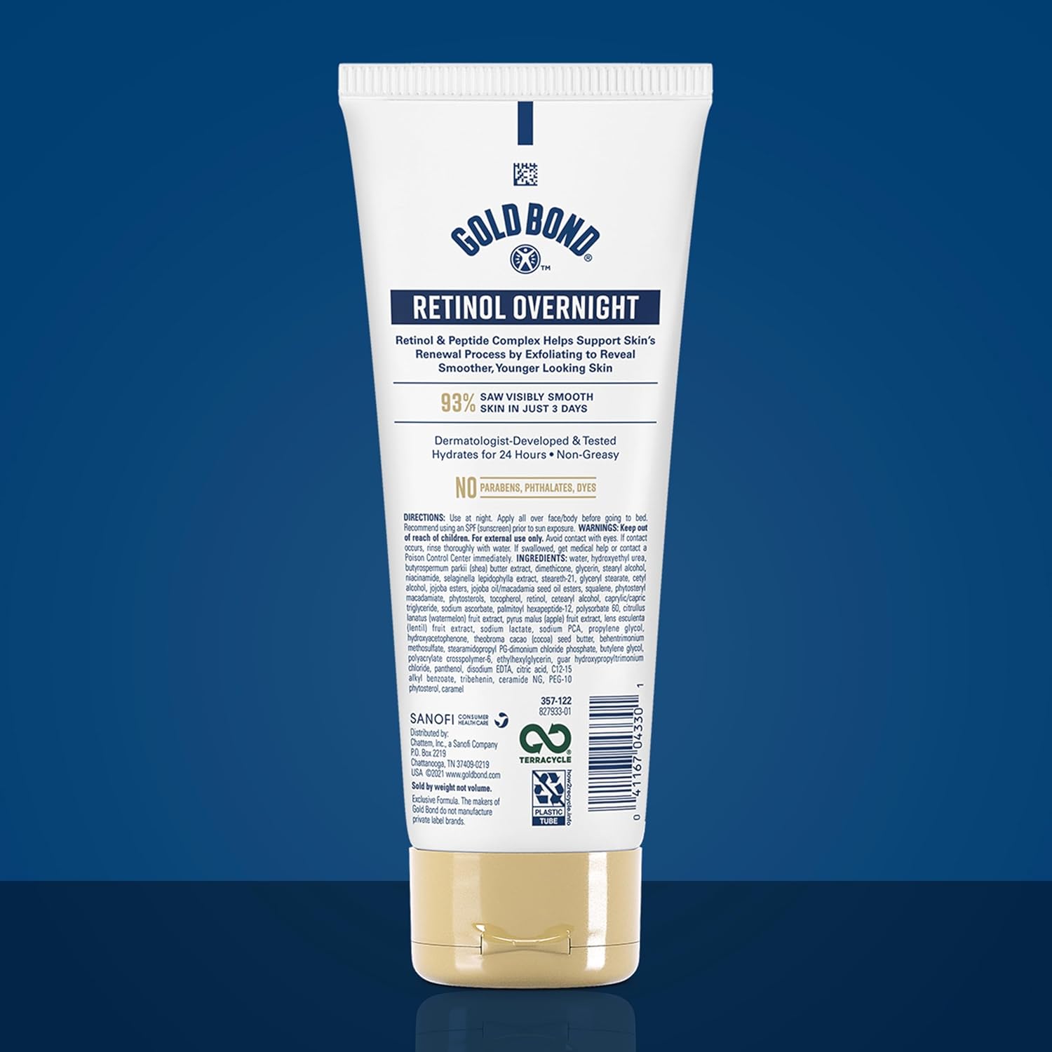 About this itemnContains one (1) 7-ounce tube of Gold Bond Age Renew Retinol OvernightnContains retinol to help visibly tighten and lift skin for a more youthful appearancenClinically shown to firm the look of skin in one weeknHydrates skin for 24 hours with nourishing shea and cocoa butternGold Bond Age Renew Retinol Overnight lotion is for everyday use on body and facenHypoallergenic lotion is free from parabens, phthalates, dyes, and no fragrance