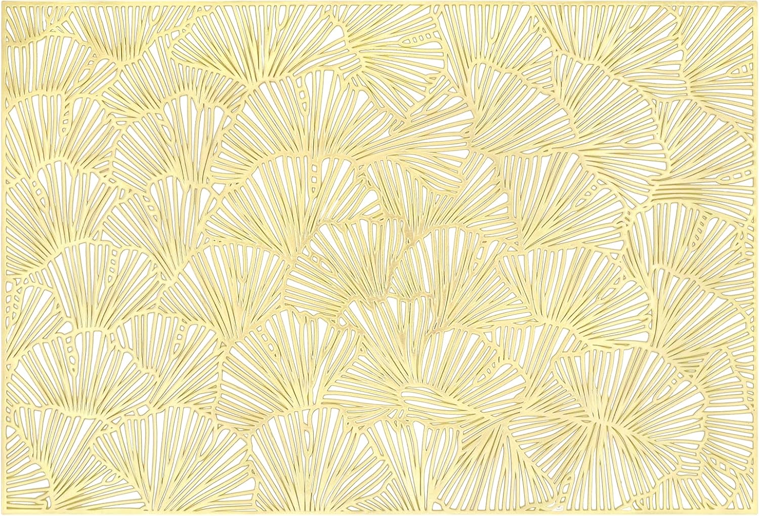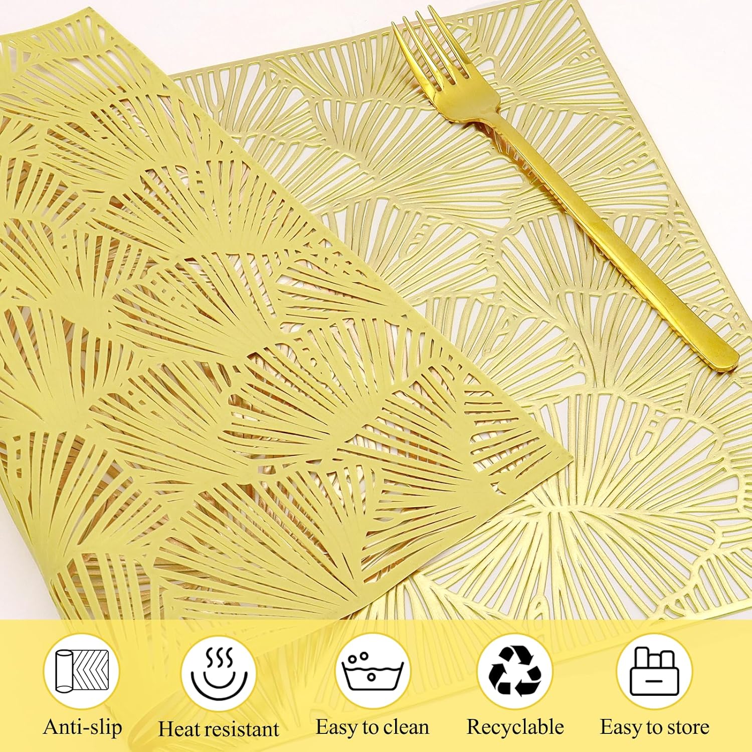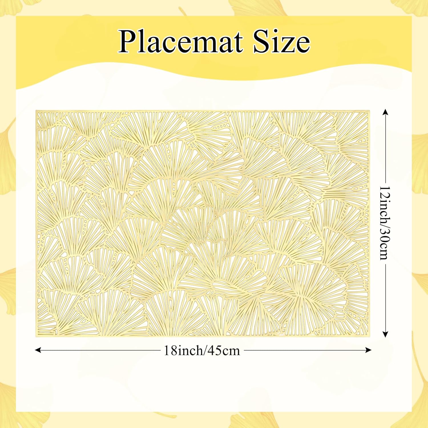 About this itemnSet of 6 Gold Placemats: Gold ginkgo leaf hollow design, simple and elegant placemats make you feel happy when dining and impress your guests.nMaterial: Ginkgo leaf table mat is made of pressed vinyl material, easy to clean, wipe it clean with a damp cloth, and washable.nDecorate your dining table: Placemats not only protect the surface of the tabletop and reduce noise from plates and cutlery, but also add a wonderful atmosphere to your table, or serve as a decorative center for any place you like.nSuitable for various occasions: Red snowflake placemats can provide high-quality decoration and quality of life for families, restaurants, kitchens, hotels, coffee shops, business offices, etc. Great for Christmas, Halloween, Thanksgiving, housewarming, wedding, birthday, holidays, parties, family gatherings, showers table decor.nWhat You Will Get: 6 pieces gold ginkgo leaf placemats, 12X18inch(30X45CM).
