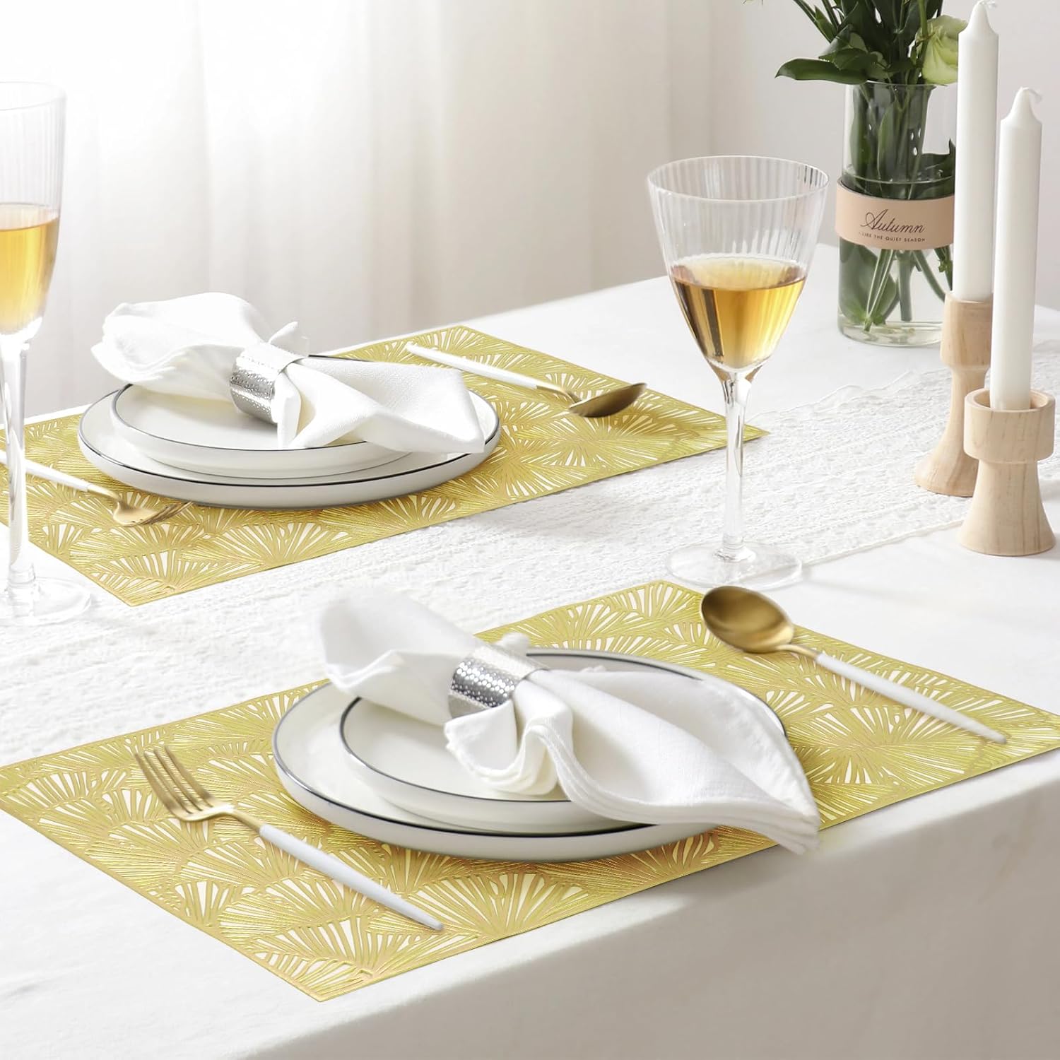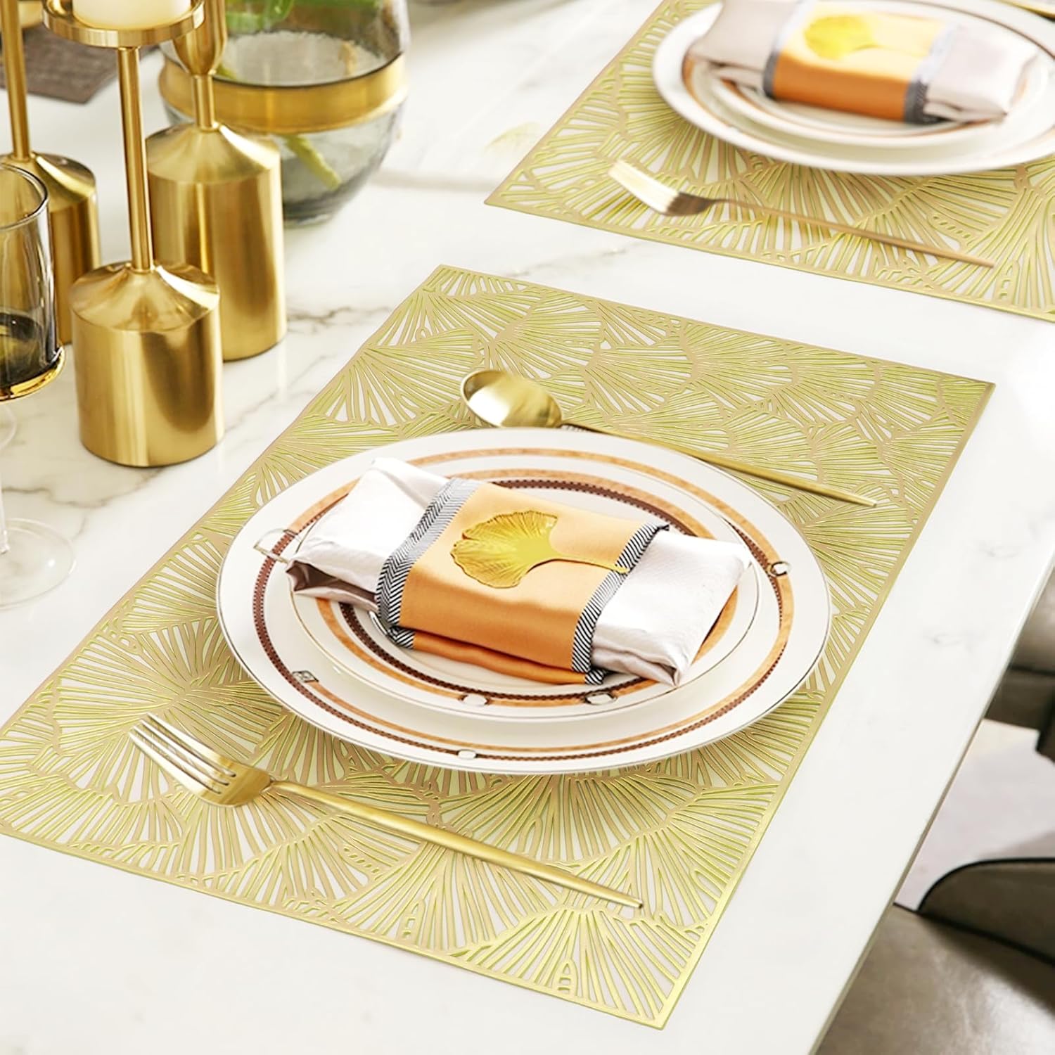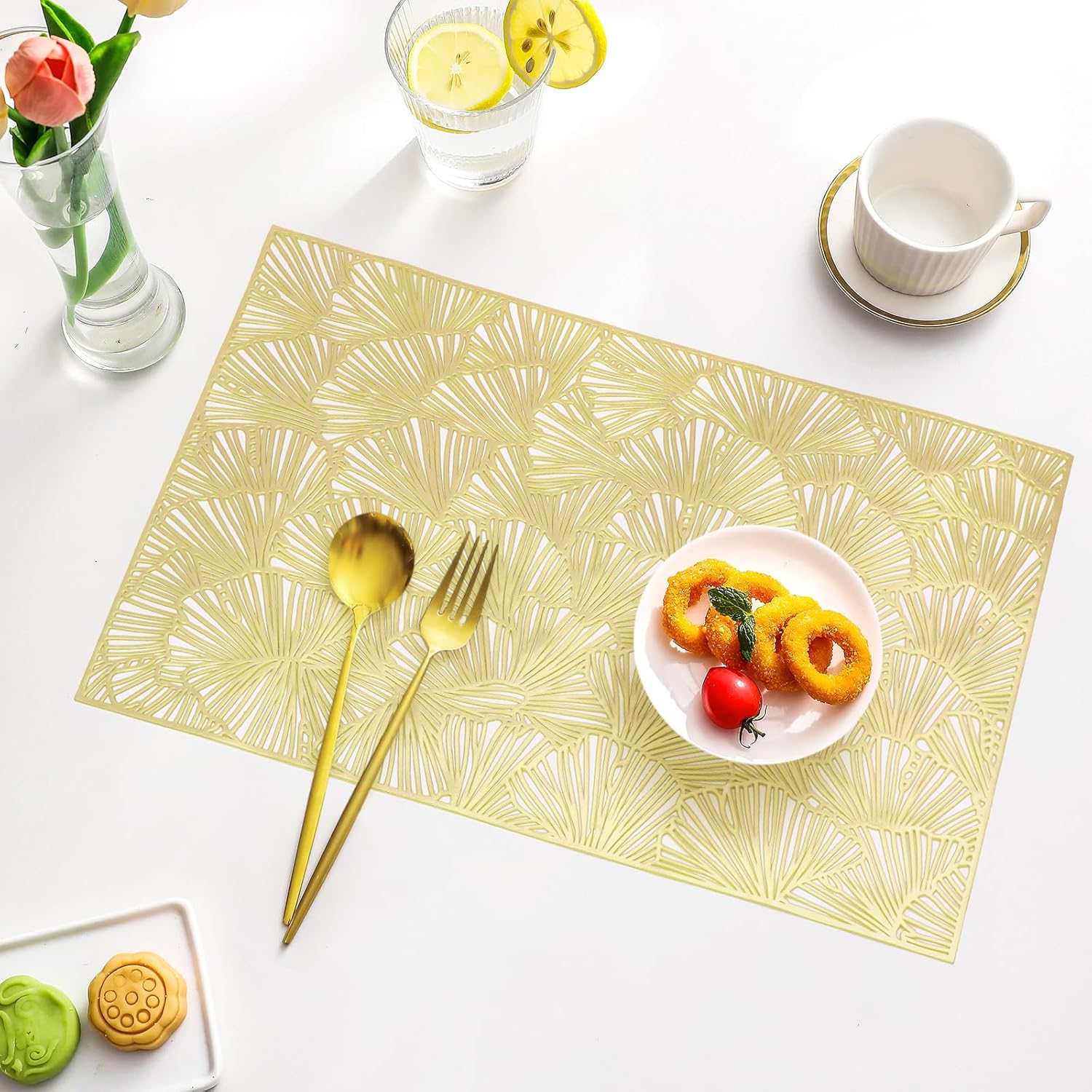 About this itemnSet of 6 Gold Placemats: Gold ginkgo leaf hollow design, simple and elegant placemats make you feel happy when dining and impress your guests.nMaterial: Ginkgo leaf table mat is made of pressed vinyl material, easy to clean, wipe it clean with a damp cloth, and washable.nDecorate your dining table: Placemats not only protect the surface of the tabletop and reduce noise from plates and cutlery, but also add a wonderful atmosphere to your table, or serve as a decorative center for any place you like.nSuitable for various occasions: Red snowflake placemats can provide high-quality decoration and quality of life for families, restaurants, kitchens, hotels, coffee shops, business offices, etc. Great for Christmas, Halloween, Thanksgiving, housewarming, wedding, birthday, holidays, parties, family gatherings, showers table decor.nWhat You Will Get: 6 pieces gold ginkgo leaf placemats, 12X18inch(30X45CM).