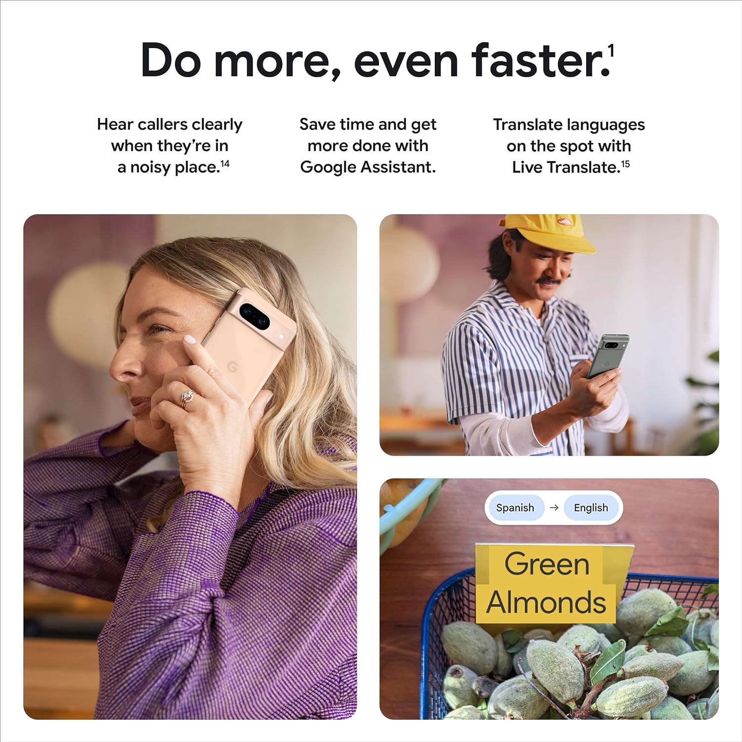 About this itemnPixel 8 is the helpful phone engineered by Google; the new Google Tensor G3 chip is custom-designed with Google AI for cutting-edge photo and video features and smarter ways to help[1]nUnlocked Android 5G phone gives you the flexibility to change carriers and choose your own data plan[2]; it works with Google Fi, Verizon, T-Mobile, AT&T, and other major carriersnGoogle Pixel 8 has a fully upgraded camera with advanced image processing to reveal vivid colors and striking details; and now with Macro Focus, even the smallest subjects can become spectacular imagesnThe 6.2-inch Pixel 8 Actua display is super sharp, with rich, vivid colors; its fast and responsive for smoother gaming, scrolling, and moving between apps[3,4]nPixels Adaptive Battery can last over 24 hours; when Extreme Battery Saver is turned on, it can last up to 72 hours[5]; and it charges faster than ever[6]