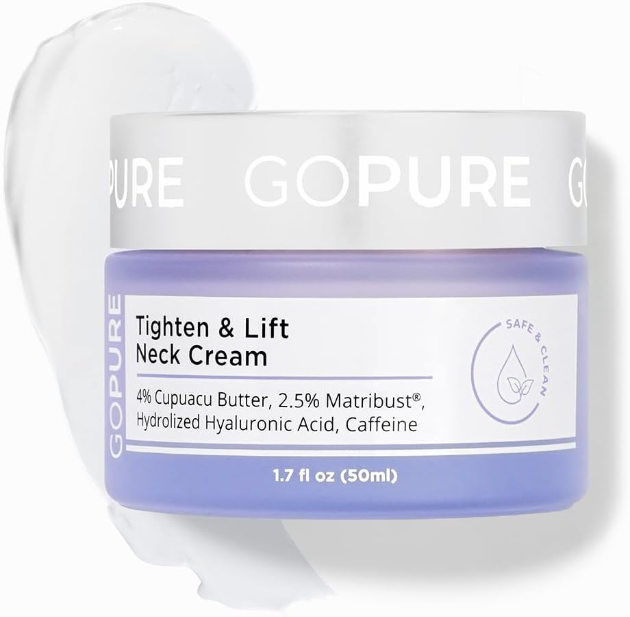 About this itemnFIRM, LIFT, & TIGHTEN: Our goPure Neck Firming Cream is specially formulated to target and combat sagging skin on the neck and chest, providing a visibly firmer and more lifted appearance; giving the impression of wrinkle filler, even for deep wrinkles.nACHIEVE THE LOOK OF EVEN SKIN TONE: Experience the power of our neck tightening cream as it works to promote a more even skin tone, reducing the appearance of discoloration, “turkey neck” and visually lifting sagging skin.nNECK AND CHEST FIRMING: Extend the benefits beyond your neck with our versatile formula. Our neck and chest firming cream helps improve the appearance of sagging skin in both areas, enhancing your overall youthful look.nWith goPure’s Neck Firming Cream, you can look forward to a softer and smoother looking neck! Our potent ingredients work together to reduce the appearance of lines and wrinkles and reveal an even skin tone.nALL NEW PACKAGING: Experience the goPure glow up! Same formulas you love in all-new packaging.