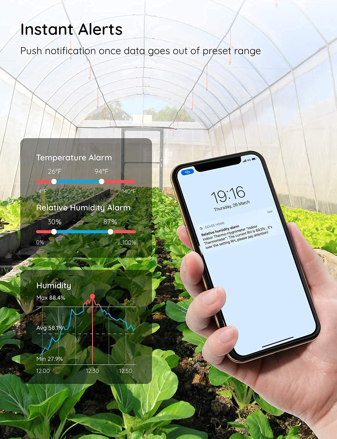 About this itemnSmart Features: The Govee Wireless Thermometer Hygrometer supports all basic functions as well as smart functions such as remote monitoring and temp humidity graphs. Our humidity meters are reliable and easy to use for homes, greenhouses and more.nHigh Accuracy and Fast Refresh Time: With the Swiss-made smart hygrometer sensor, the temperature is accurate up to ±0.54°F while the humidity is ±3%RH, a 40% increase. Up to 2S refresh speed always gives you the lastest changes of temp and humidity.nUpgraded Display: This room humidity gauge is easy to read due with a 3-inch bright LCD screen with large numbers. The max/min temp humidity records and the comfort indicators (dry/comfort/wet) will keep you aware of the indoor humidity at any time.nSmart App Alerts: You’ll receive an instant alert once the temperature or humidity is out of its preset range. Know the status of your bedroom, baby room, wine cellar, basement, plant nursery or other areas, even when you’re not beside the device.nFree Data Storage: Make plans according to historic temp and humidity data. The 20-day curve graphs provide a clear data-changing track. You can export data from the past 2 years and convert it to a CSV format. Stay on track of your daily routine.
