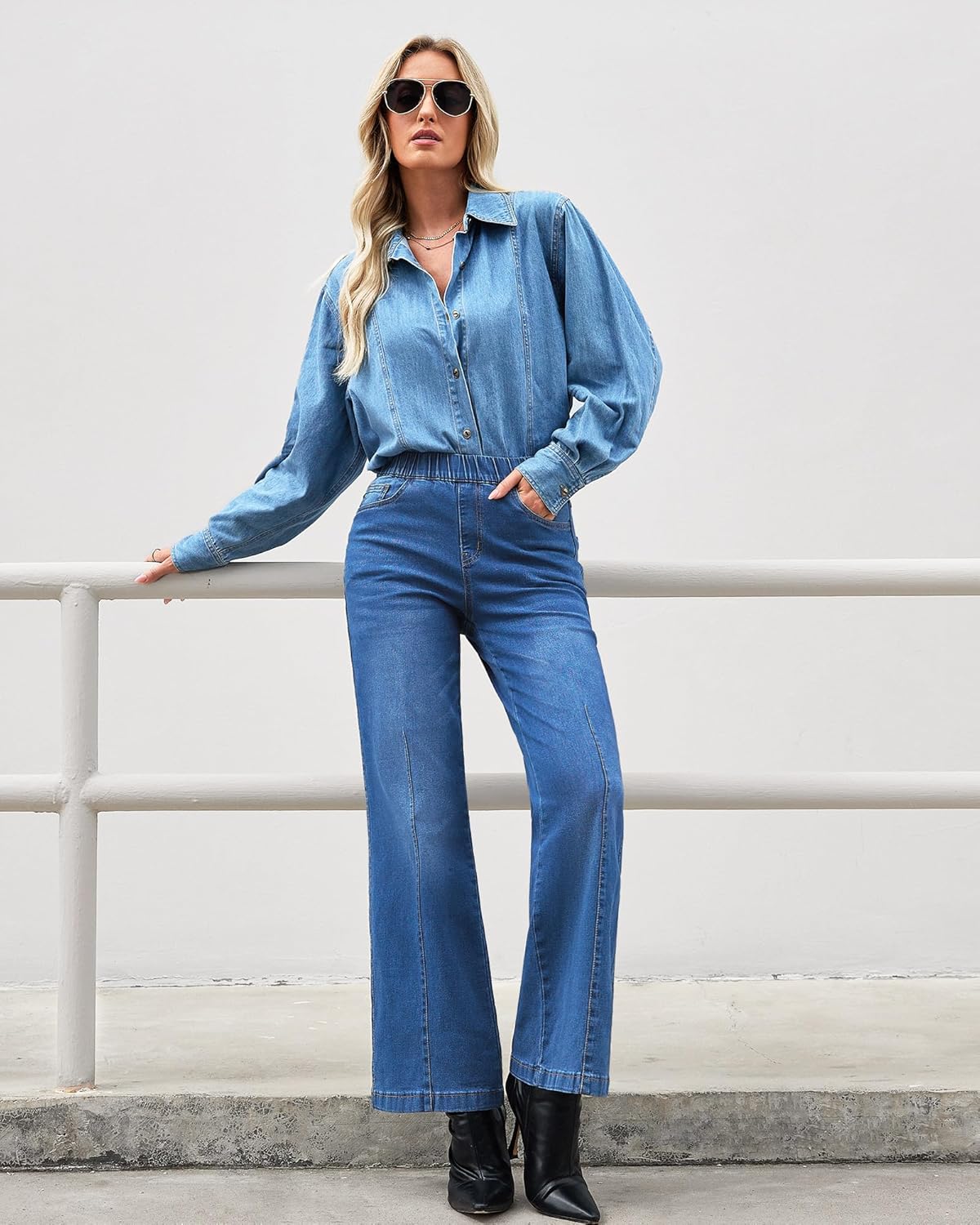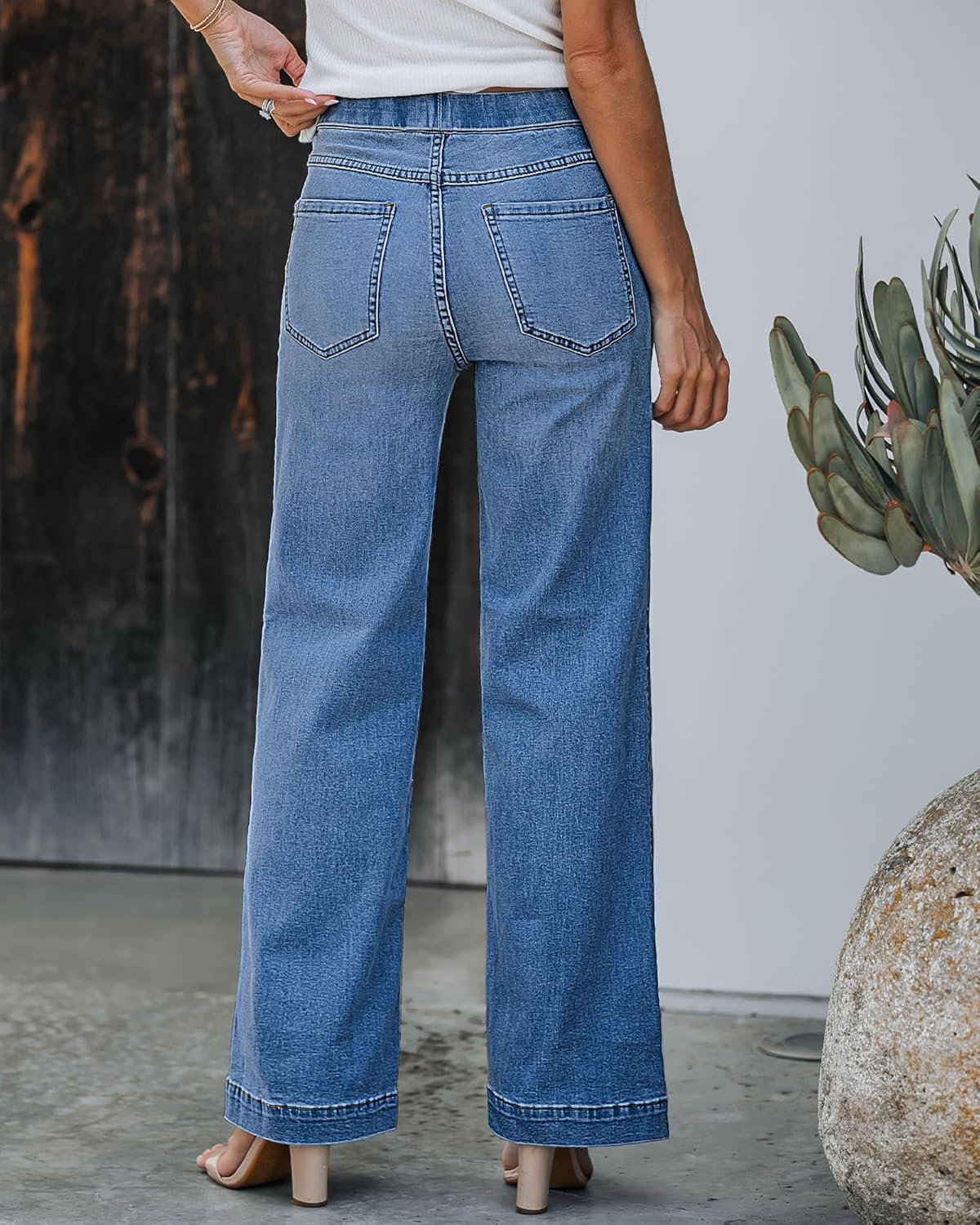 GRAPENT Pull On Womens Jeans Baggy Stretchy High Waisted Denim Wide Leg Trouser Pants Trendy Front Seam 90s Loose Jean