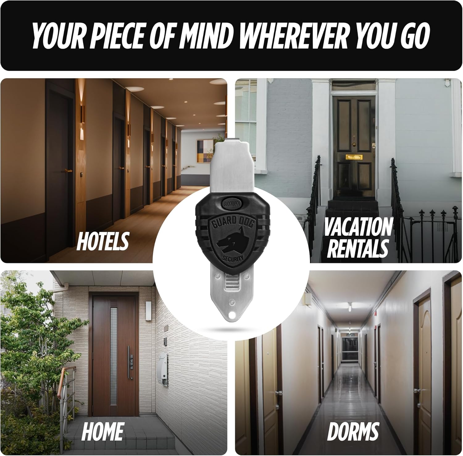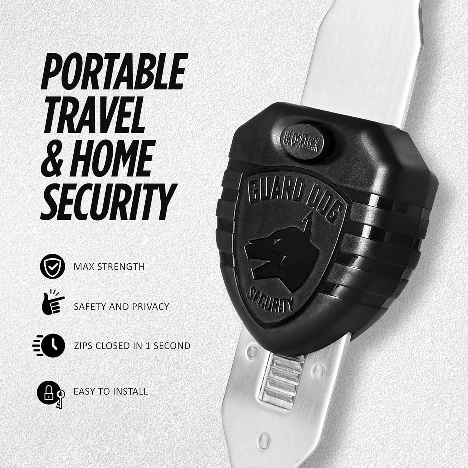 Enhanced Security Anywhere: Protect yourself with this portable door lock, designed for travelers, renters, and anyone seeking enhanced privacy. This compact lock provides reliable safety for homes, hotels, and shared spacesnQuick and Tool-Free Setup: Installation and removal are quick and easy, requiring no tools. Just insert the metal piece into the slot of the door lock, close the door and secure the handle groove to the stud on the metal sheet. Even in emergency situations or the dark, the lock can be installed within secondsnDurable Construction: Made from high-quality stainless steel. Guard Dog Security lock door device is built to withstand force, ensuring reliable protection against intruders. The steel surface is electroplated and polished for a smooth touch, minimizing the risk of injurynVersatile Use: This lock is ideal for renters, students, travelers, and more. Its perfect for use in hotels, dormitories, apartments, short-term rentals, Airbnbs, bathrooms, bedrooms, or private rooms. It can even help prevent pets from going out or children from opening doors to strangersnPocket-Sized Convenience: Lightweight and compact, the Blocklock easily fits into your bag or pocket, making it a travel essential for business trips, vacations, or solo adventures. Its universal fit ensures it works with most doors, though tight-fitting doors may require adjustmentsn See more product details