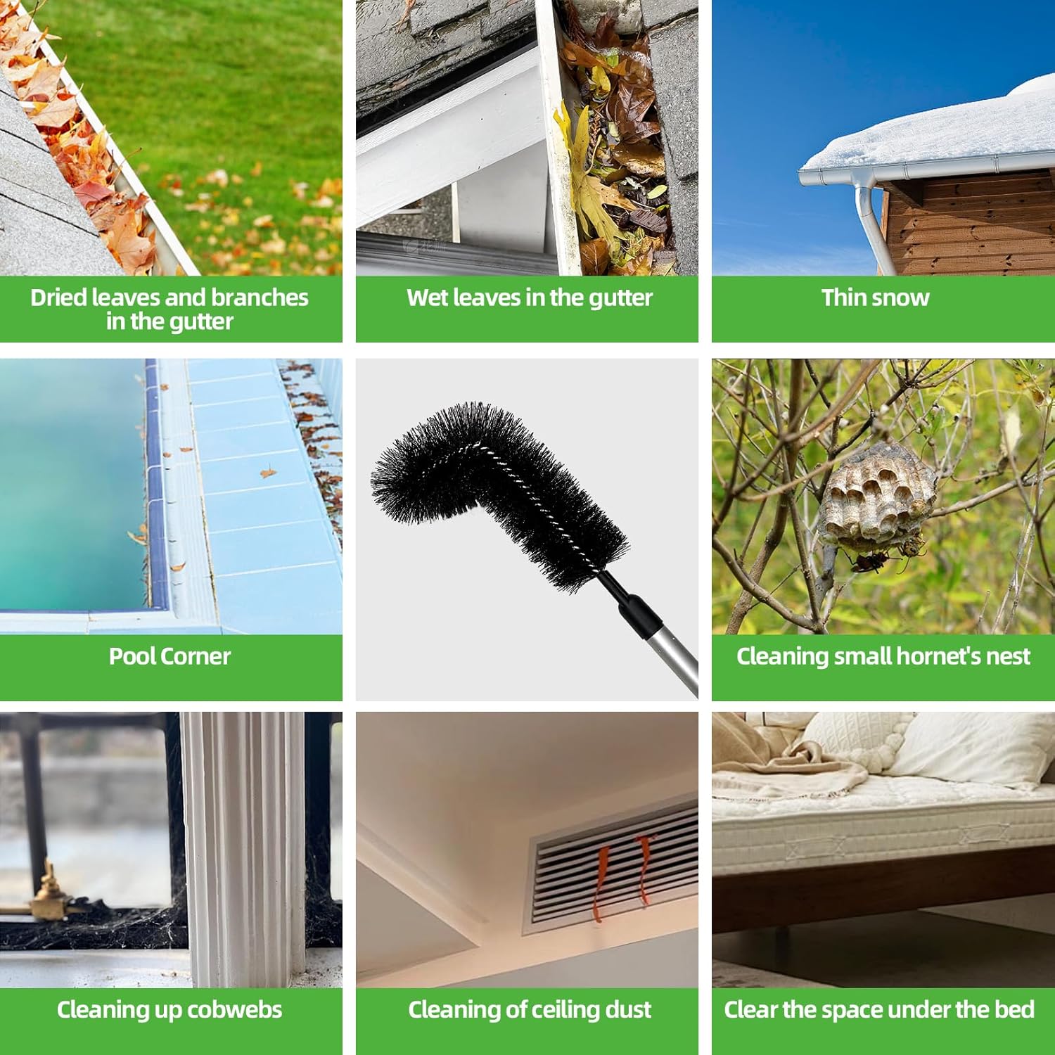 About this itemn?Gutter Cleaning Tools with Fully Accessories?You will receive a set of Gutter Cleaning Tools. Including 11 Aluminium Alloy Material Tubes & 1 Nylon Soft Brush & 1 Nylon hard Brush. You are able to clean the gutter from the ground without resorting to dangerous ladders after using it.n?Cleanup Tools Optimized for Length and Weight?The Gutter Cleaning Tools maximum length is up to 14ft / 430 cm. The length consists of 11 extension tubes, and you are free to combine the lengths as required. It is 4ft / 120cm longer than others in its class.n?Material upgraded gutter brushes?The Gutter Cleaning Tools are made of Nylon and Aluminum. These materials not only make it tough and durable, but also lighter in weight. These upgrades makes it easier for you to use.n?Safer Gutter Brush?We switched to an inline connection that doesn’t allow for dangerous scenarios of bolts chipping off. In addition, our longer cleaning brushes can reach higher. Safety is at the core of our tool design.n?Multifunctional Gutter Brush?This brush tool allows you to adjust the angle of the brush head (which can be a bit fiddly for sturdiness) for a variety of scenarios. For example, gutters, ceilings, tops of furniture, even under beds or cleaning swimming pools.