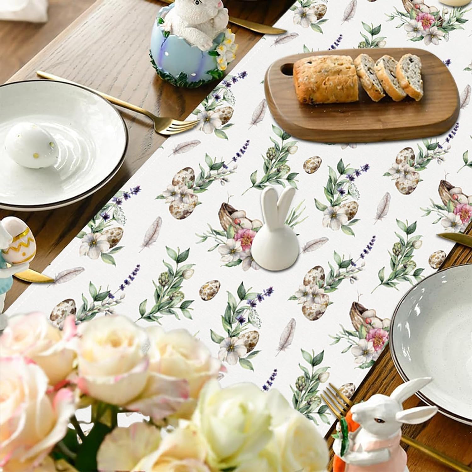 Happy Easter Table Runner Bunny Rabbit Eucalyptus Eggs Flowers Pattern Table Runners 72 Inches Long Spring Seasonal Holiday Kitchen Dining Table Decoration for Indoor Outdoor Home Party Decor (#09)