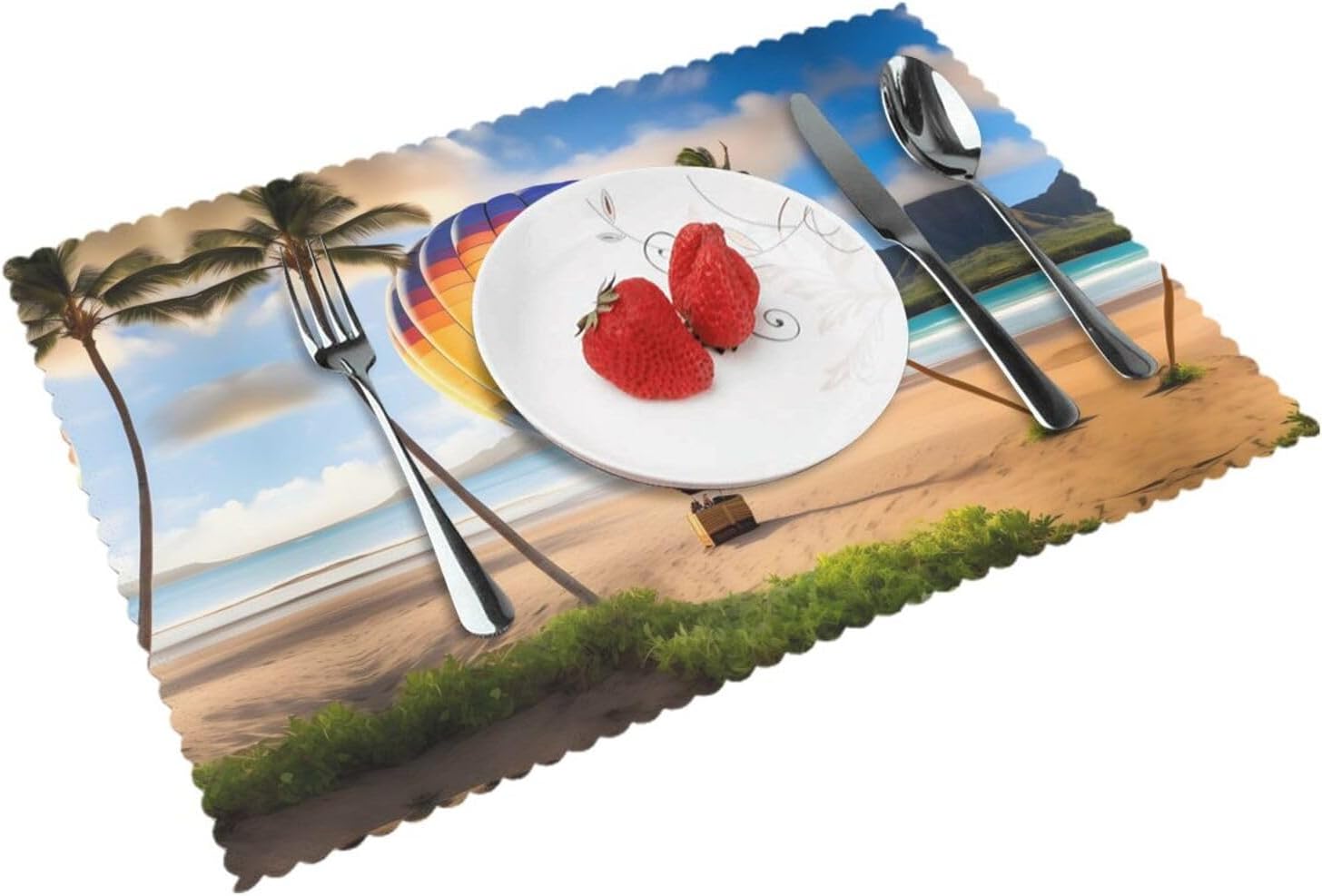 About this itemnHawaii Hot Air Balloon 4-piece insulated placemat set: This 4-piece placemat has a beautiful pattern to enhance the dining atmosphere. The polyester material is strong and wrinkle-resistant, protects the tabletop, and buffers the friction of tablewarenHeat-resistant and durable: The placemat is heat-resistant up to 176°F, strong and wear-resistant, and wrinkle-resistant. It can cope with various challenges, protect the tabletop, and is suitable for a variety of occasions.nEasy to store: It can be rolled up or stored flat, with a unique design. It does not take up space, is easy to carry, and can adapt to different scene requirements.nWidely applicable scenarios: Suitable for restaurants and kitchens, can decorate and protect the tabletop. The 4-piece set can be flexibly combined to meet different decoration needs.nNormal temperature cleaning: Cleaning is simple and convenient, just wipe with a damp cloth or rinse with water. The polyester material is waterproof, dries quickly, and is easy to maintain.