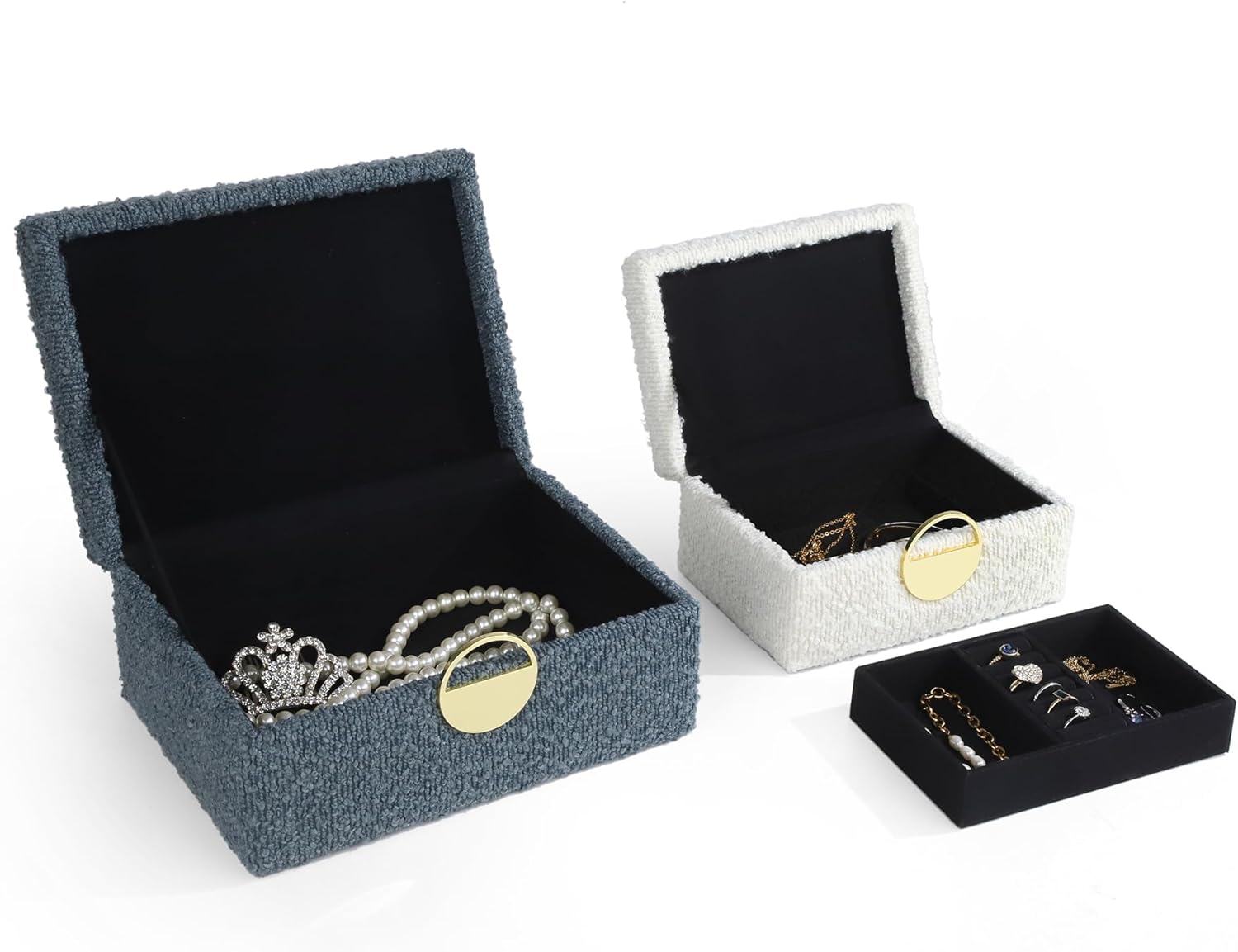 About this itemnHIGH-QUALITY MATERIALS: Beautiful boxes are handcrafted very well, wood construction covered with high quality velvet, lined with soft velvet,keep your favorite items away from scratches and dust, this Box has a luxurious appearance. And can be used for a long time.nELEGANT DESIGN: These boxes feature an elegant handle and a beautiful design that will complement any room decor. They are perfect for storing jewelry and other small accessories.nMULTIPURPOSE: These boxes can be used for a variety of purposes, such as storing jewelry, watches, earrings, necklaces, bracelets, and other small items. They are also great for holding makeup brushes, hair accessories, and other beauty tools.nEach box provides plenty of space for your accessories. The set includes two boxes, each with a different interior structure. Set of 2 nested Boxes size: L: 9 x 6.5 x 3.9inches S: 6.9 x 4.7 x 3.2 inches.nSATISFACTION GUARANTEED: HofferRuffer is committed to providing high-quality products and excellent customer service. If you are not satisfied with our Velvet Decorative Boxes, please contact us directly, and we will make it right.n› See more product details