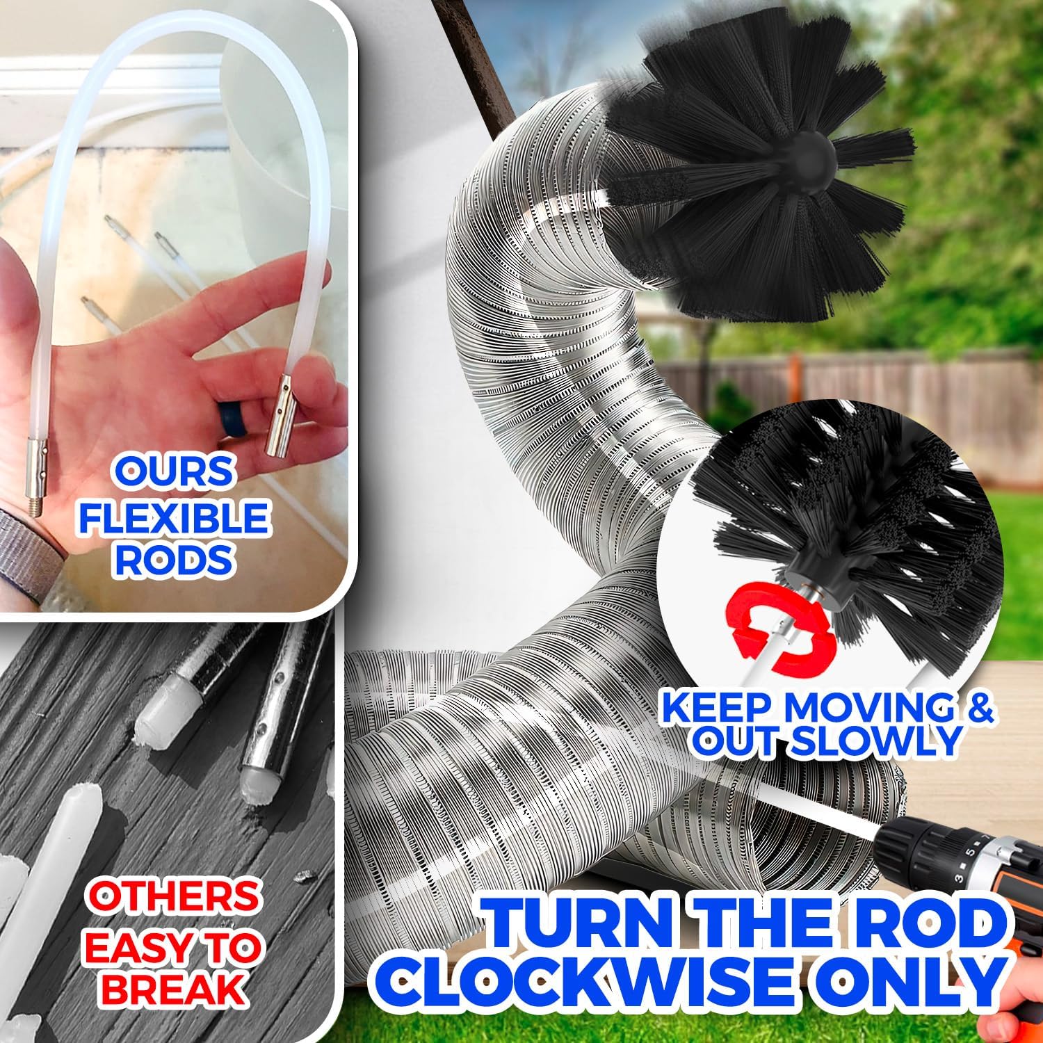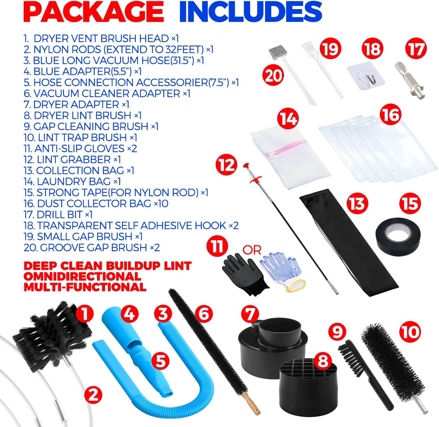 About this itemnCOMPREHENSIVE DRYER VENT CLEANER KIT: Premium dryer cleaning set will help you deep clean buildup lint in the dryer; Includes Dryer Vent Brush Set ×1,Dryer Lint Vacuum Attachment ×1,Dry Lint Brush ×1,Lint Trap Brush ×1,Vacuum Cleaner Adapter x1,Dryer Adapter x1, Lint Grabber x1,Collection Bag x1,Anti-Slip Gloves x1,Strong Tape(for nylon rod) x1, Dust Collector Bag x1nDRYER VENT CLEANING BRUSH: Dryer vent cleaner kit can be used with or without any kind of power drill and will help you achieve professional results; Just always turn the rod clockwise and keep moving in&out slowly; Kindly remind that while cleaning around corners and turns or stubborn lint trap, slow down and then accelerate slowlynDRYER LINT VACUUM ATTACHMENT: Handy vacuum hose attachment measures over 3.5 feet long to reach deep into difficult places, perfect for cleaning behind appliances beyond your reach; NOTICE: It suitable for most vacuum, but not fit for Dy-son and cordless vacuum cleanersnMULTIFUNCTIONAL CLEANING KIT: The goal of this kit is to achieve a complete cleaning of the dryer; Except several large tools, small products also play an irreplaceable role; Lint trap brush is better for the tight place,strong tape can reinforce the connection of rods, lint grippers clean deeper and remove stubborn dirt or fluff, anti-slip gloves protect your hands during the cleaning process, collection bag stores these toolsnPREVENTING FIRE RISKS: Lint buildup can be dangerous and failure to clean it is the leading cause of clothes dryer fires; So remove the lint periodically is the only way to prevent dryer fires risk