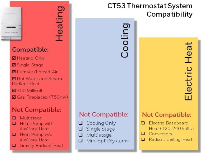 About this itemnPrecise temperature control with a temperature range of 50°90°F.nBimetal temperature sensor offers simple and hassle-free operation.nThe included mounting hardware, and quick install guide can have your thermostat up and running quickly.nThermostat includes integrated thermometer.nMercury free.nCOMPATIBLE WITH: 750 Millivolt heating systems including gas fireplaces, steam and gravity systems.nNOT Compatible with: electric baseboard heat, heat pump systems, or multi-stage heating/cooling systems.nFor heat systems only.n See more product details